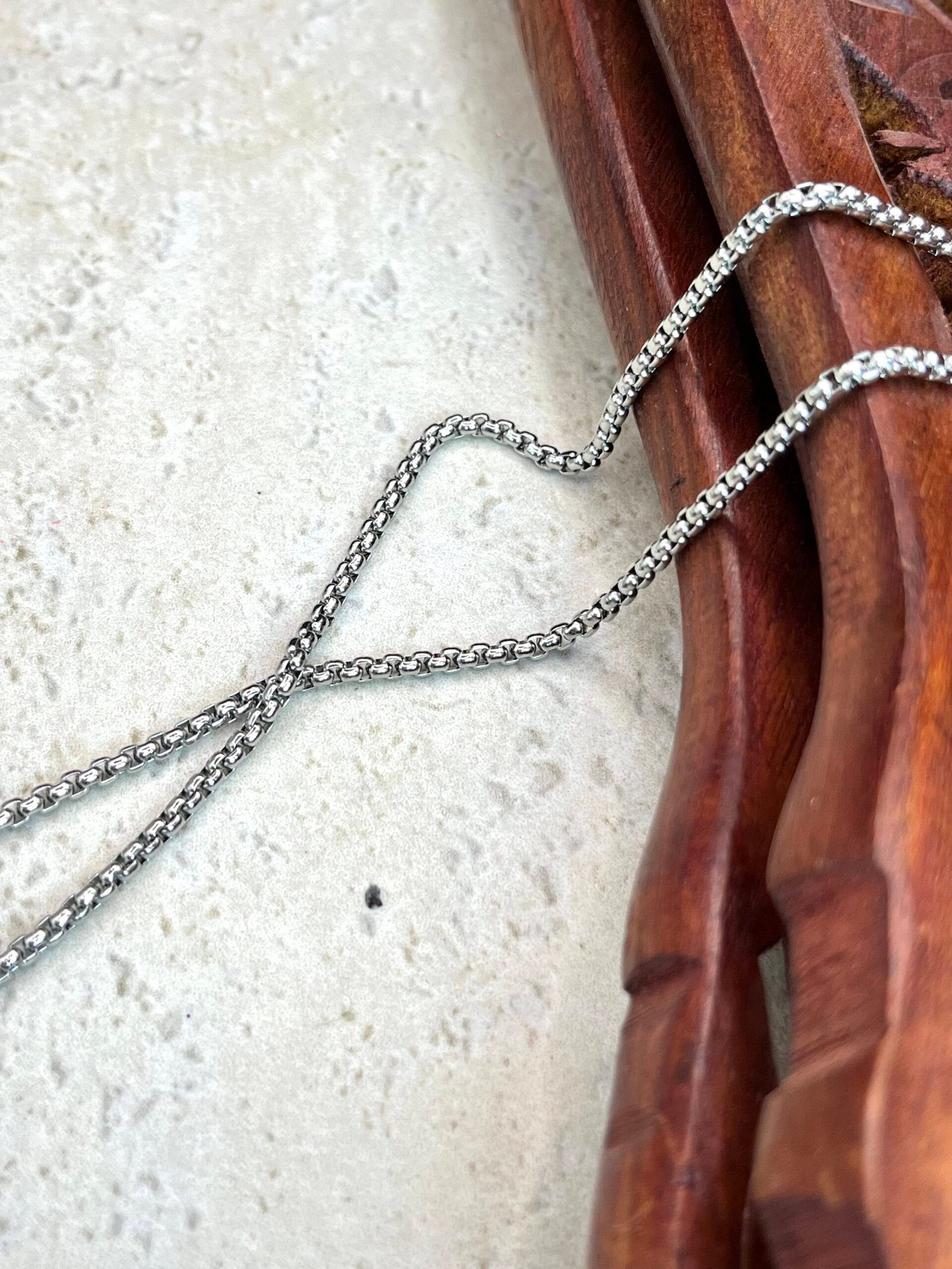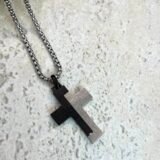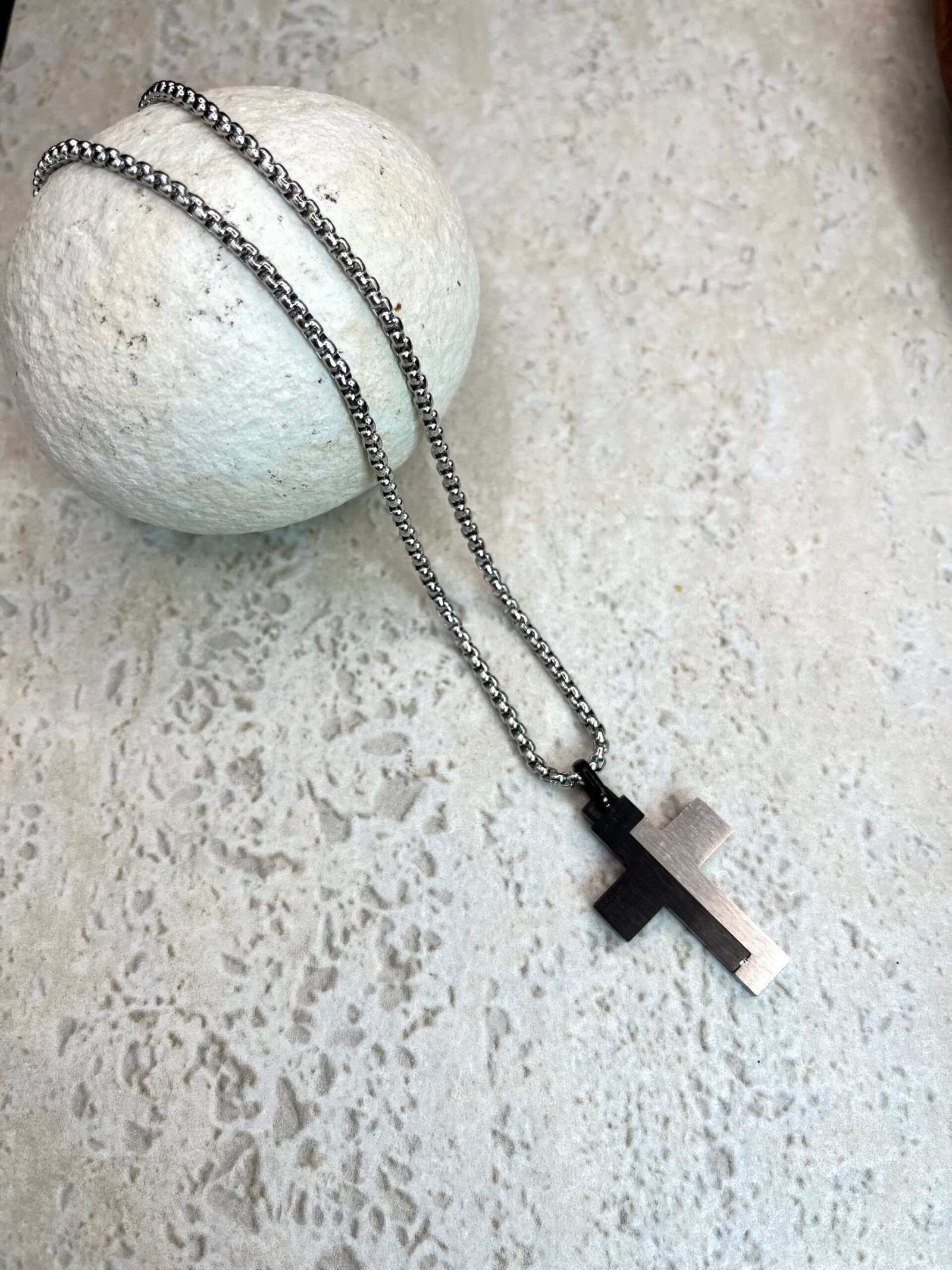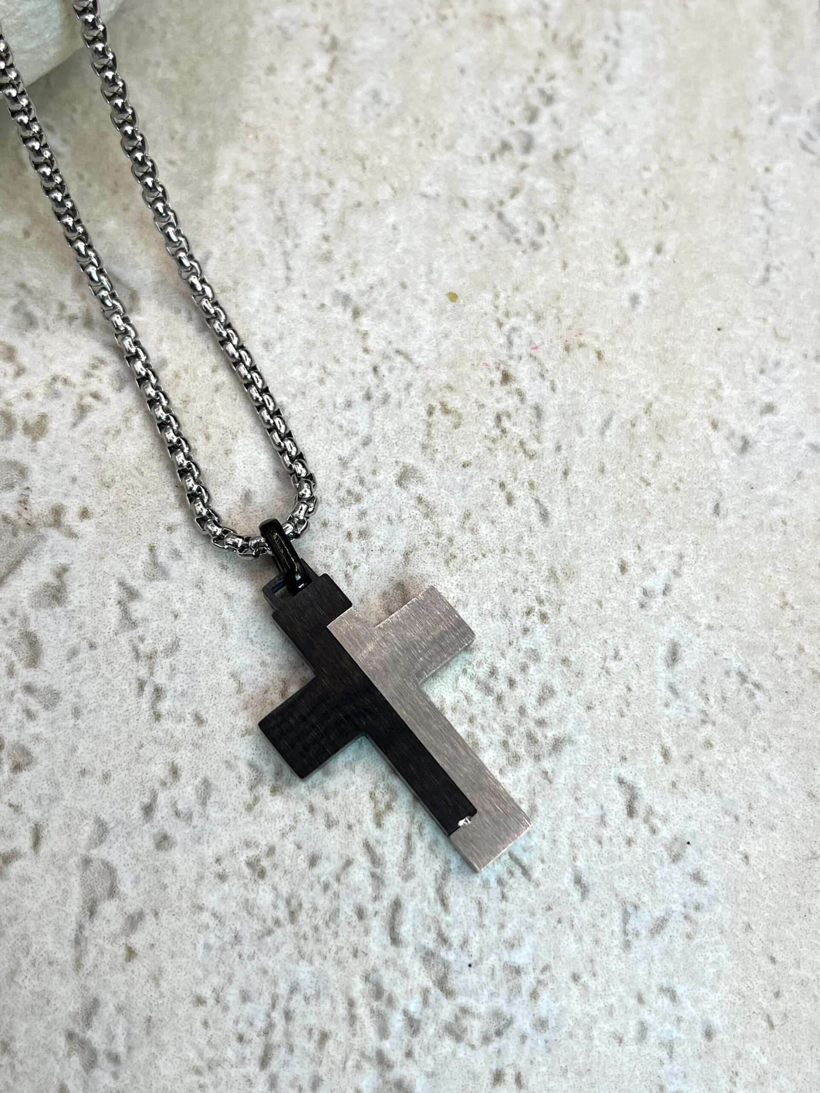 Ατσάλινος σταυρός με ιδιαίτερο σατινέ σχέδιο ασημί και μαύρου χρώματος, σε αλυσίδα με πυκνή πλέξη. Διαθέτει προέκταση.
