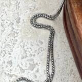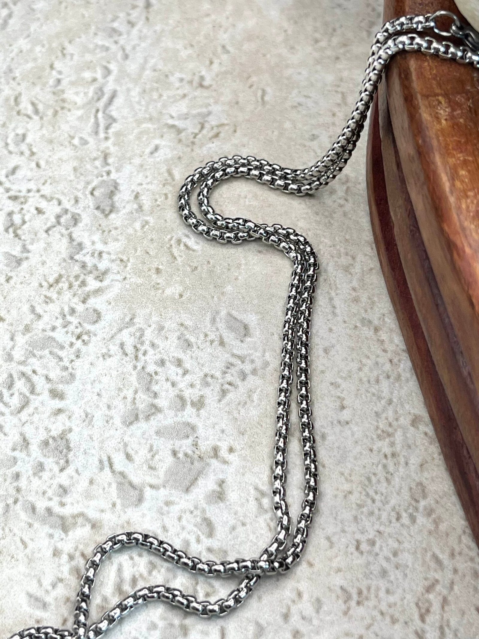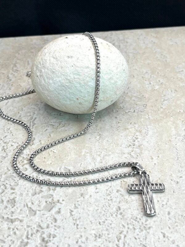 Ατσάλινος σταυρός με ιδιαίτερο ανάγλυφο σχέδιο, σε αλυσίδα με πυκνή πλέξη. Διαθέτει προέκταση.