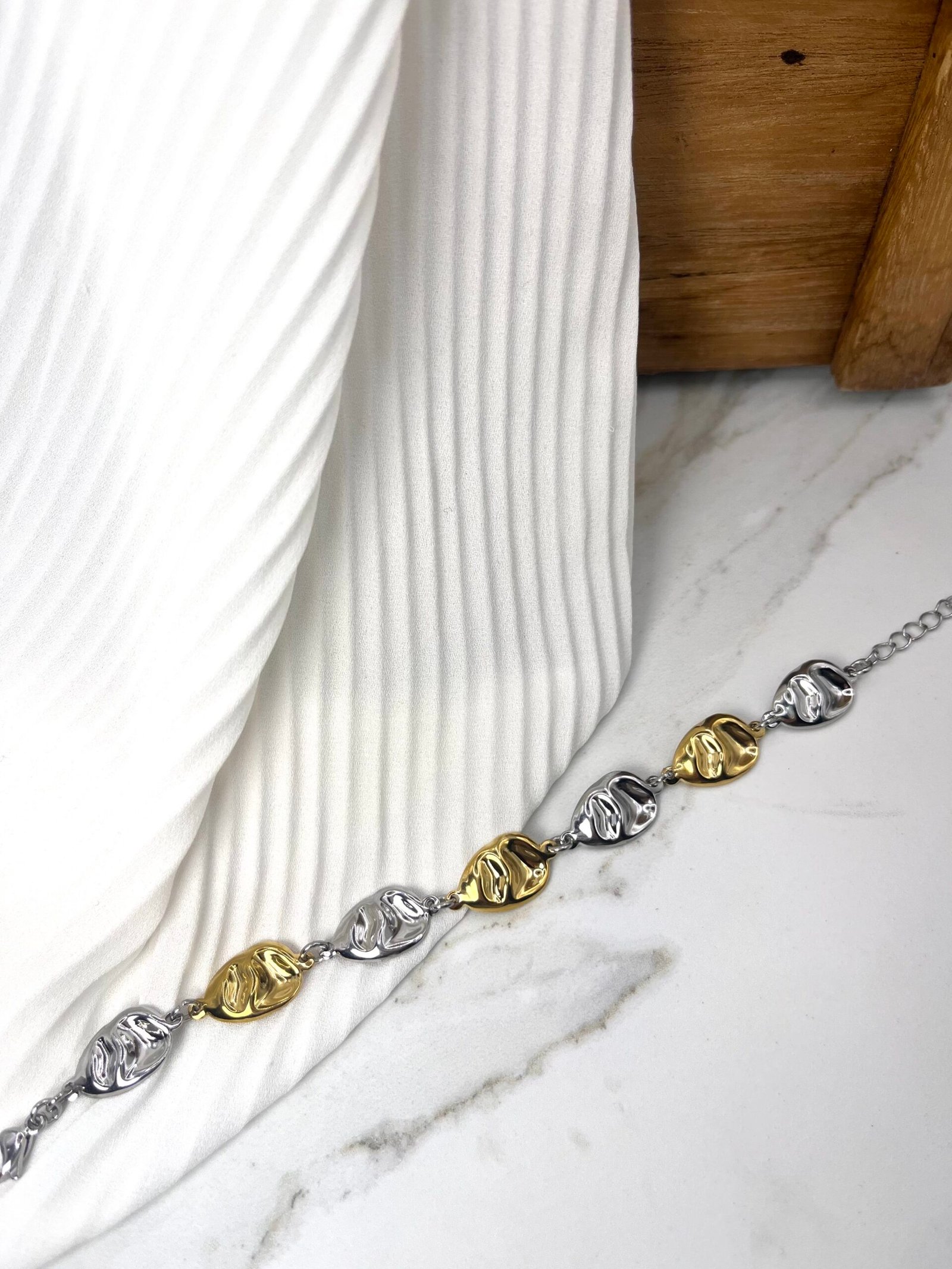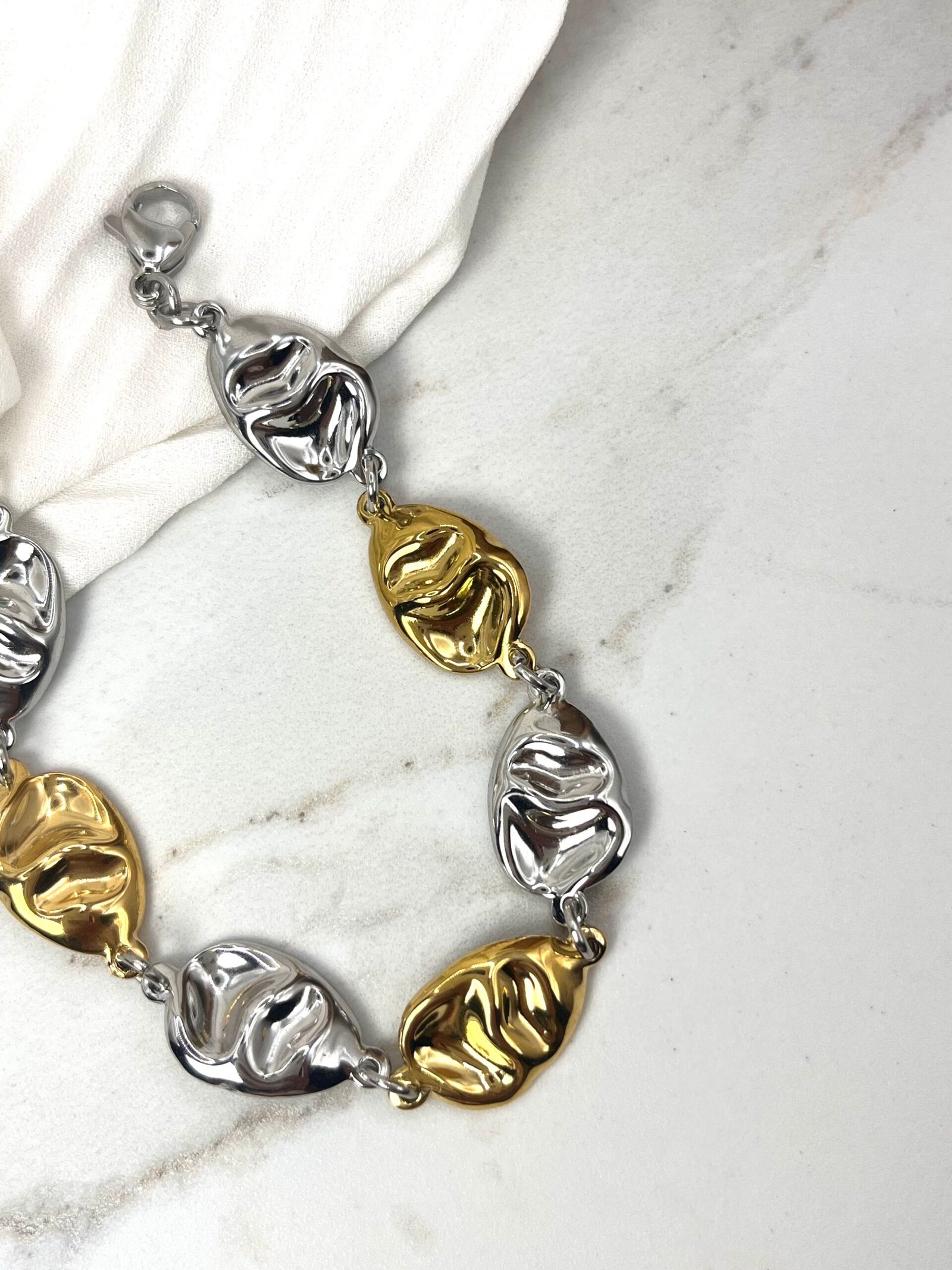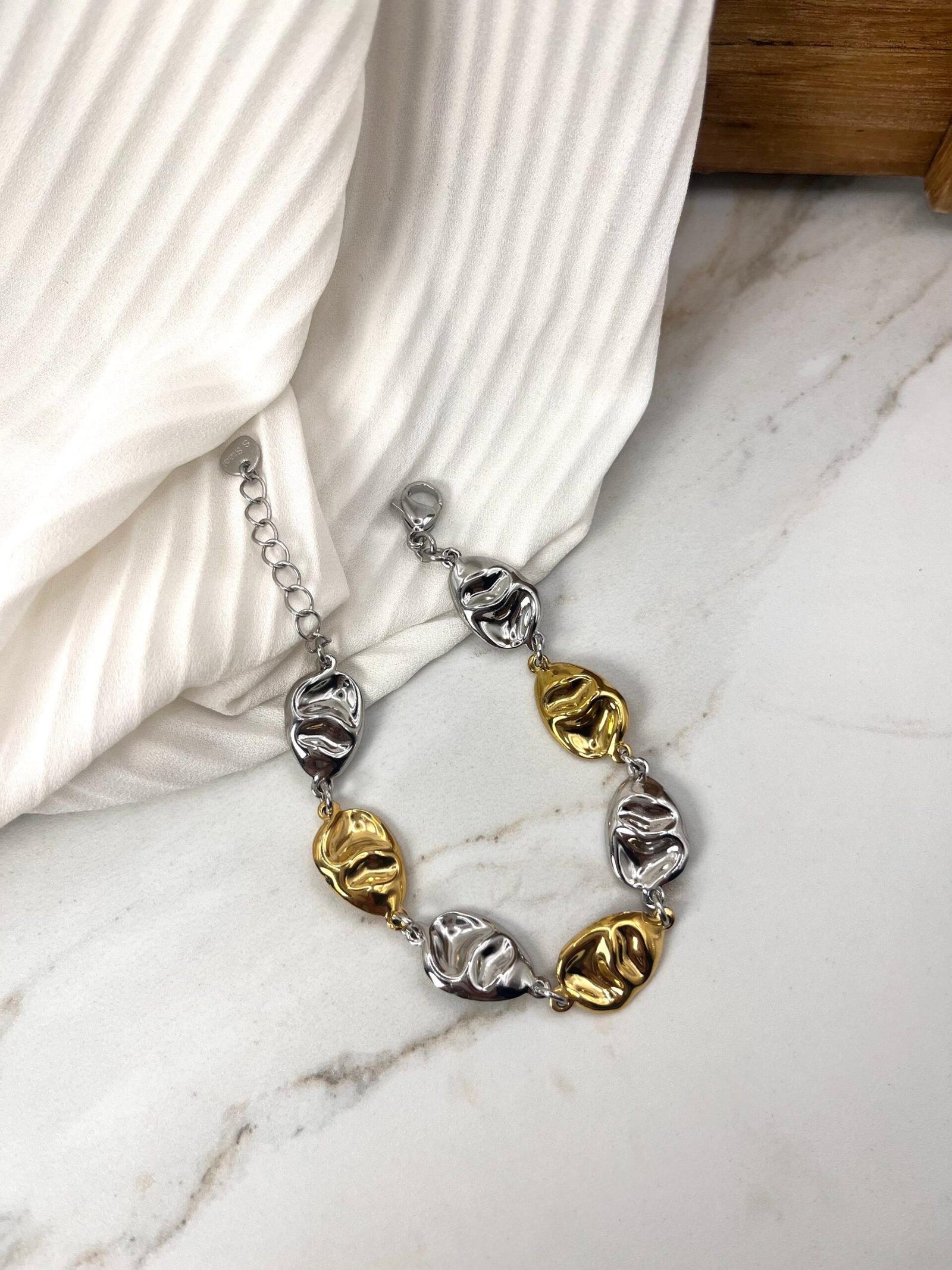 Δίχρωμο βραχιόλι από ανοξείδωτο ατσάλι με ιδιαίτερο σχήμα και υφή.