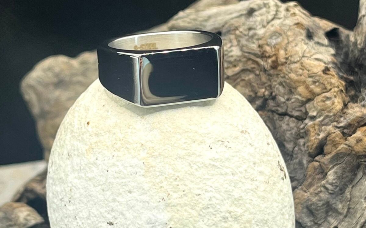 Ατσάλινο δαχτυλίδι με παραλληλόγραμη επιφάνεια, σε σατινέ ασημί χρώμα.