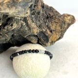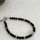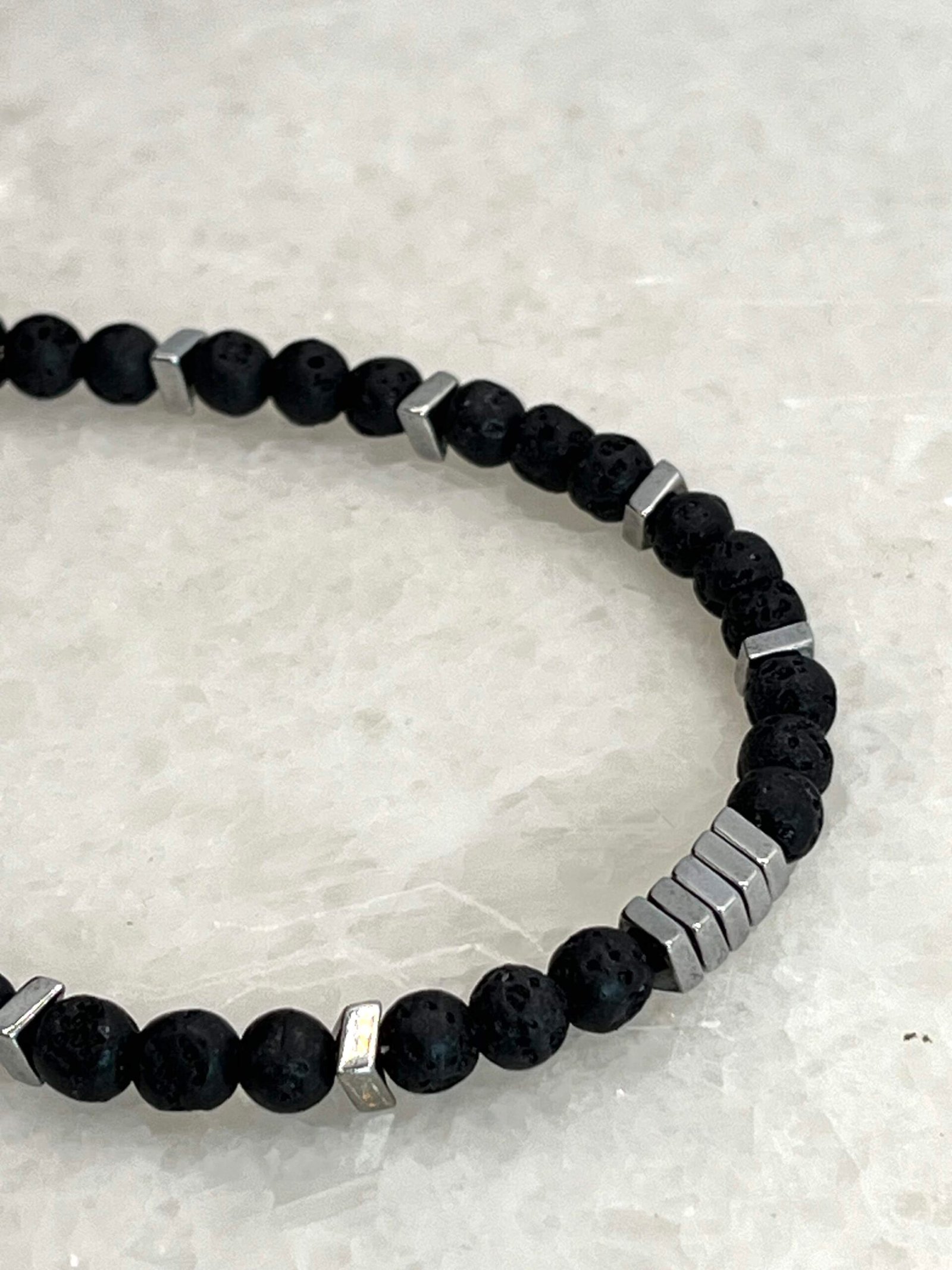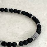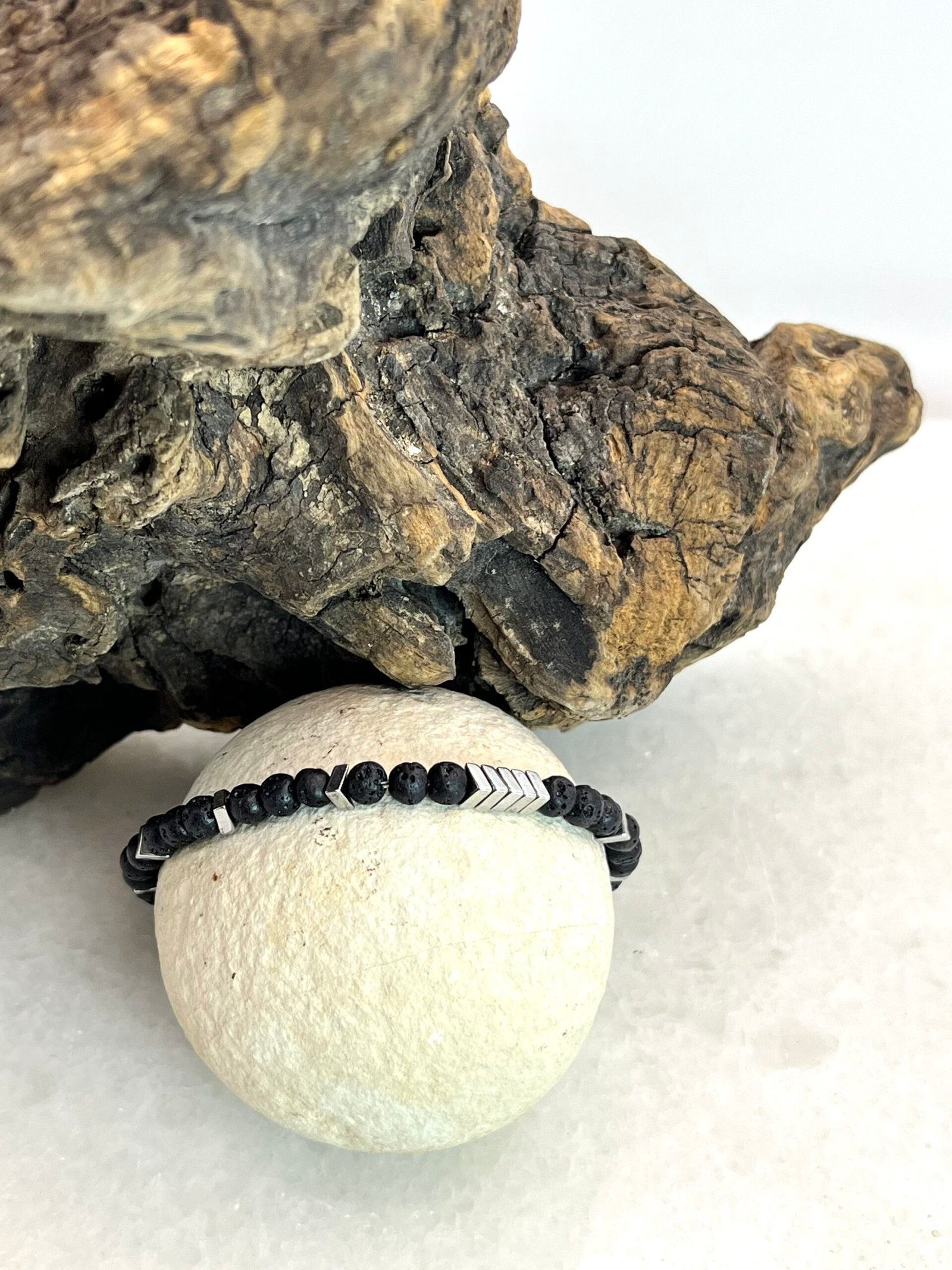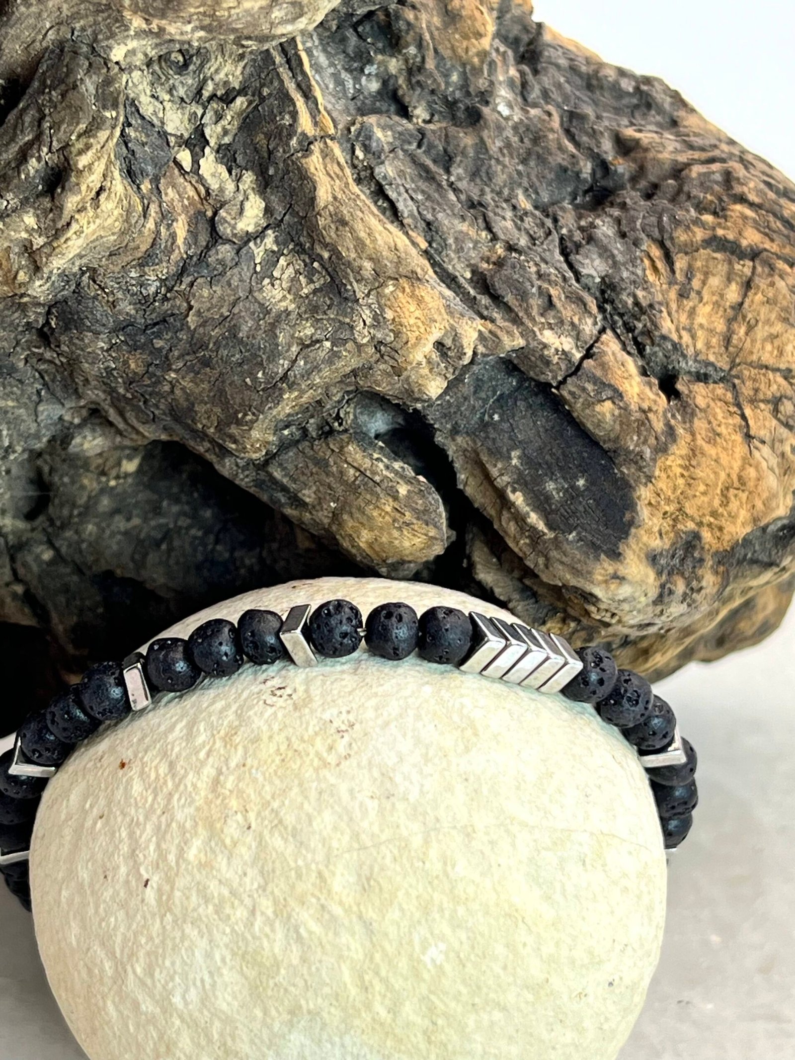 Βραχιόλι με χάντρες λάβα ηφαιστείου, διαχωριστικές ατσάλινες λεπτομέρειες και κεντρικό στοιχείο ατσάλινες πλάκες. Διαθέτει προέκταση.