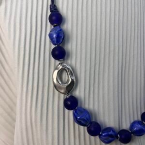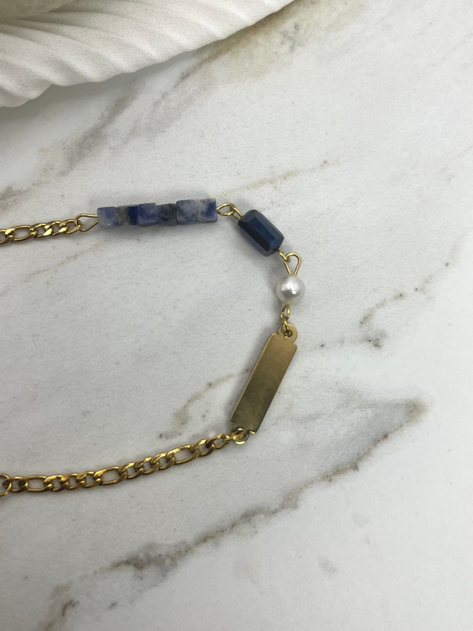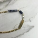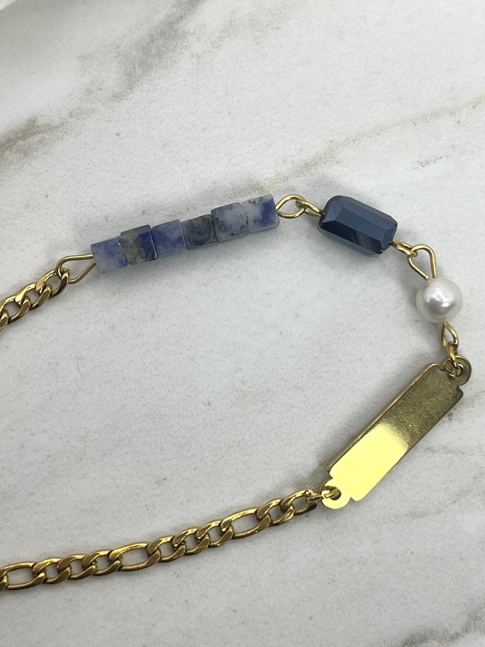 Ατσάλινο βραχιόλι με ένα μαργαριτάρι καλλιεργημένο και πέτρες σε σχήμα κύβου από αχάτη με κεντρικό στοιχείο παραλληλόγραμη ταυτότητα από ατσάλι (2×0,5cm)