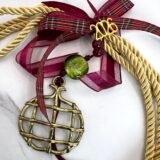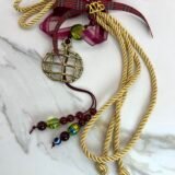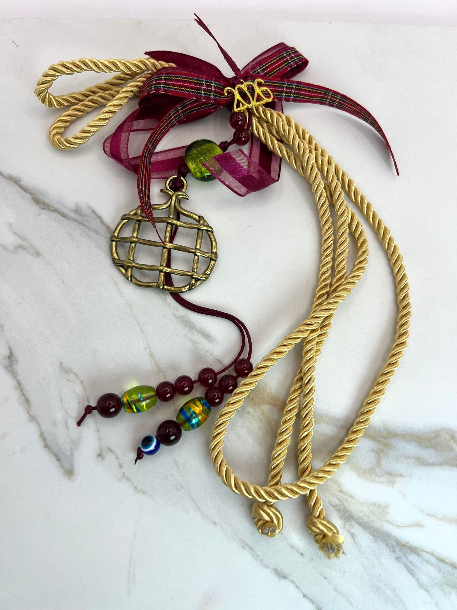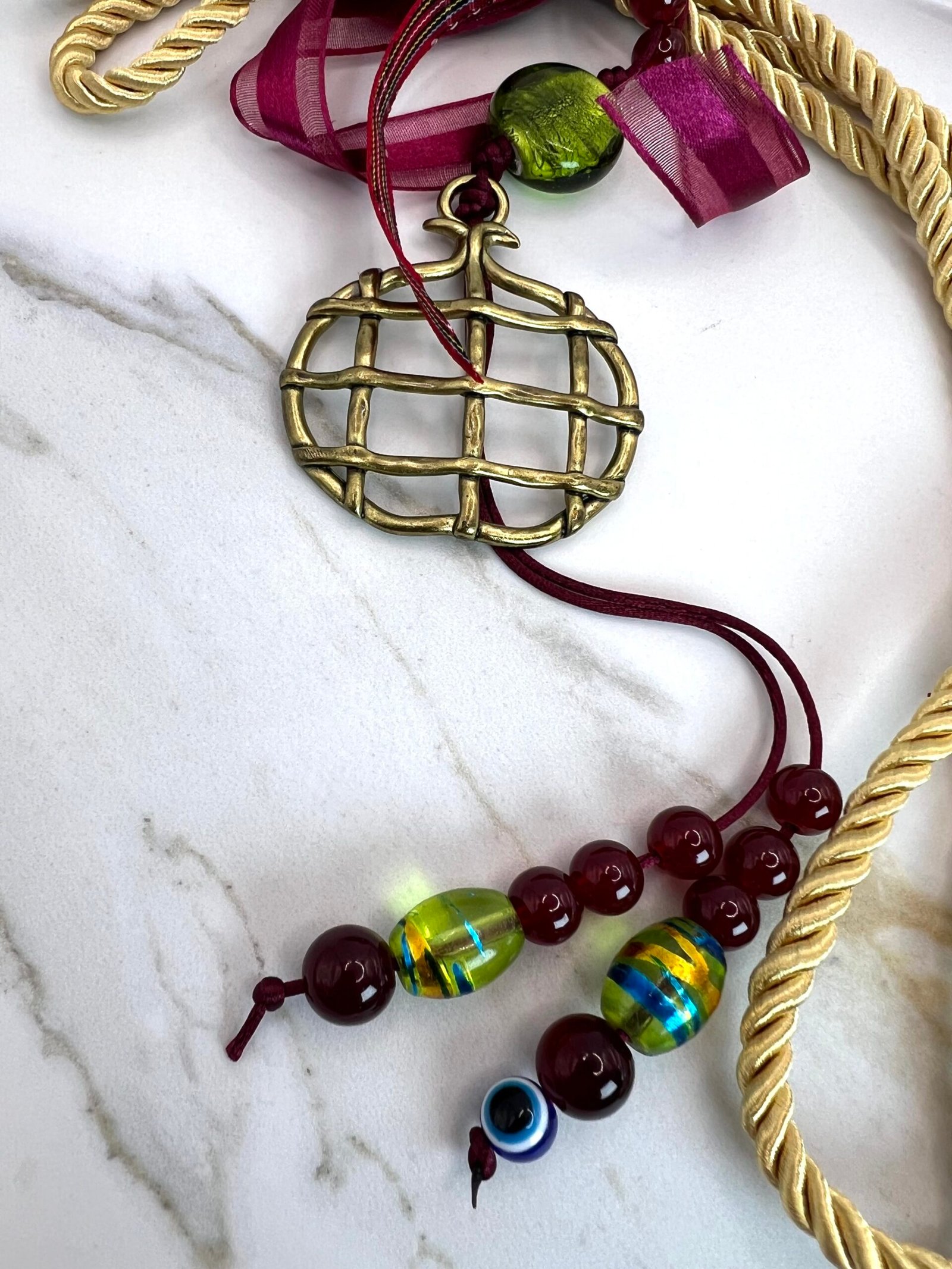 Αντικέ Ρόδι (5x6cm) δεμένο με γορδόνι μπεζ χρυσό 0,5cm, κεντρική χάντρα κρύσταλλο πράσινο (2cm), καρώ κορδέλα και διακοσμητικές γυάλινες χάντρες . Συνολικό ύψος 33cm.