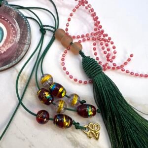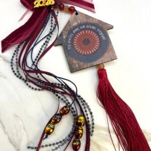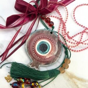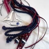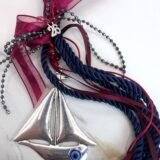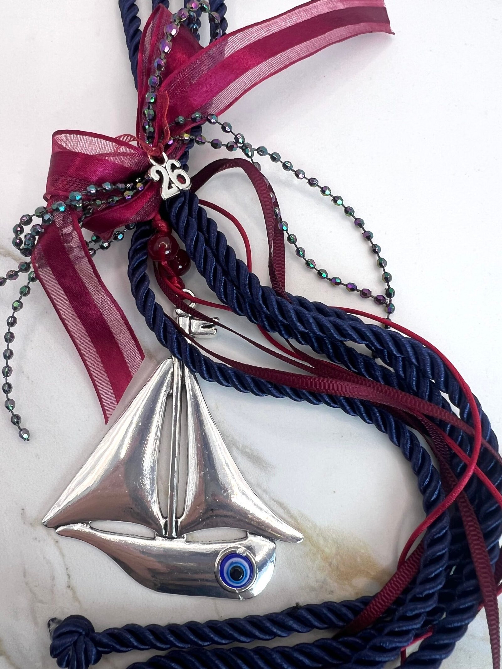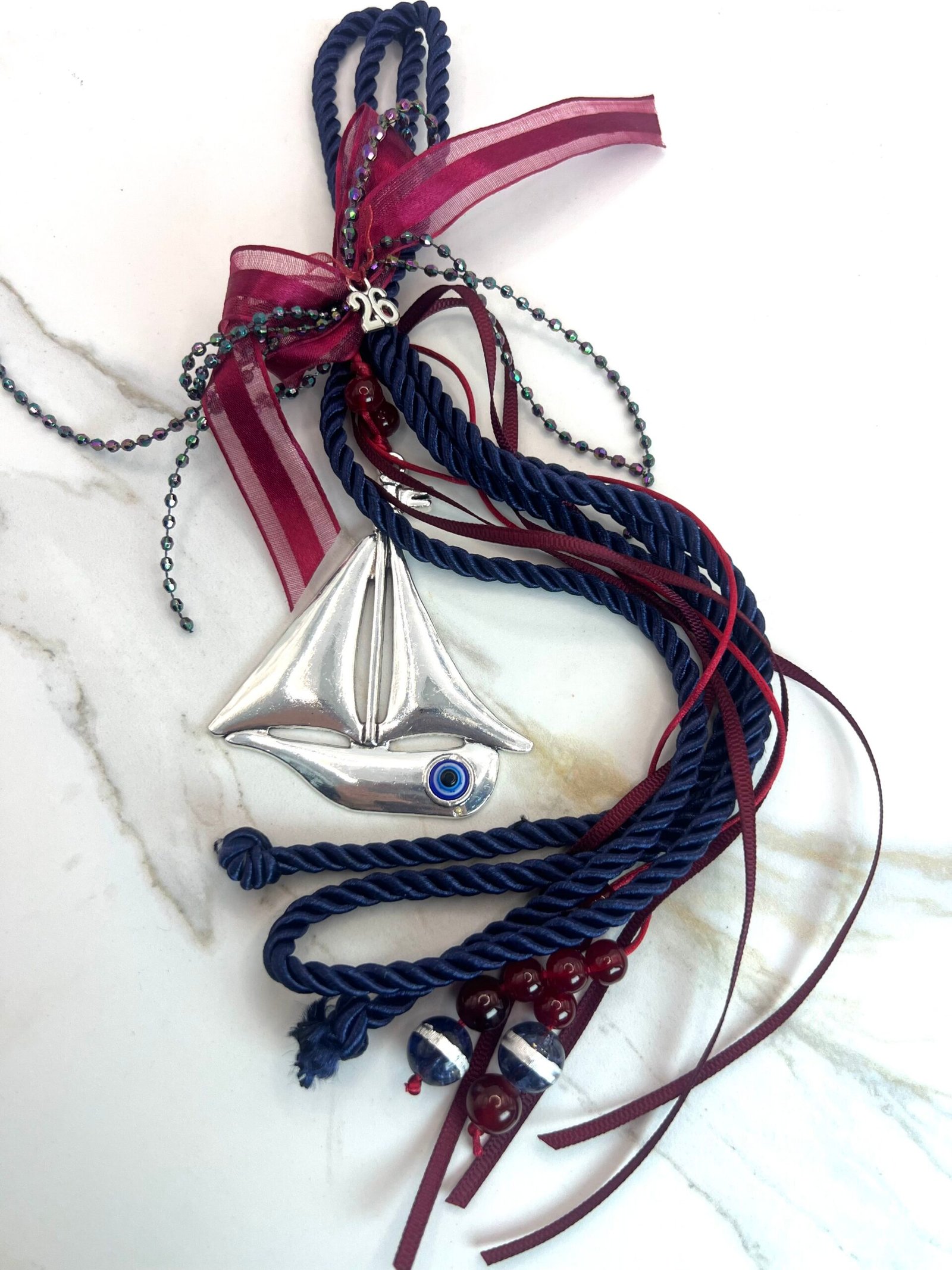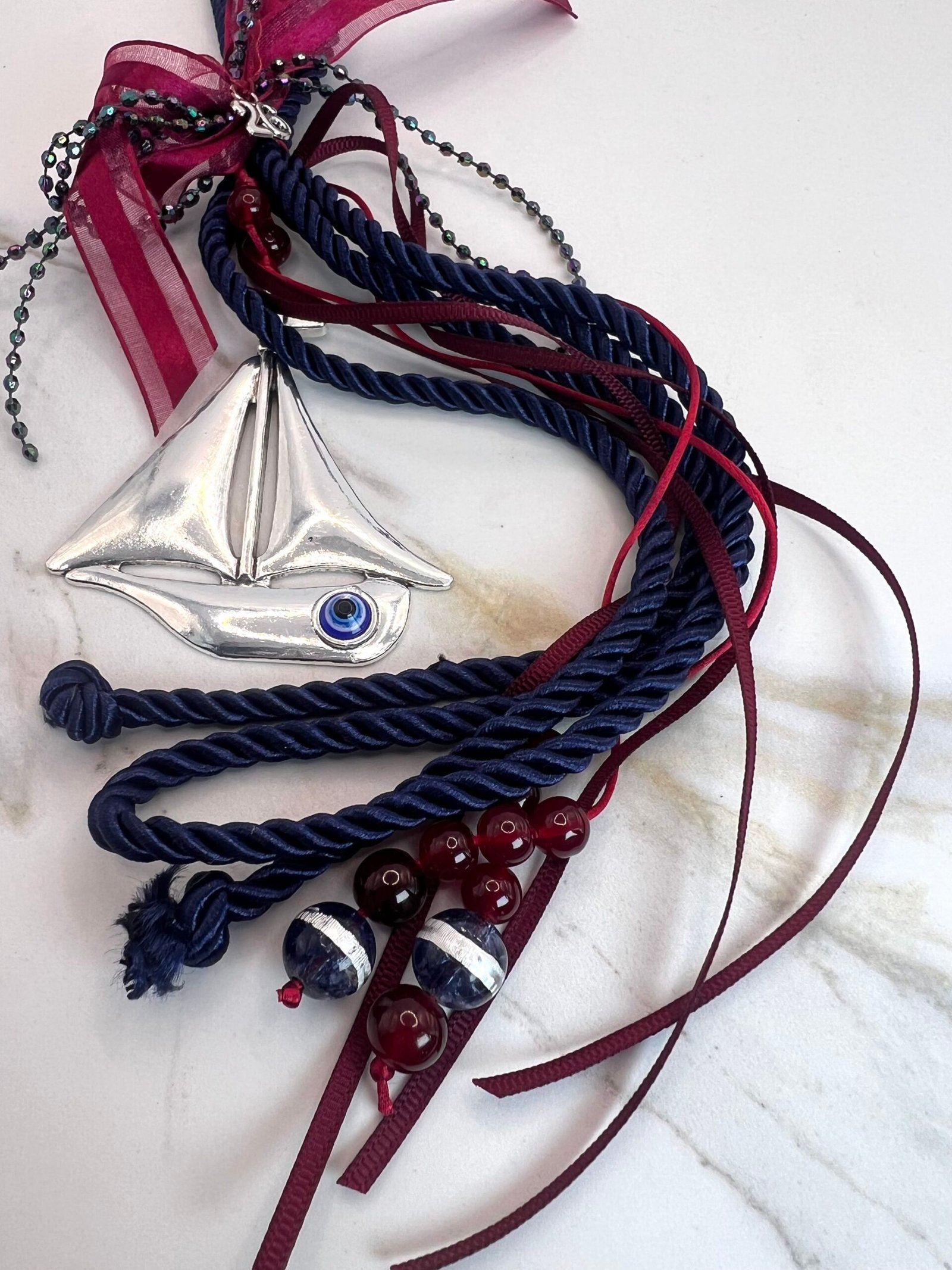 Γούρι με κεντρικό στοιχείο επάργυρο καράβι (8x7cm) με διακρητικό μάτι, δεμένο με τετραπλό γορδόνι 0,5cm, στολισμένο με γυάλινες χάντρες, σατέν κορδέλες και κορδέλες από μικρά κρυσταλλάκια. Μήκος 33cm.