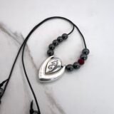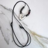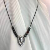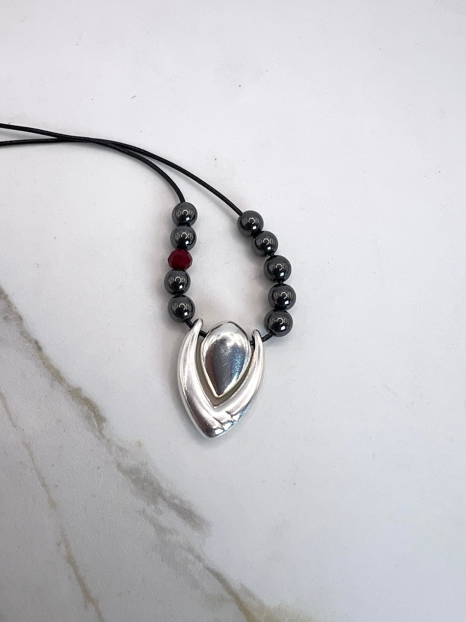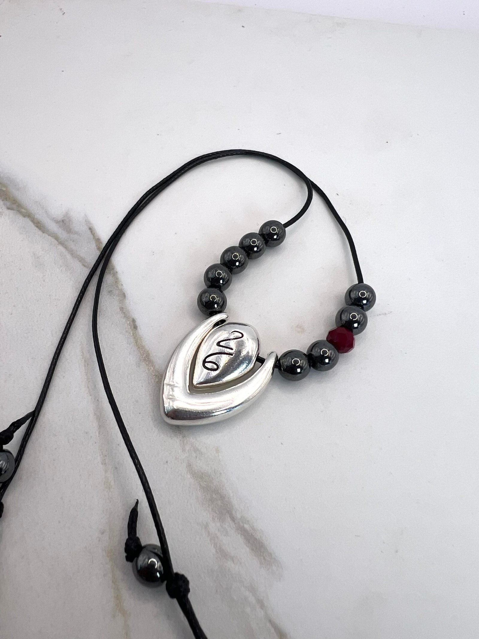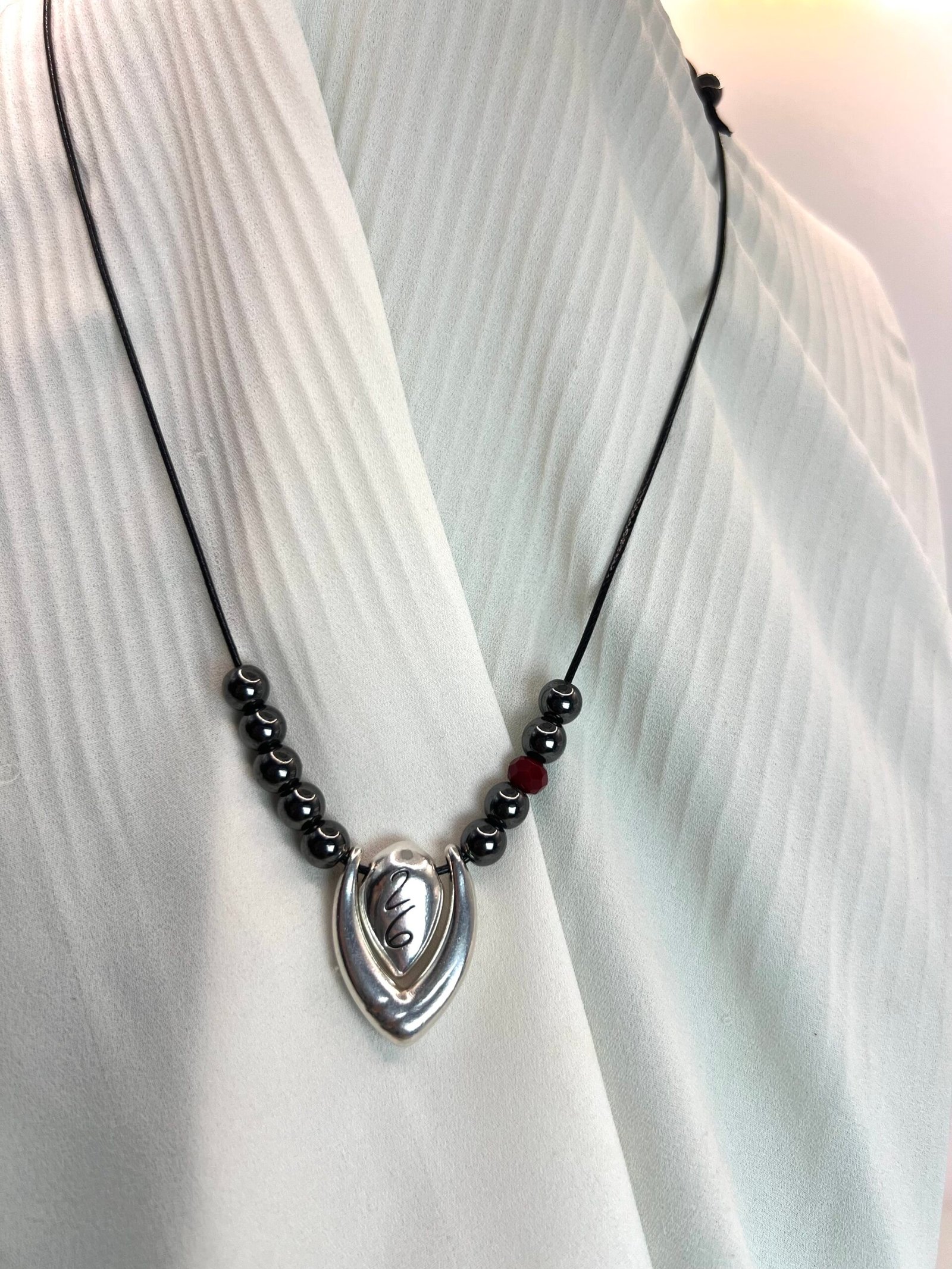 Κολιέ γούρι με επάργυρο στοιχείο ¨26¨, δύο όψεων, με χάντρες αιματίτη. Αυξομειούμενο μήκος 60cm.