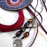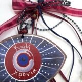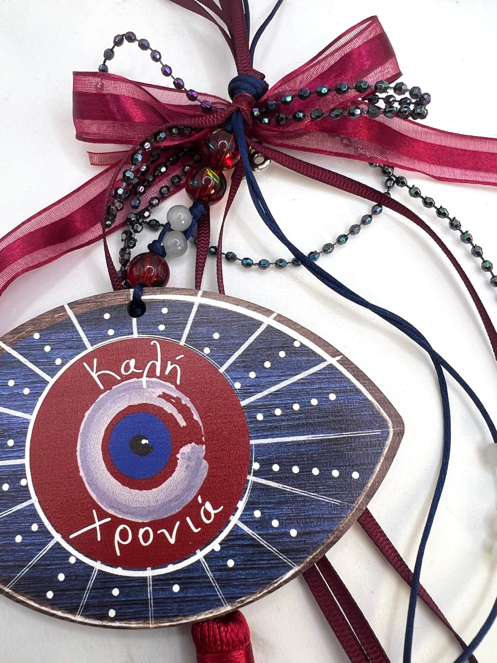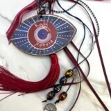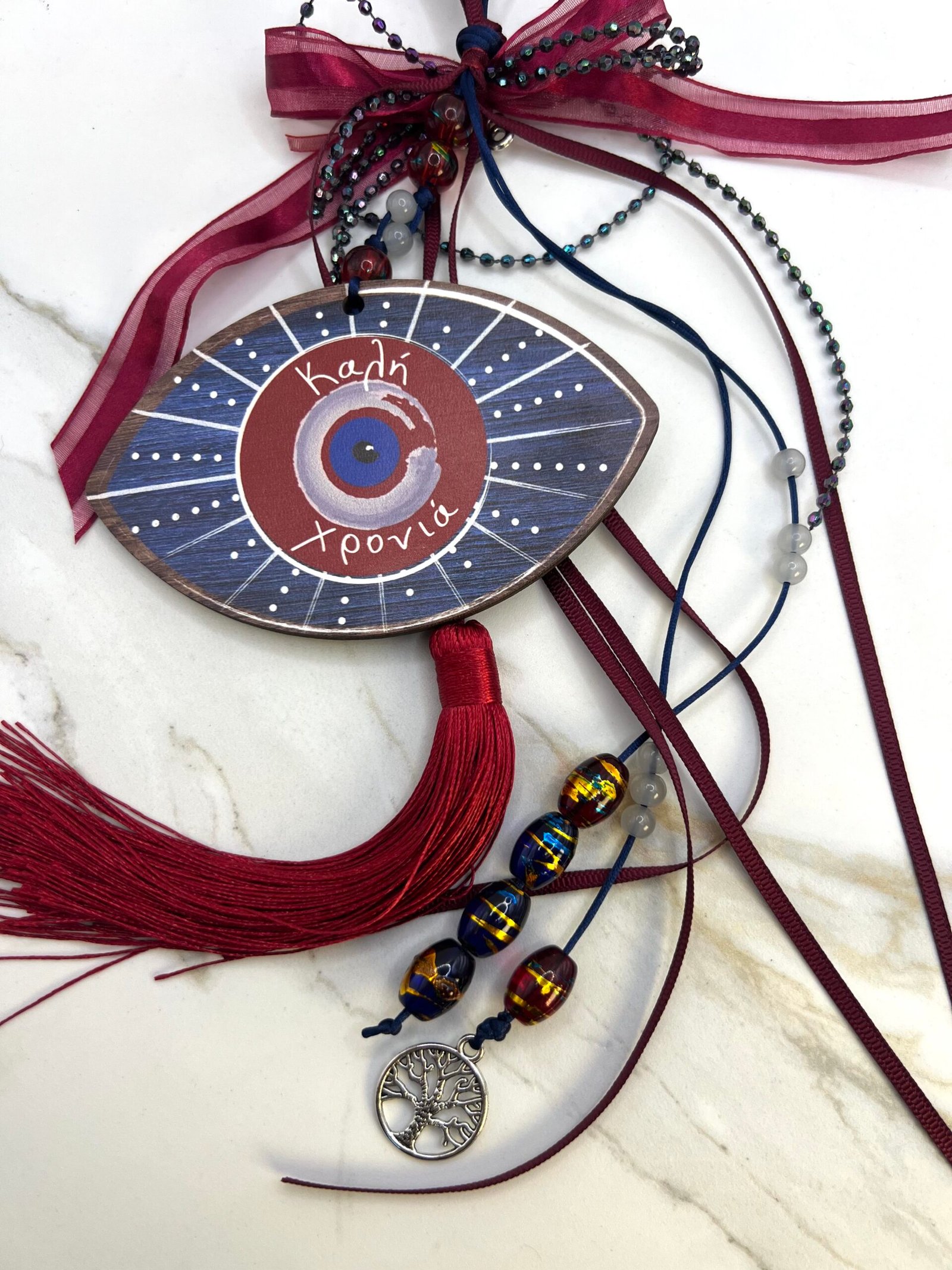 Ξύλινο μάτι (11x7cm) με επιπλέον στολίδι, το δέντρο της ζωής (1,5×1,5cm). Διακόσμηση με γυάλινες χάντρες, γορδόνια σατέν ,φιόγκος σατέν και οργάντζα και γορδόνι από μικρά κρυσταλλάκια. Συνολικό μήκος 35cm (φούντα 12cm)