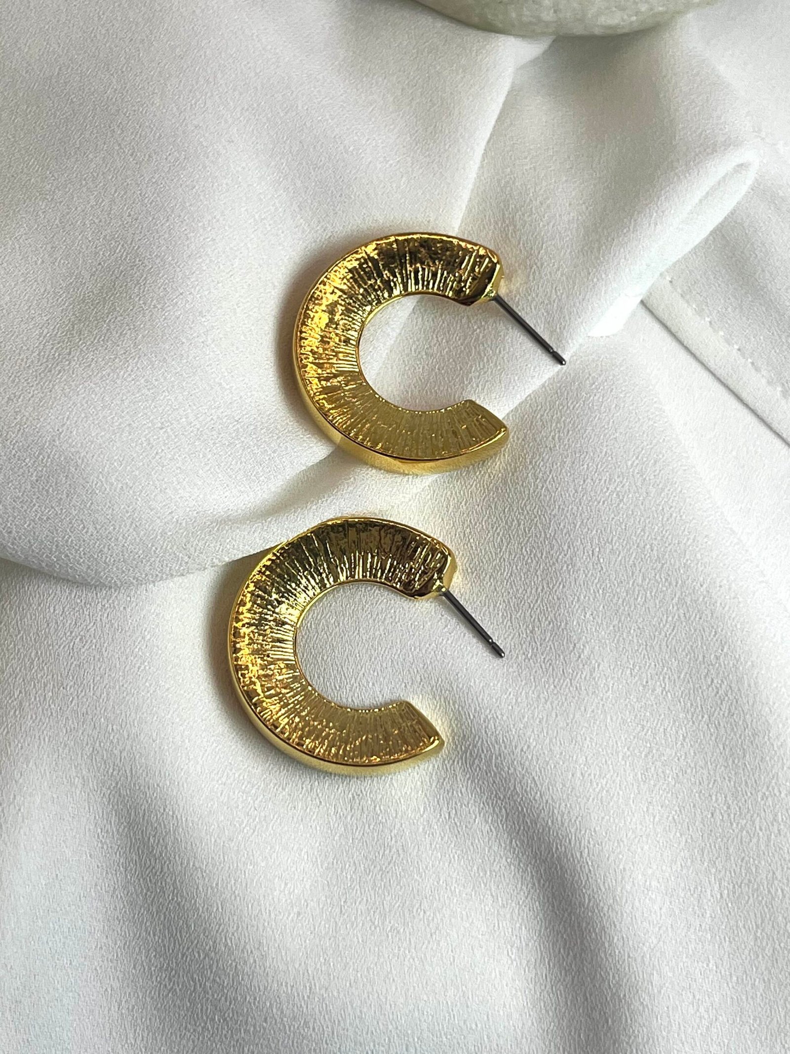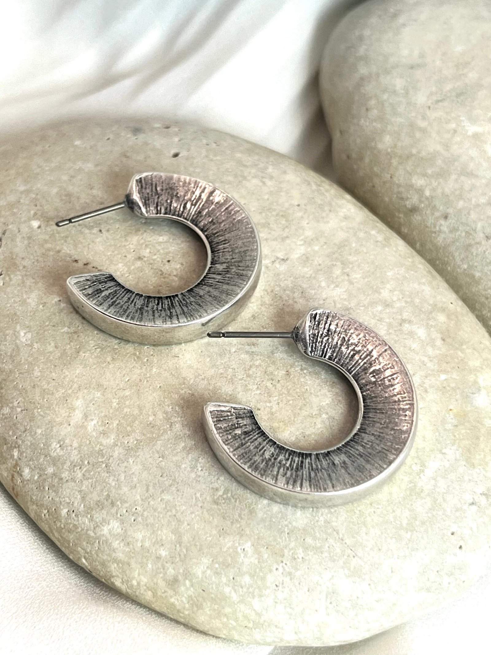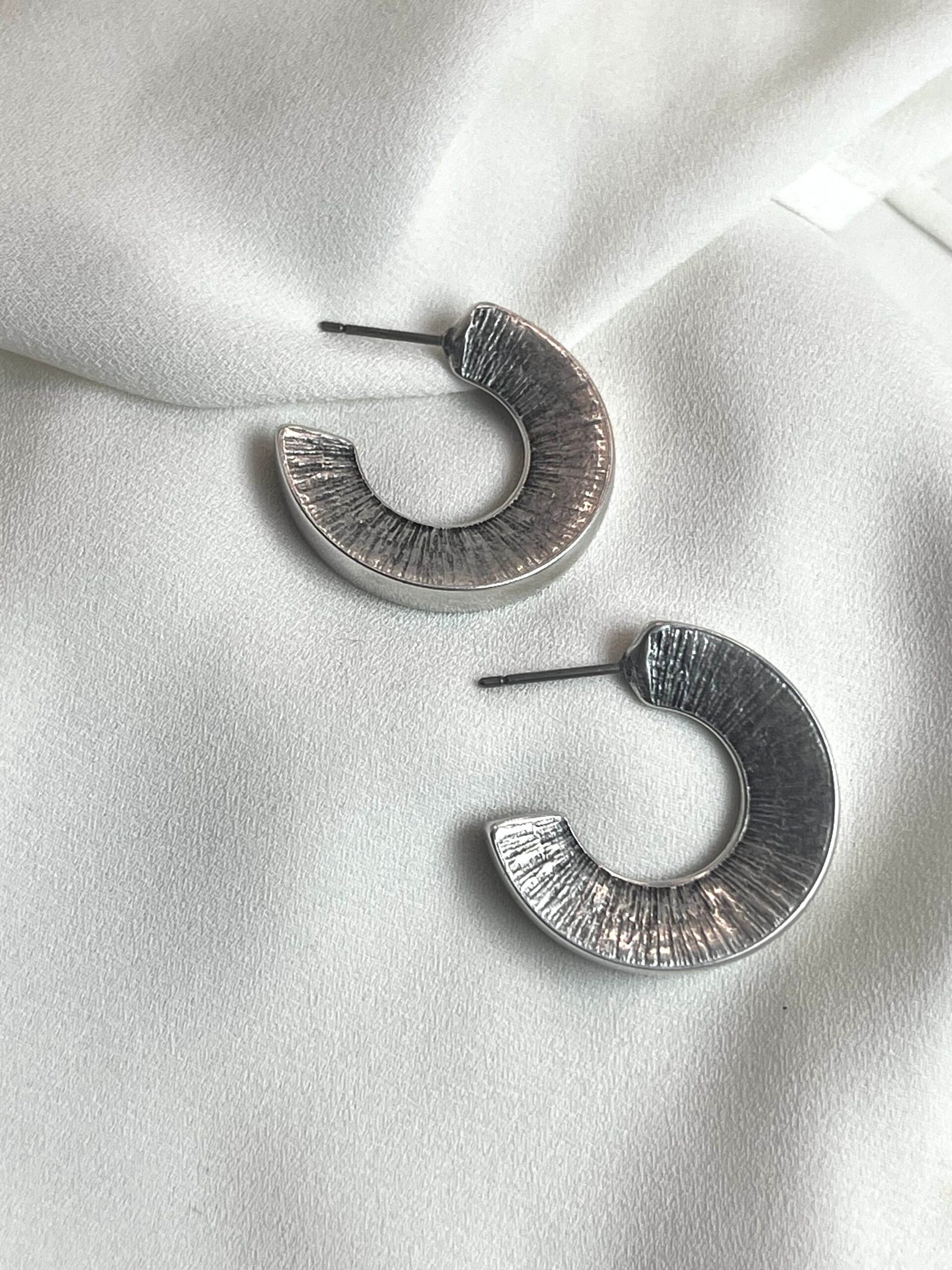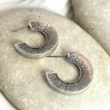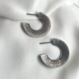 Καρφωτό στρογγυλό σκουλαρίκι με χαρακτηριστική υφή. Επάργυρο ή επίχρυσο, σφυρίλατο με καρφί τιτανίου.