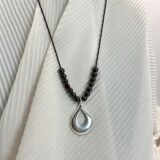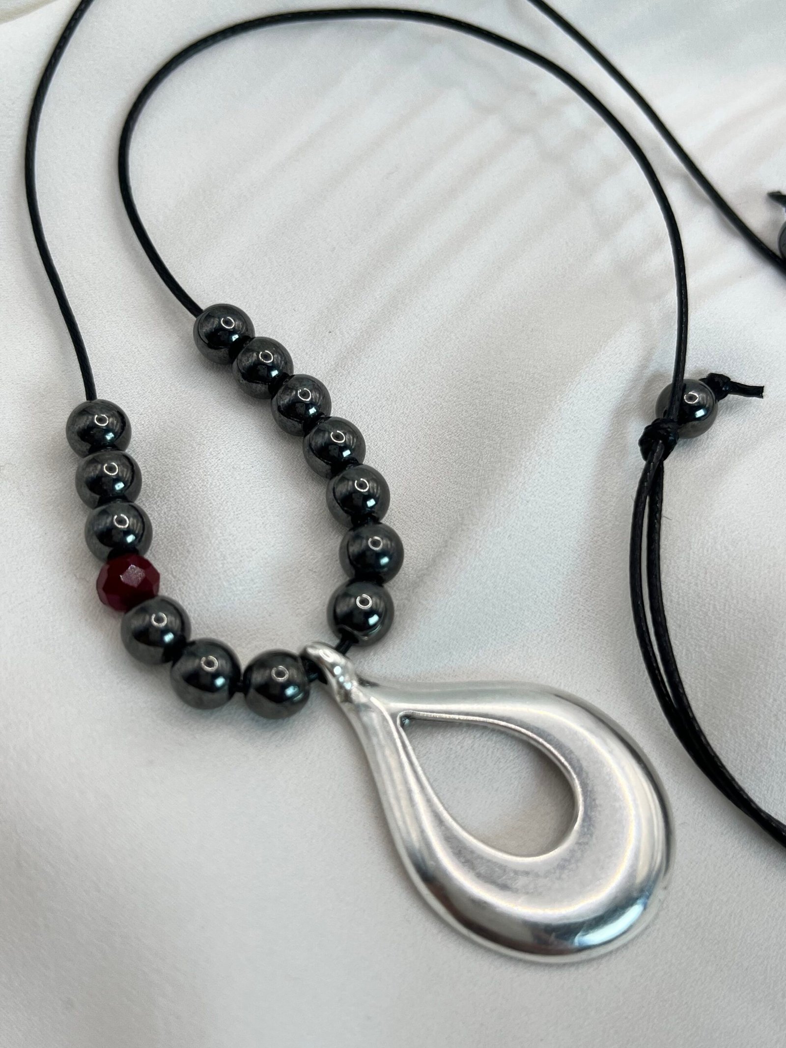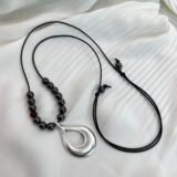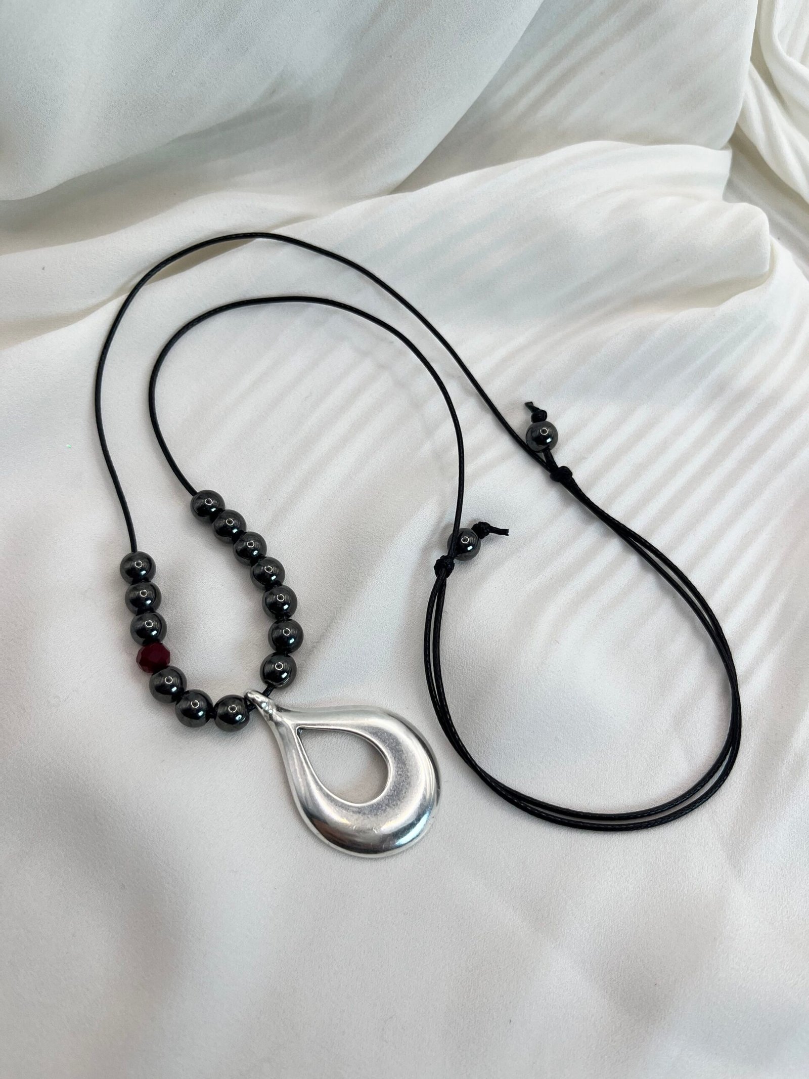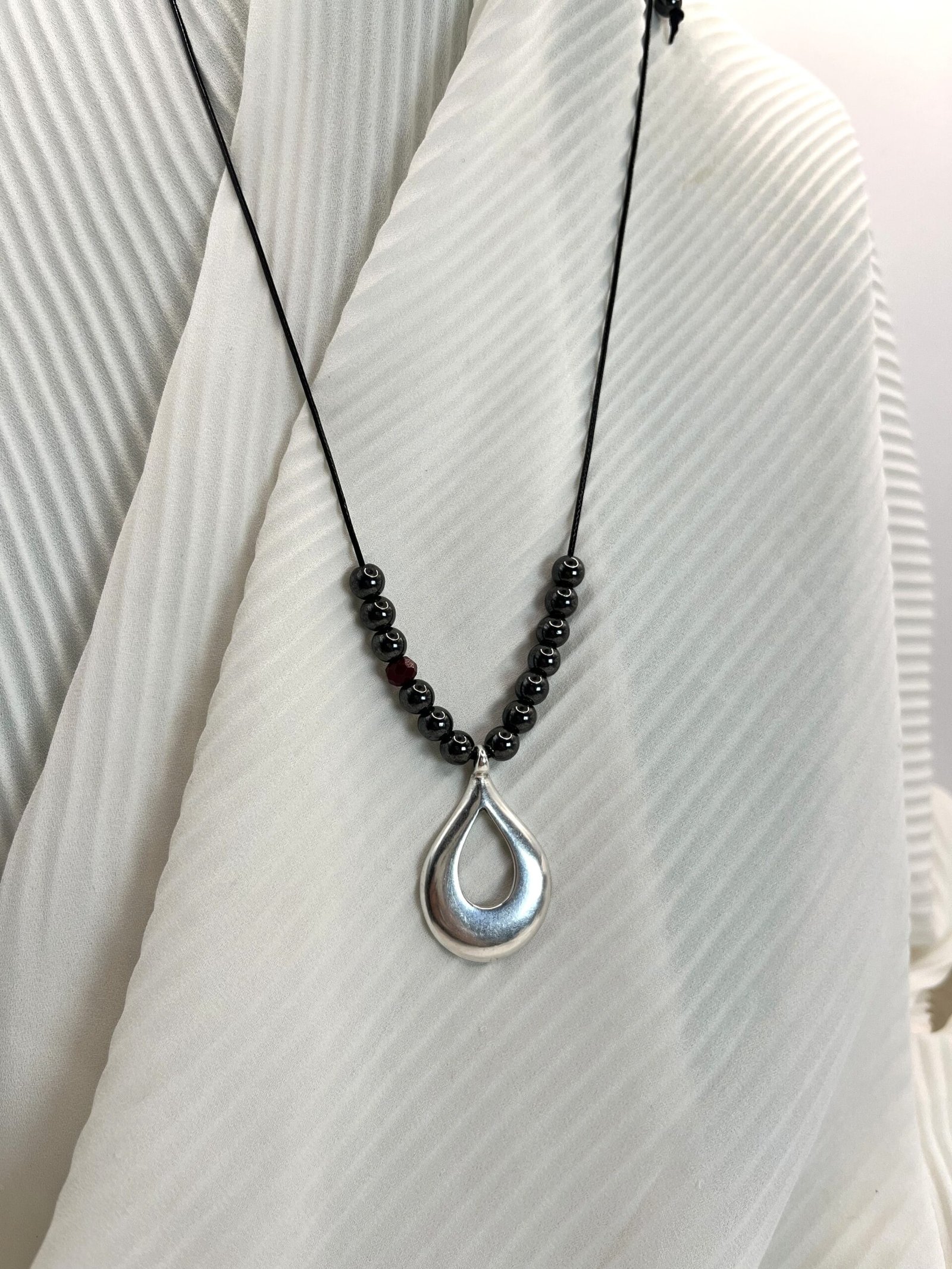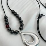 Κολιέ με μαύρο γορδόνι αυξομείωσης, χάντρες αιματίτη και κρυστάλλινες λεπτομέρεις (0,6cm). Κεντρικό επάργυρο στοιχείο σε ιδιαίτερο σχήμα (4×2,5cm)