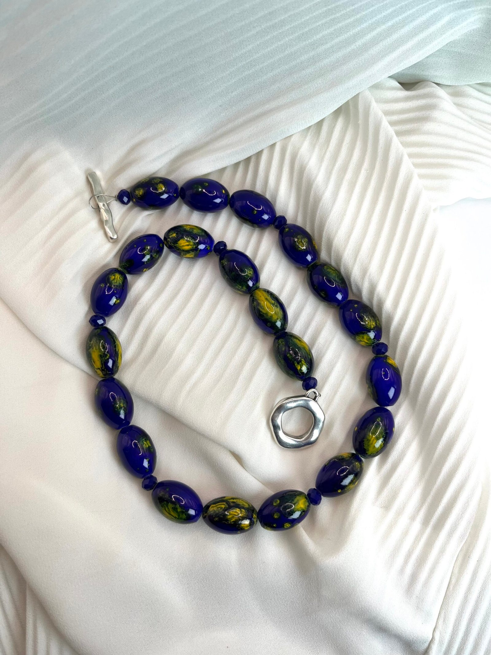 Κοντό κολιέ με οβάλ πορσελάνινες χάντρες, σε ιδιάιτερη απόχρωση (1,8×0,8cm), ατσάλινες χρυσές λεπτομέρειες και κρυστάλλινες μπλε χάντρες. Το κούμπωμα είνα επάργυρο τύπου Τ.