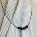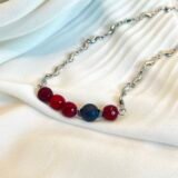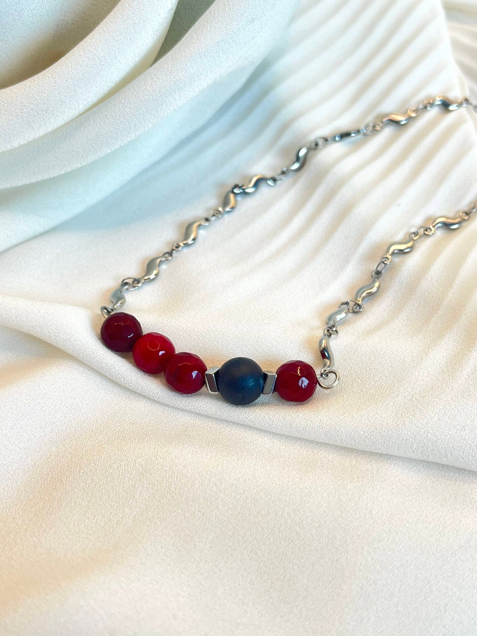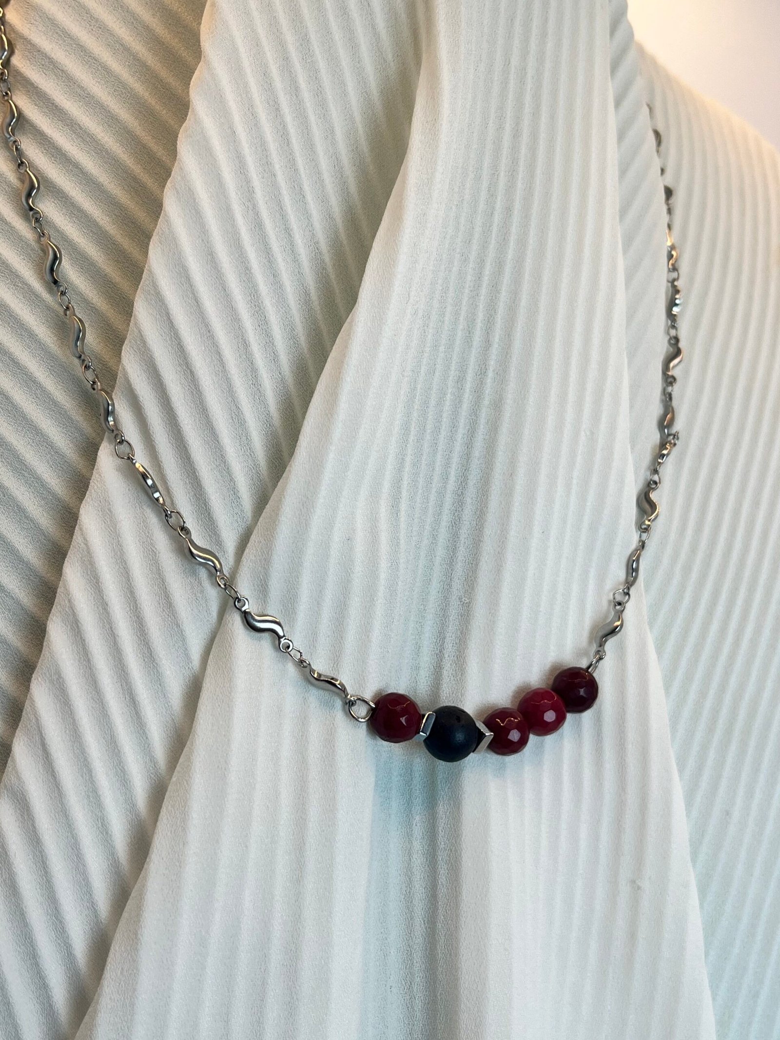 Κολιέ μεσαίου μήκους, με ατσάλινη αλυσίδα. Το κεντρικό στοιχείο είναι λάβα και αχάτης (0,8cm) και ατσάλινες διαχωριστικές λεπτομέρειες.