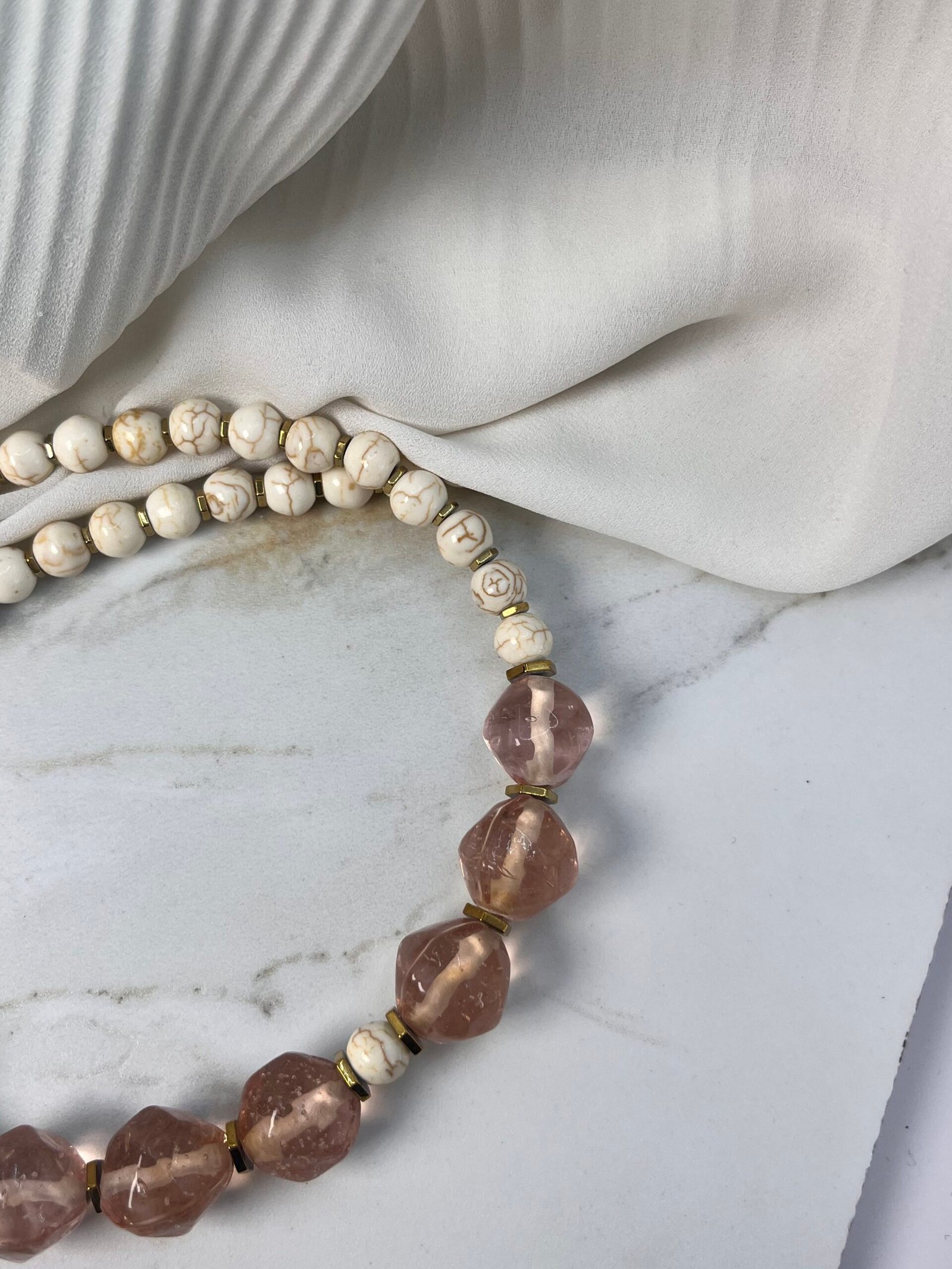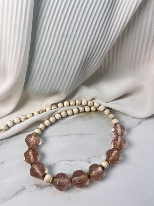 Παραμυθένιο κολιέ με απόλυτα αρμονικές συνθέσεις. Αποτελείται από λευκές πέτρες χαολίτη (0,8cm) , ροζ κρυστάλλινες χάντρες (1,5cm) και ατσάλινες λεπτομέρειες ανάμεσα στα κρύσταλλα σε χρυσή απόχρωση.