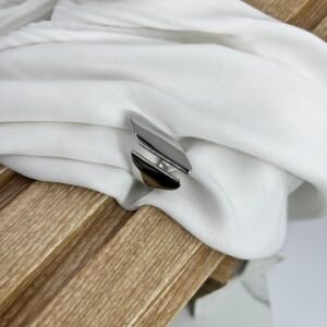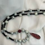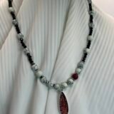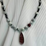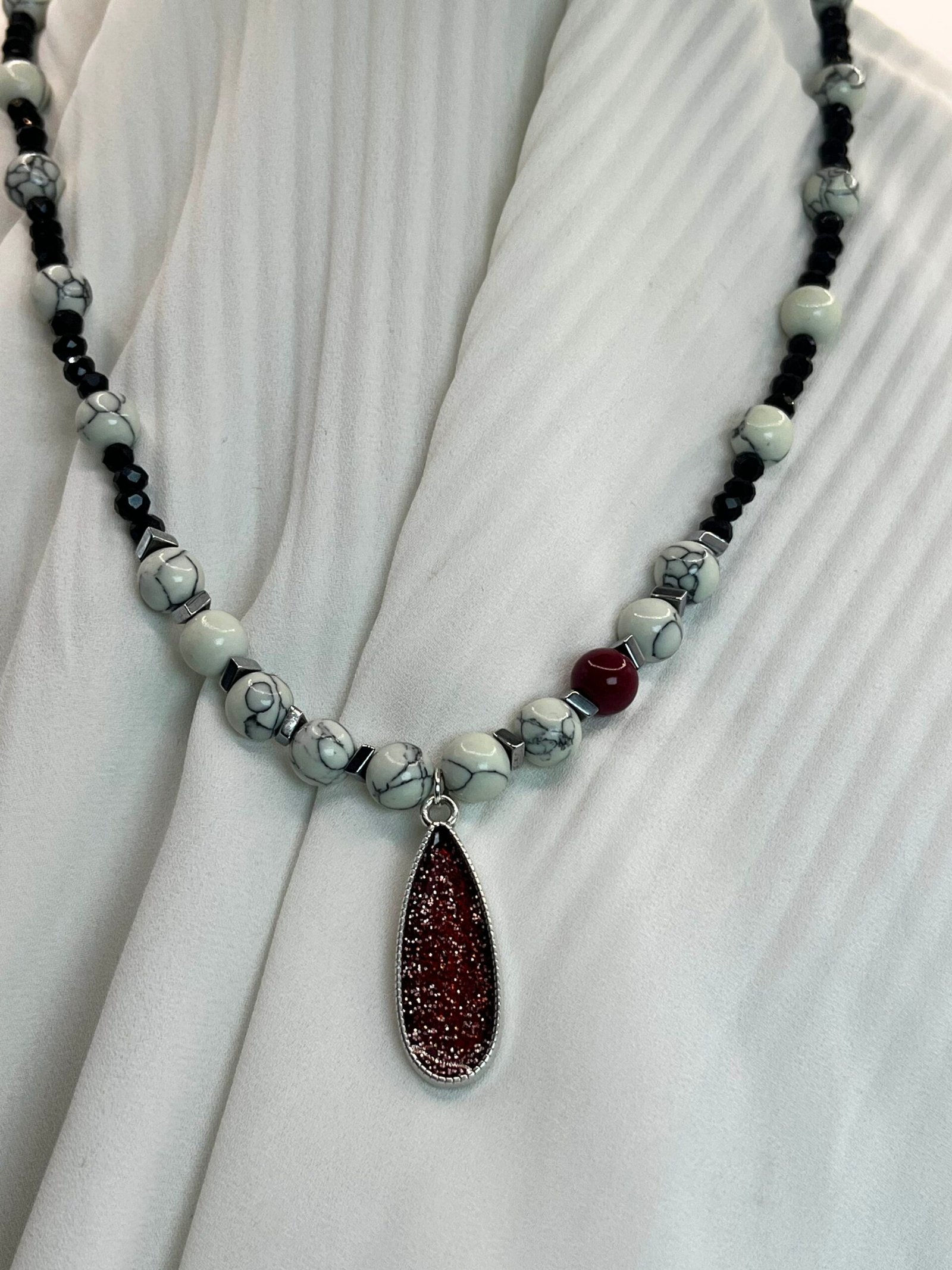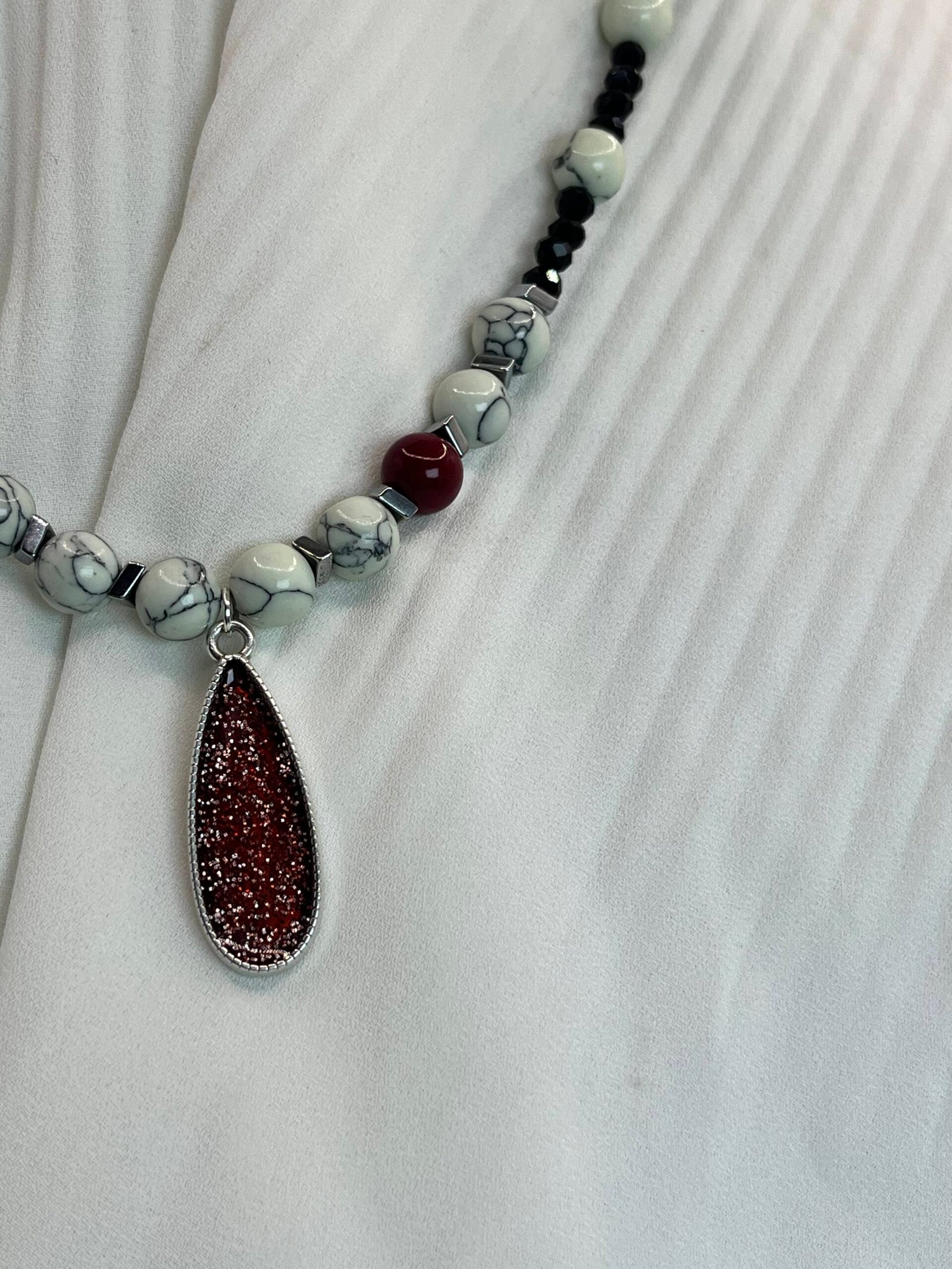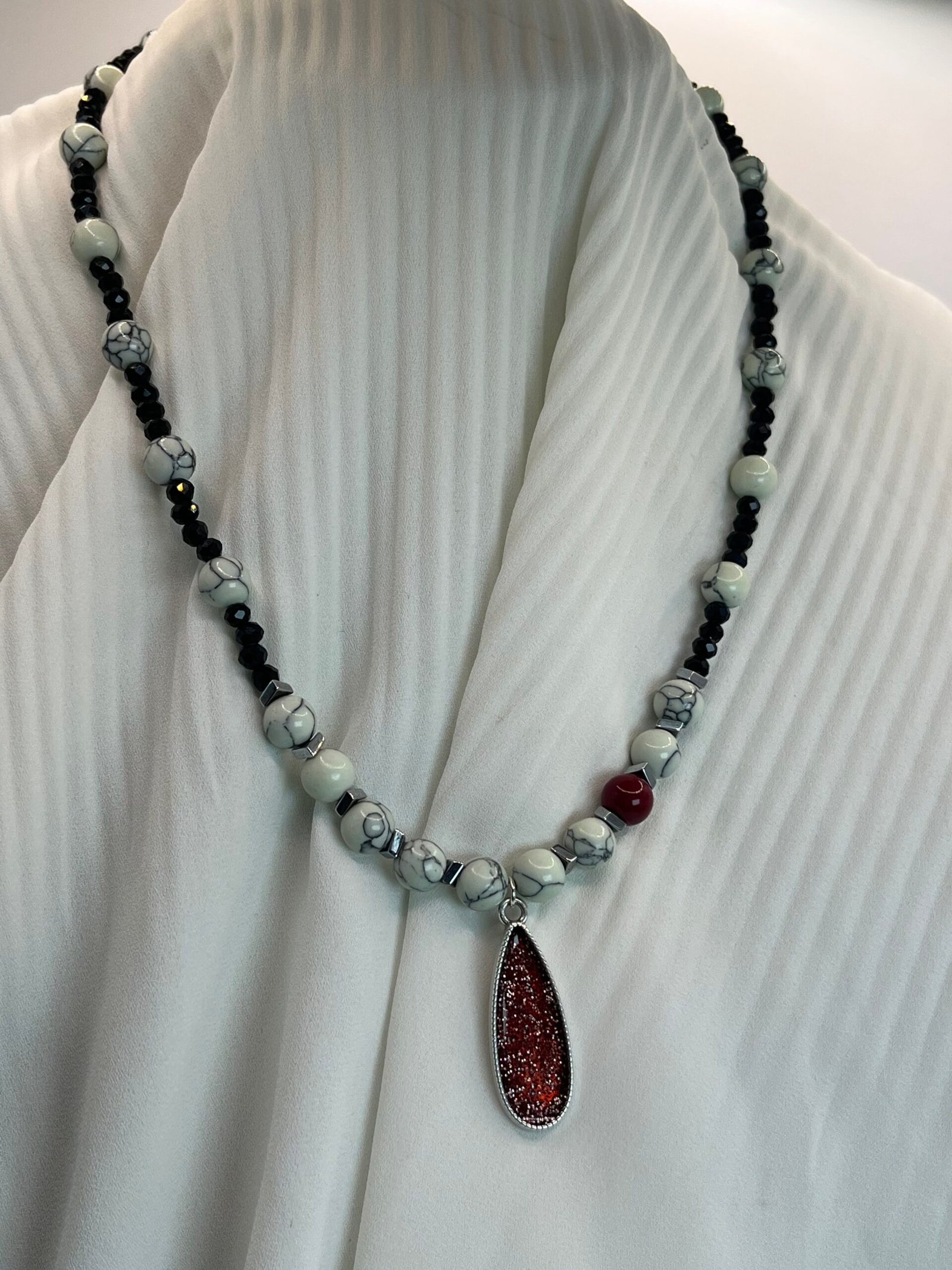Κοντό κολιέ με χάντρες από χαολίτη (0,8cm) σε ασπρόμαυρο χρώμα, μαύρες κρυστάλλινες χάντρες (0,4cm), ατσάλινες διαχωριστικές λεπτομέριες και κεντρικό επάργυρο στοιχείο σε σχήμα σταγόνας με κόκκινο σμάλτο.