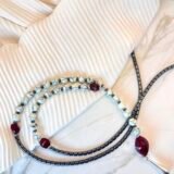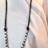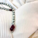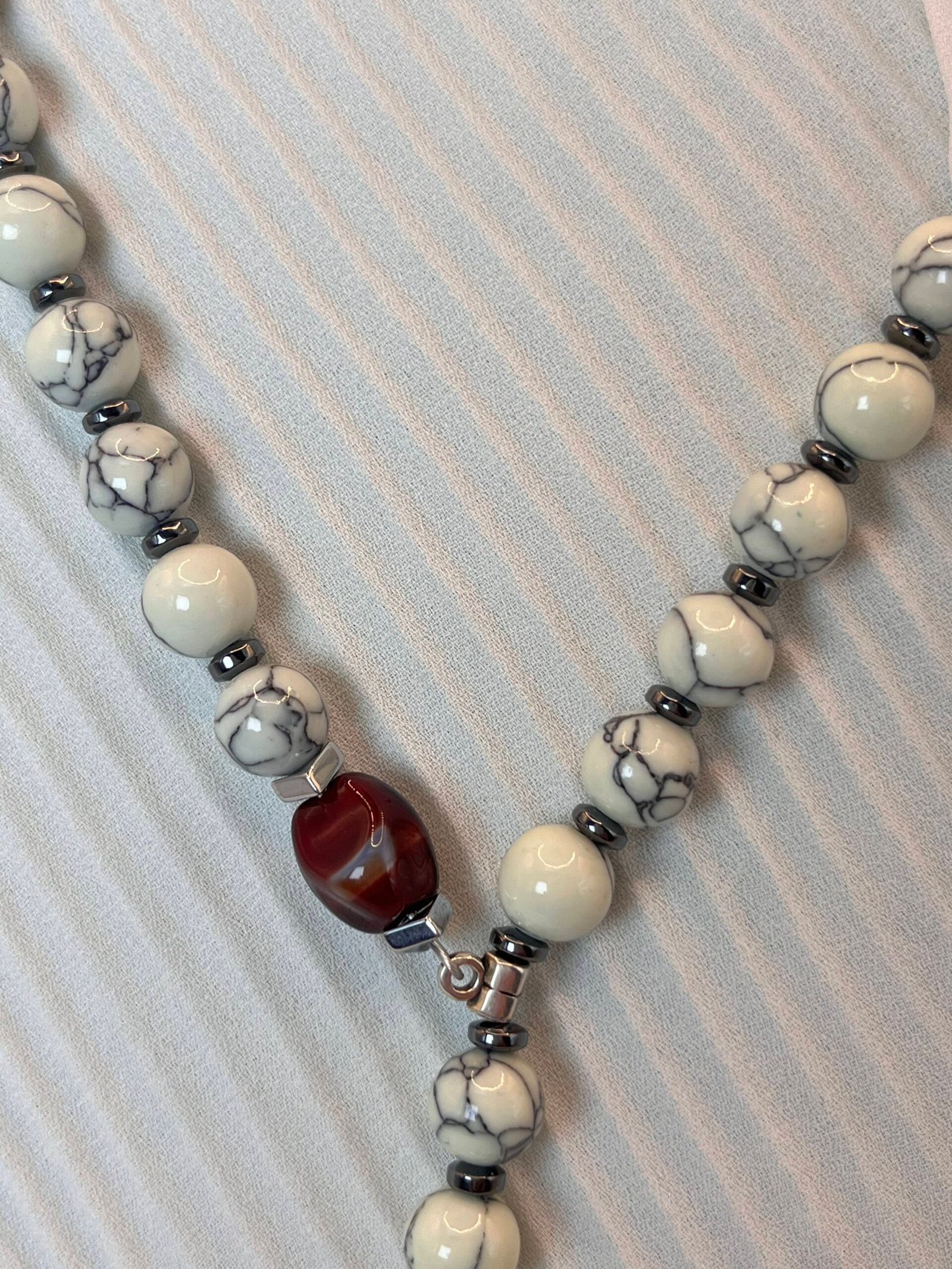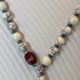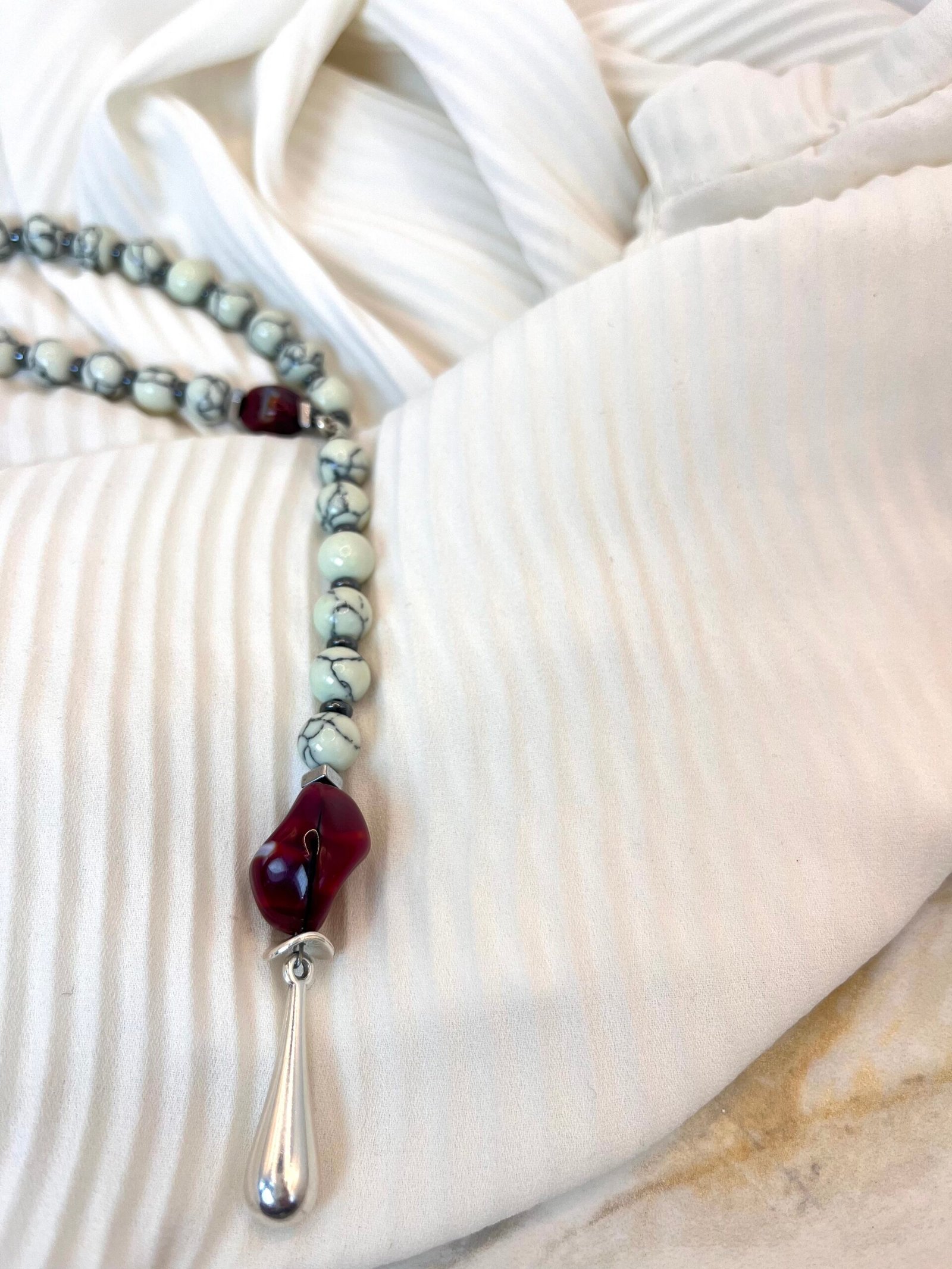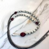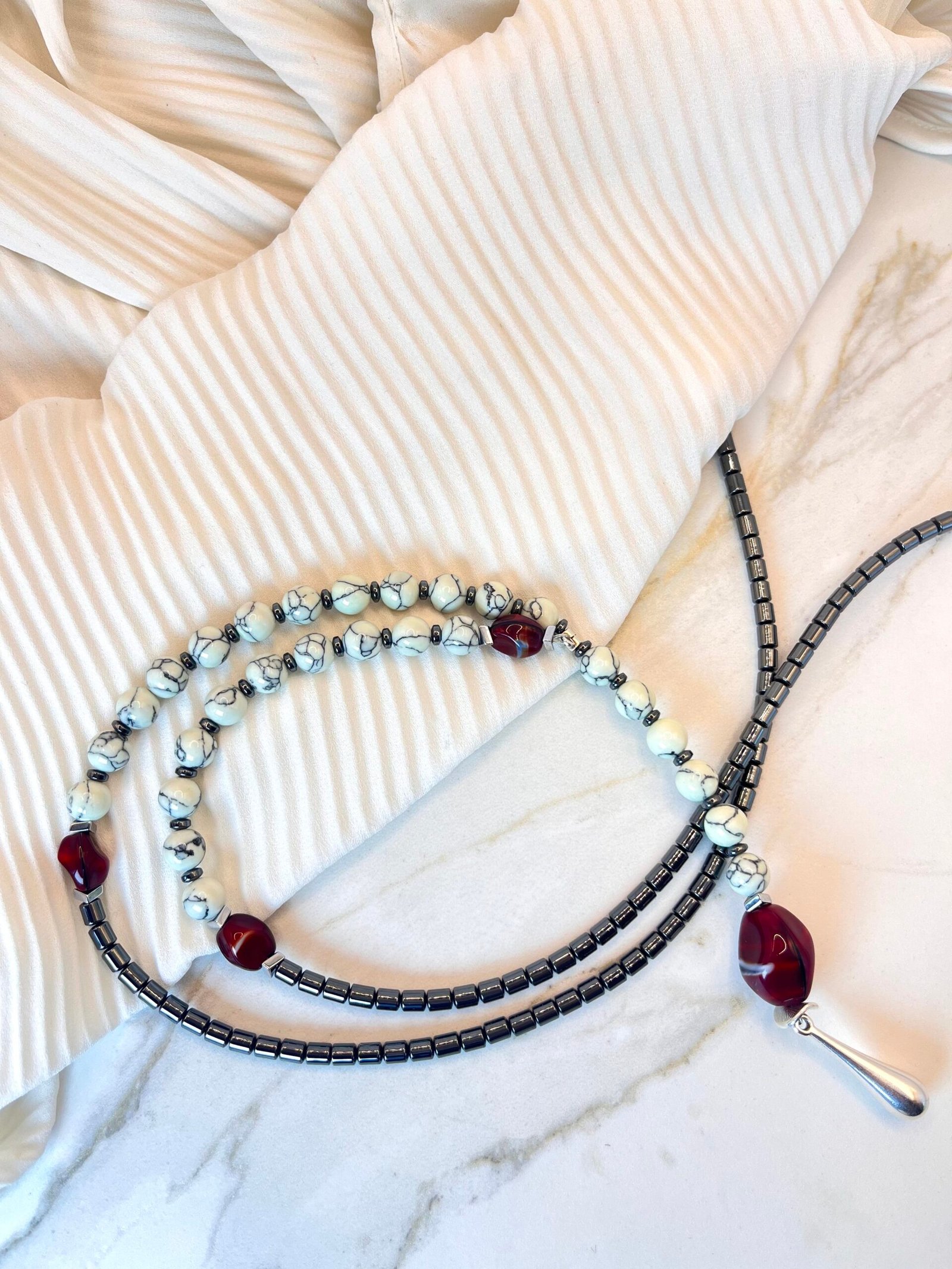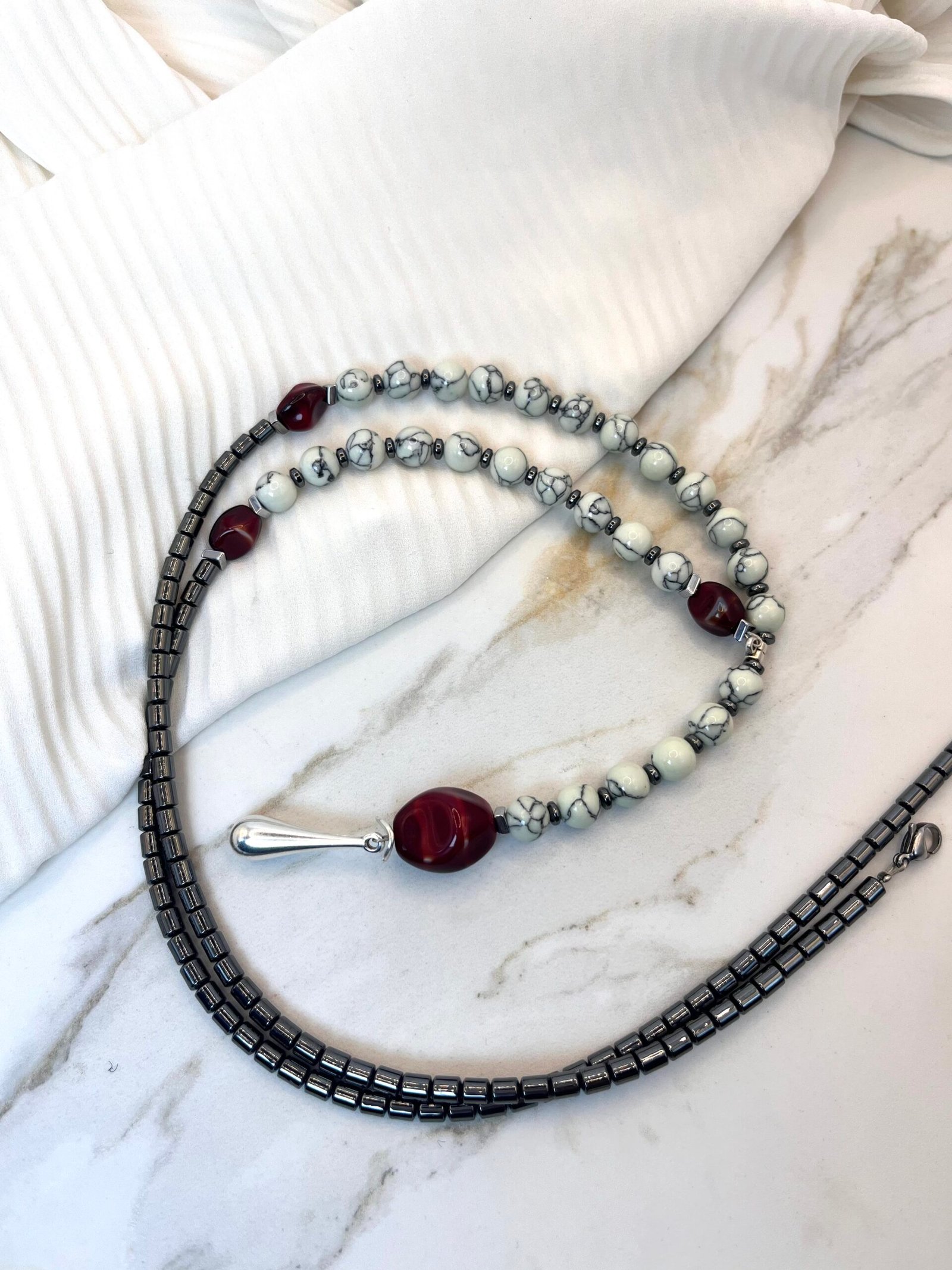 Μοναδικό κολιέ σε σχήμα γραβάτας με εναρμονισμένη σύνθεση πολλών στοιχείων. Αποτελείται από κυλινδρικές χάντρες αιματίτη (0,5cm) , λευκές χάντρες χαολίτη (0,5cm), κόκκινες χάντρες πορσελάνης (1cm). Το κατώτερο στοιχείο είναι επάργυρο (2,5cm).