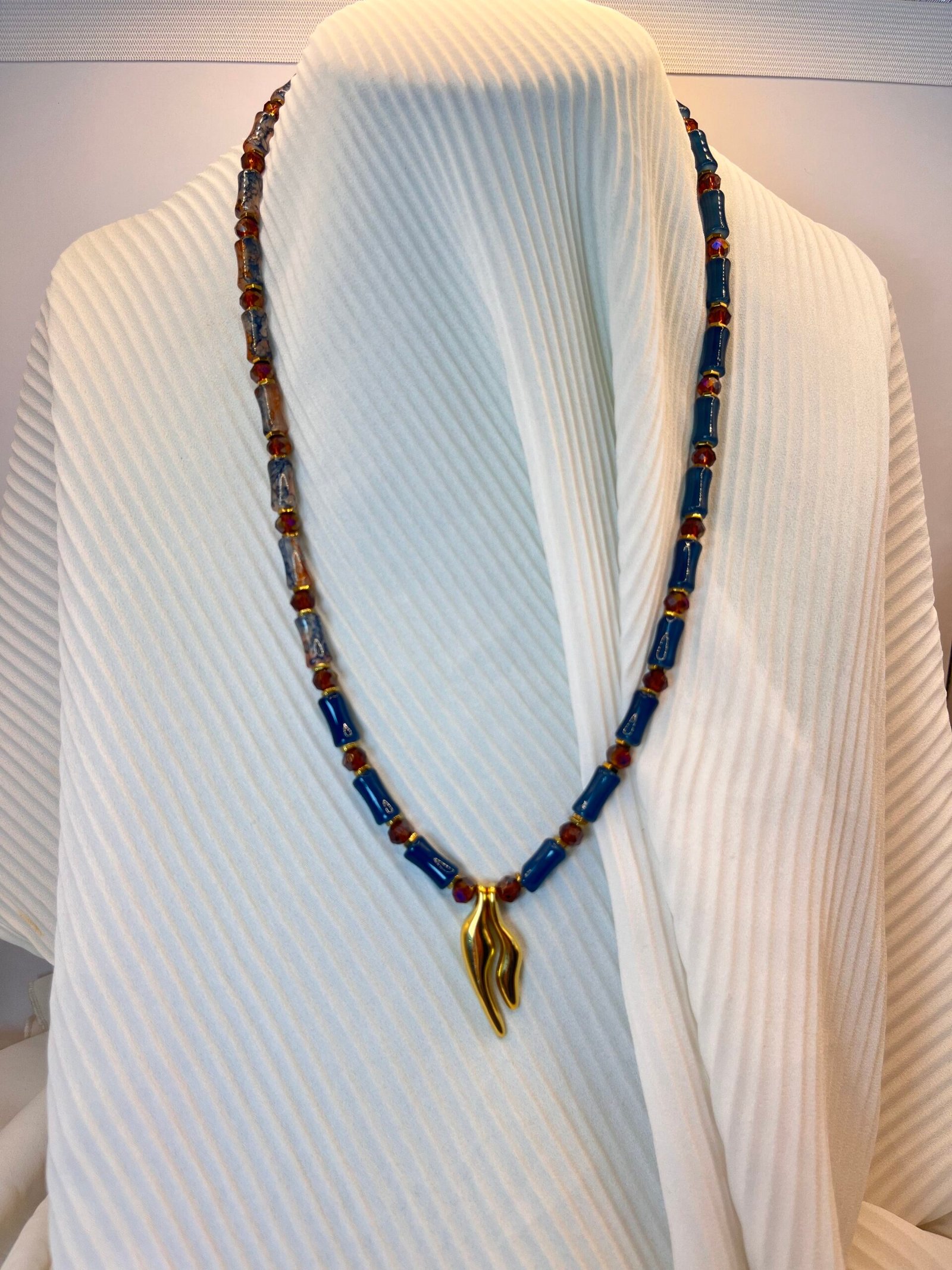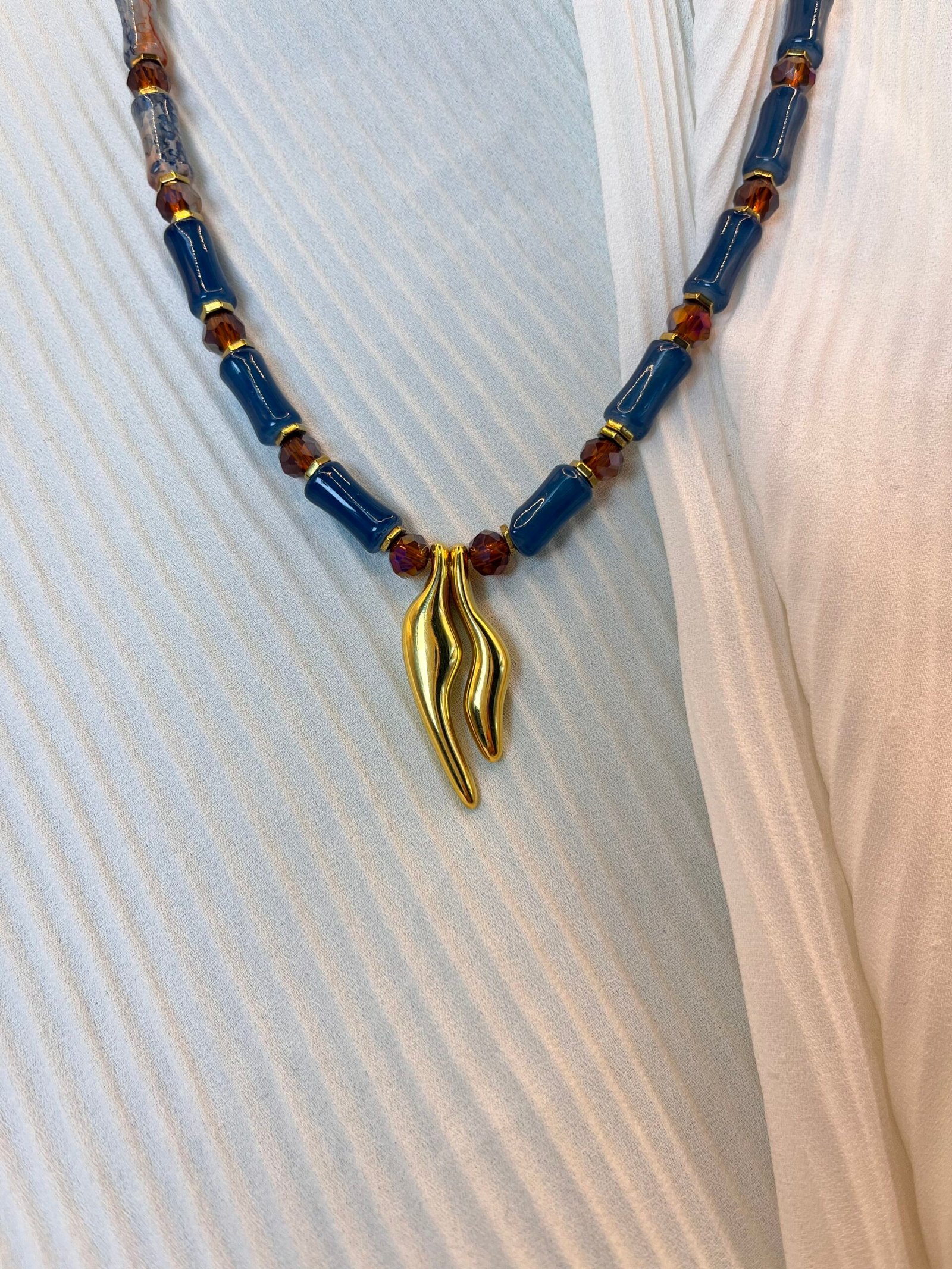 Κολιέ σε μοναδικές αποχρώσεις. Αποτελείται από μικρά στρογγυλά μωβ κρύσταλλα (0,2cm) και κρύσταλλα μπλε ή πολύχρωμα (1cm) με ατσάλινα στοιχεία ανάμεσα. Το τελικό στοιχείο είναι δύο επίχρυσα άνισα κομμάτια (2,5 / 3,5 cm).