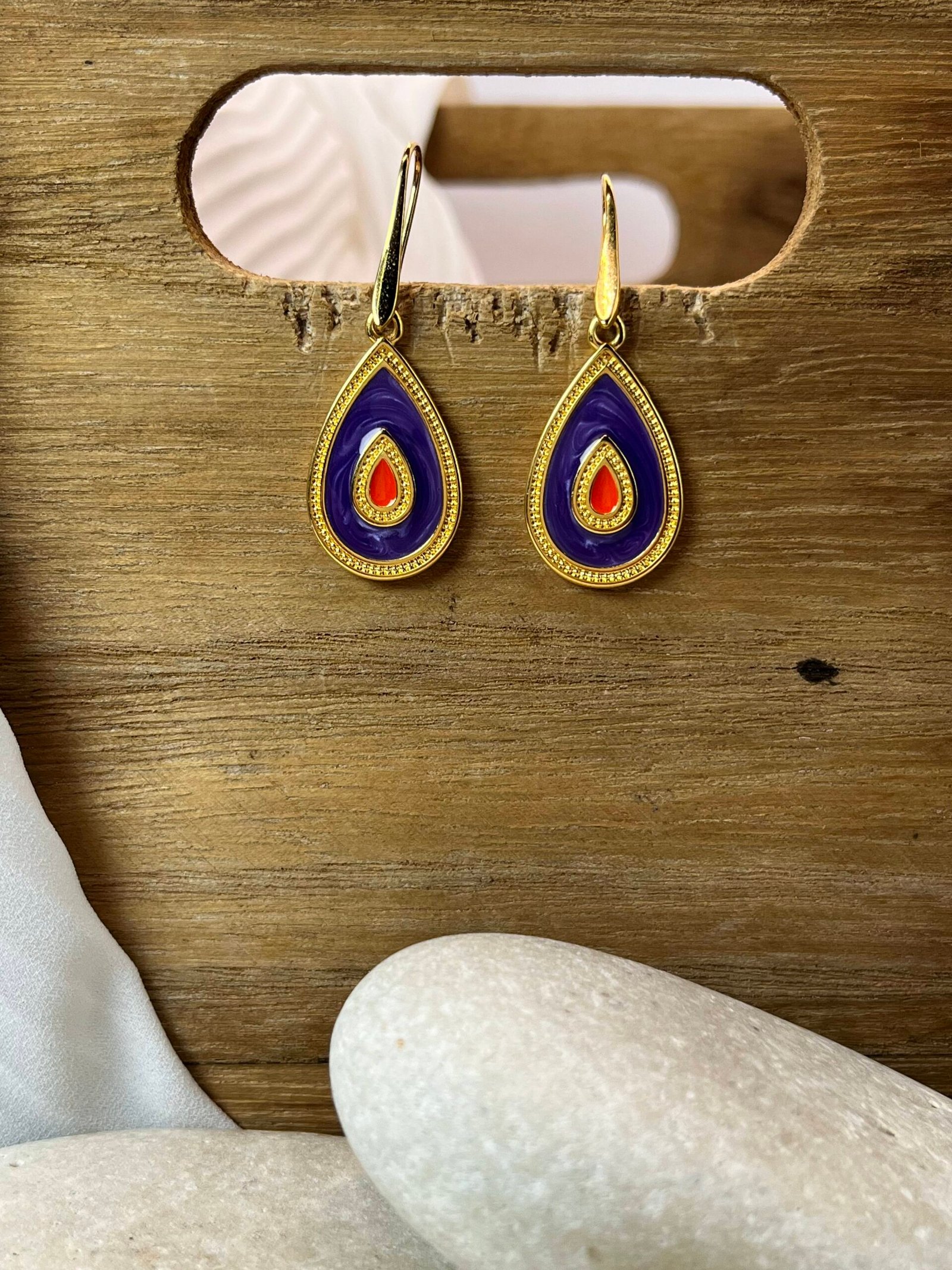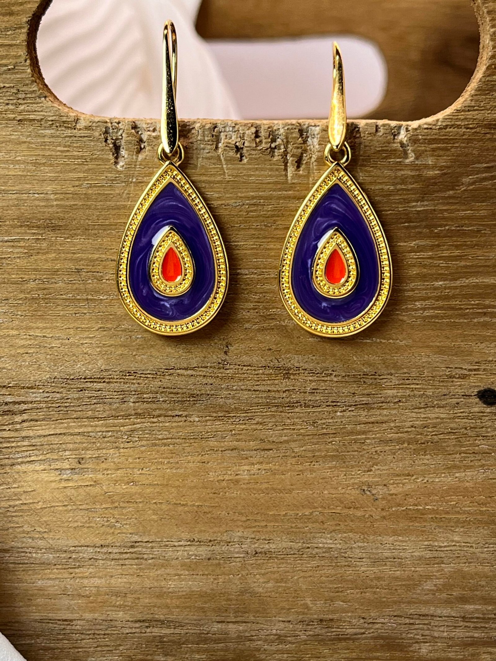 Κρεμαστό επίχρυσο σκουλαρίκι σε σχήμα σταγόνας με λεπτομέρεια στο εσωτερικό.