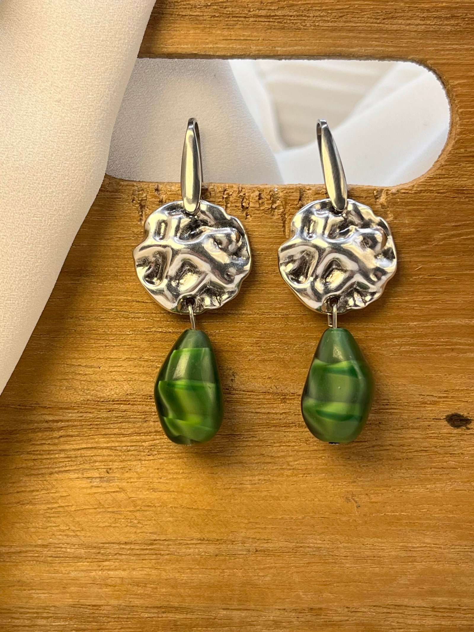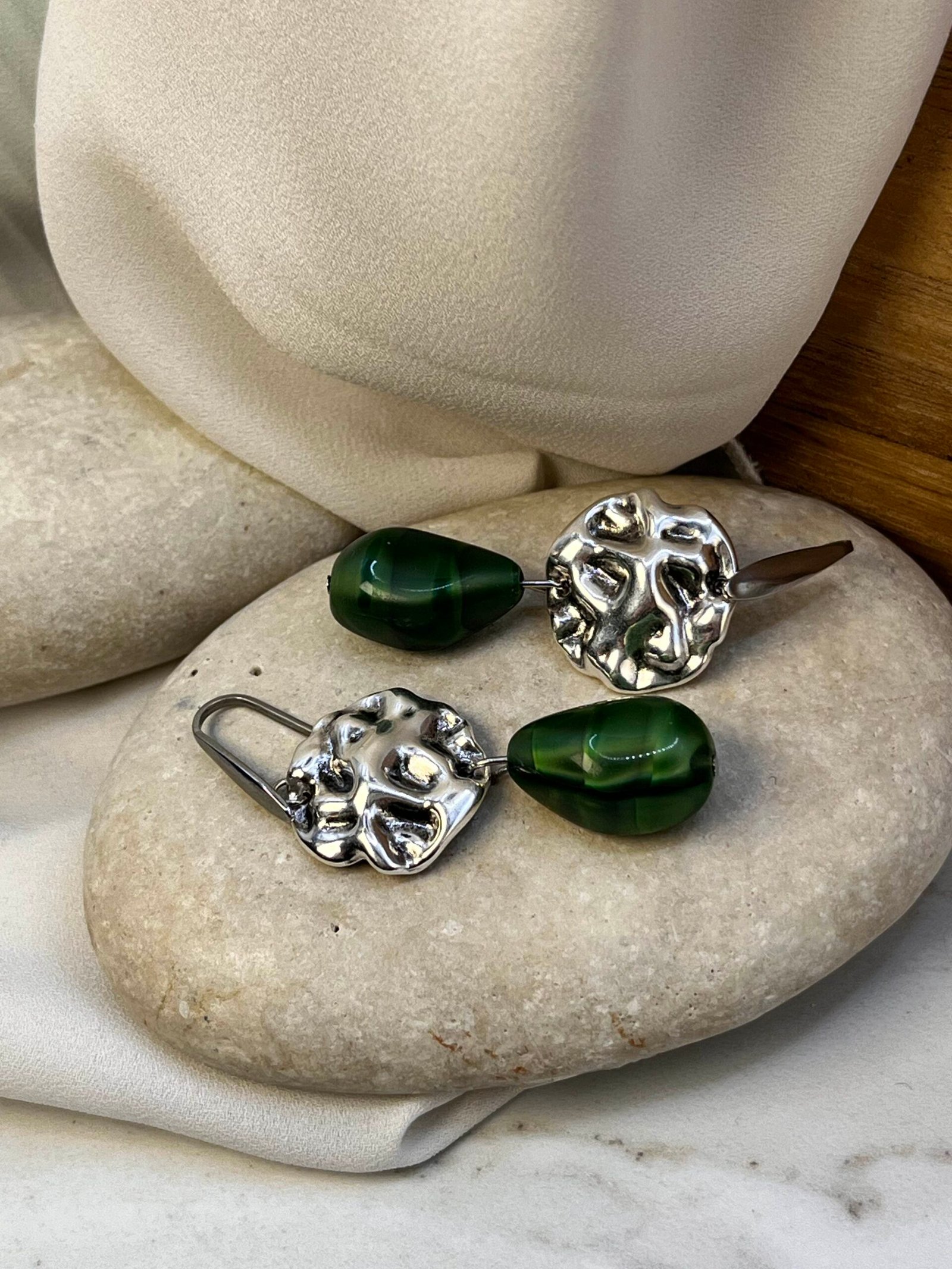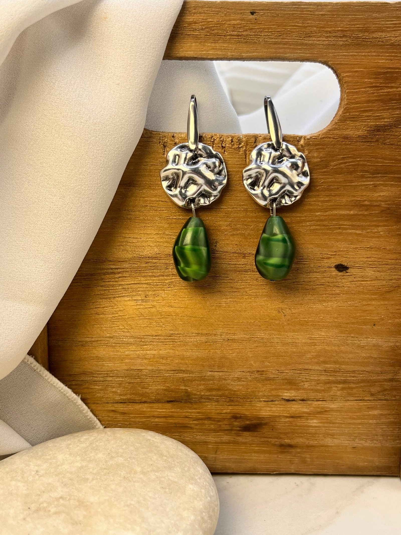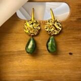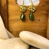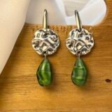 Κρεμαστό σκουλαρίκι με επάργυρο ή επίχρυσο στοιχείο και πράσινο κρύσταλλο με λεπτομέρειες στην απόχρωση. Ο γάντζος είναι ατσάλινος.