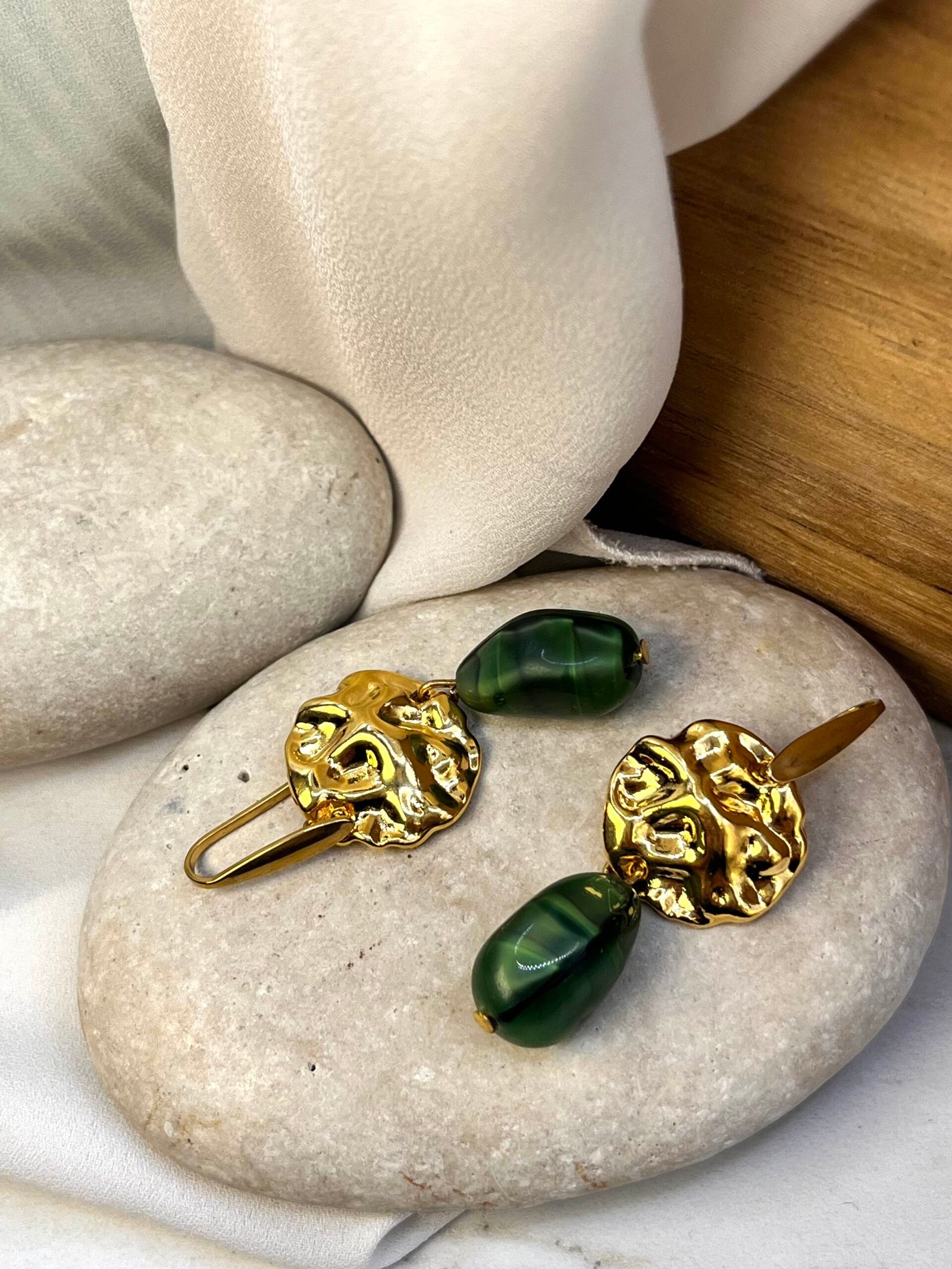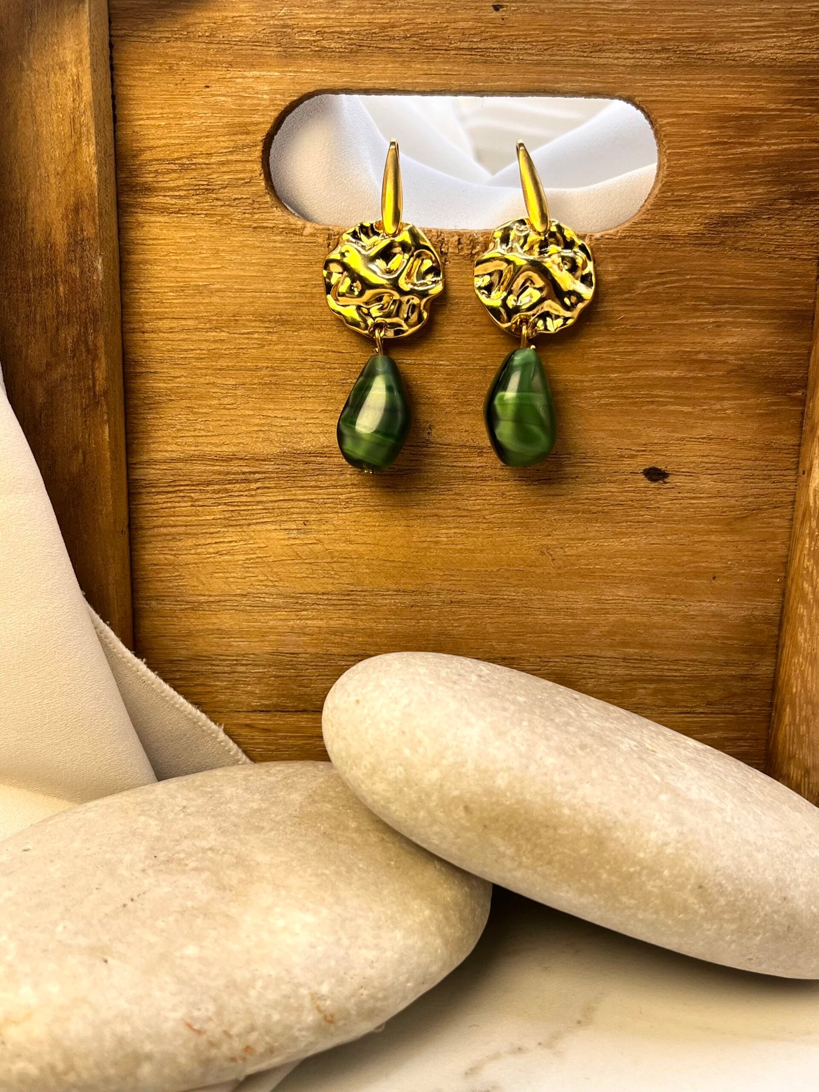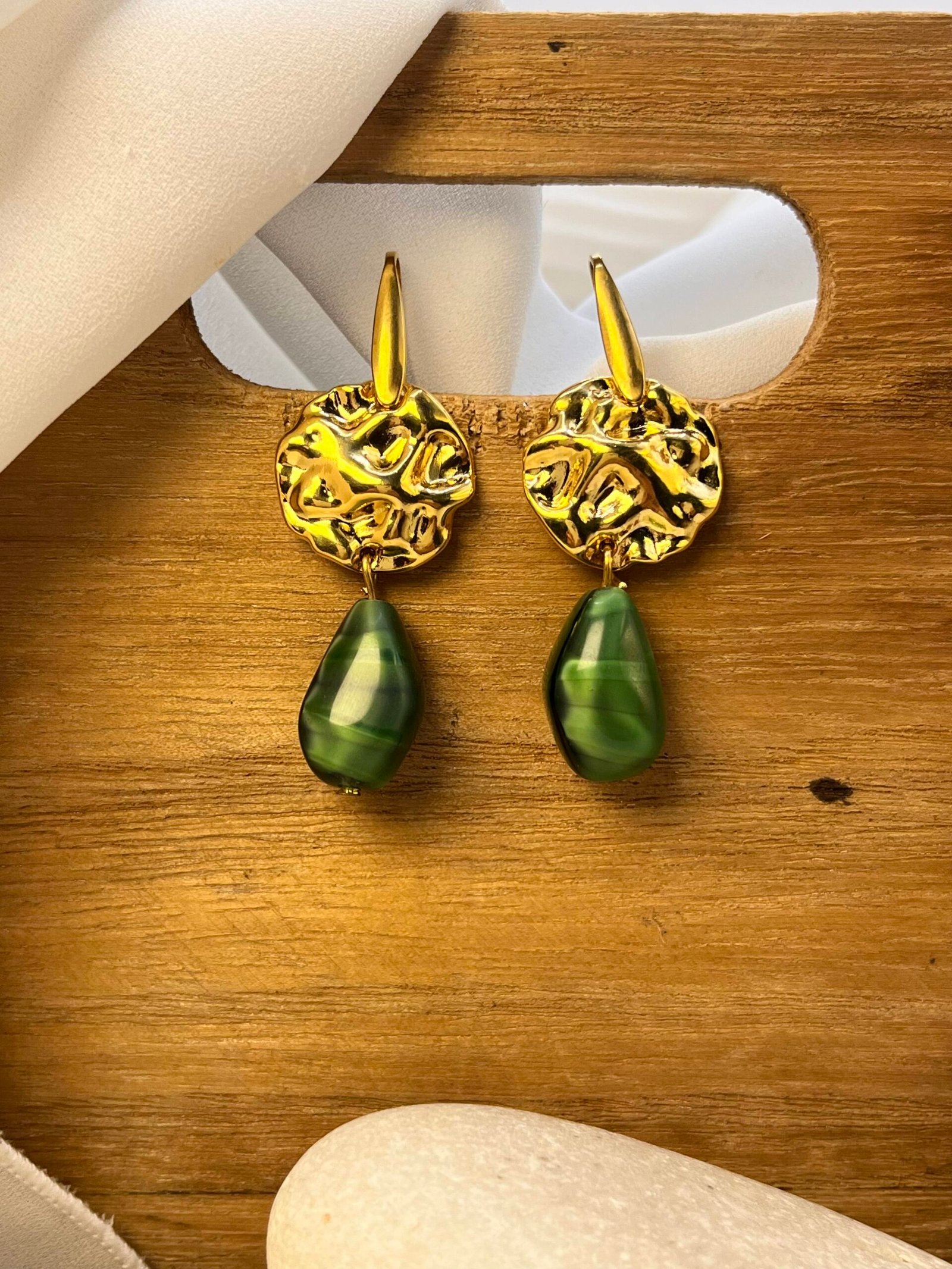 Κρεμαστό σκουλαρίκι με επάργυρο ή επίχρυσο στοιχείο και πράσινο κρύσταλλο με λεπτομέρειες στην απόχρωση. Ο γάντζος είναι ατσάλινος.