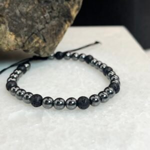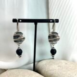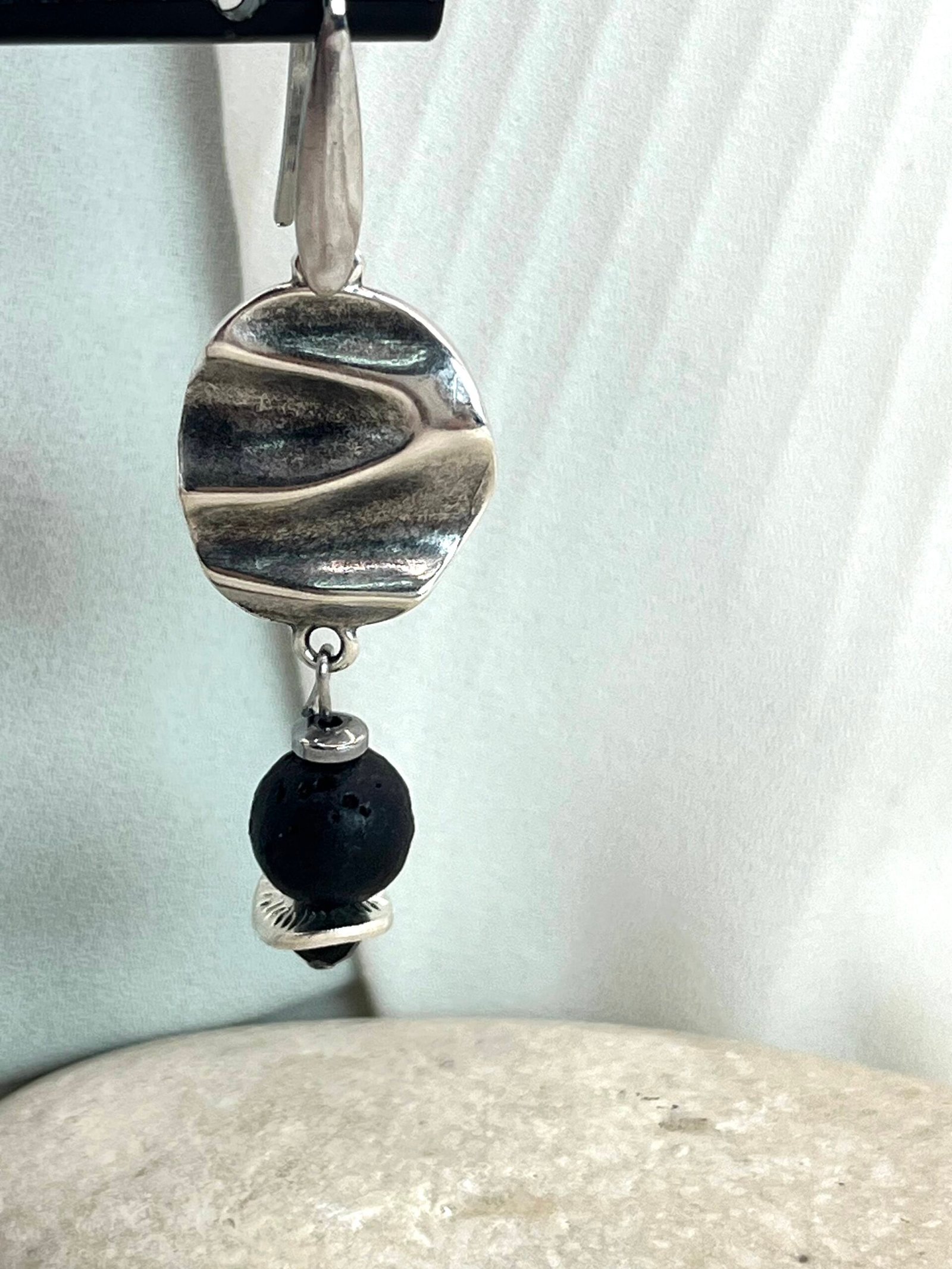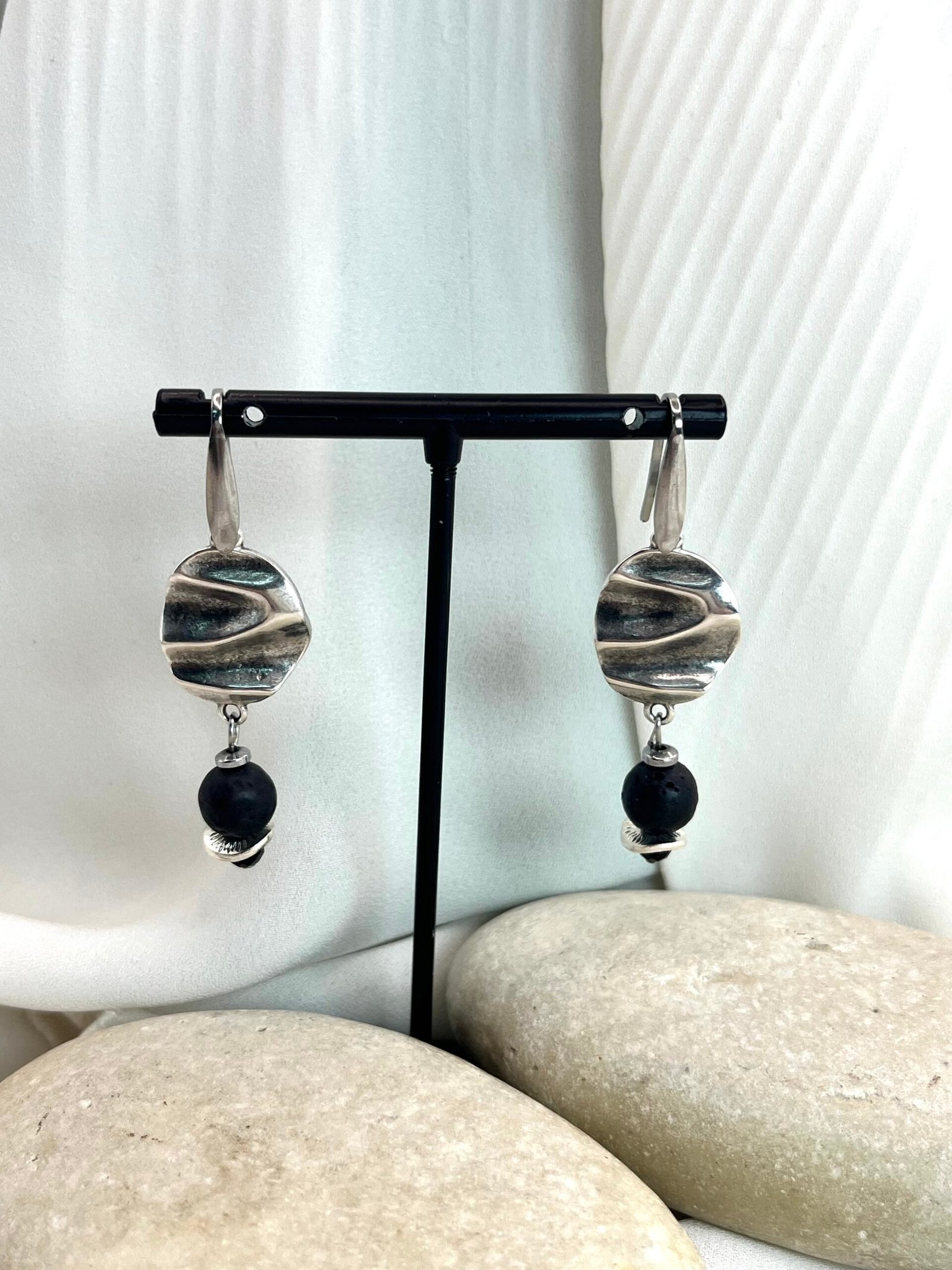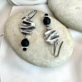 Κρεμαστό σκουλαρίκι με επάργυρο κυματιστό κεντρικό στοιχείο και χάντρα ηφαιστειακής λάβας (0,8cm), επάργηρους δίκους και μαύρο κρύσταλλο.