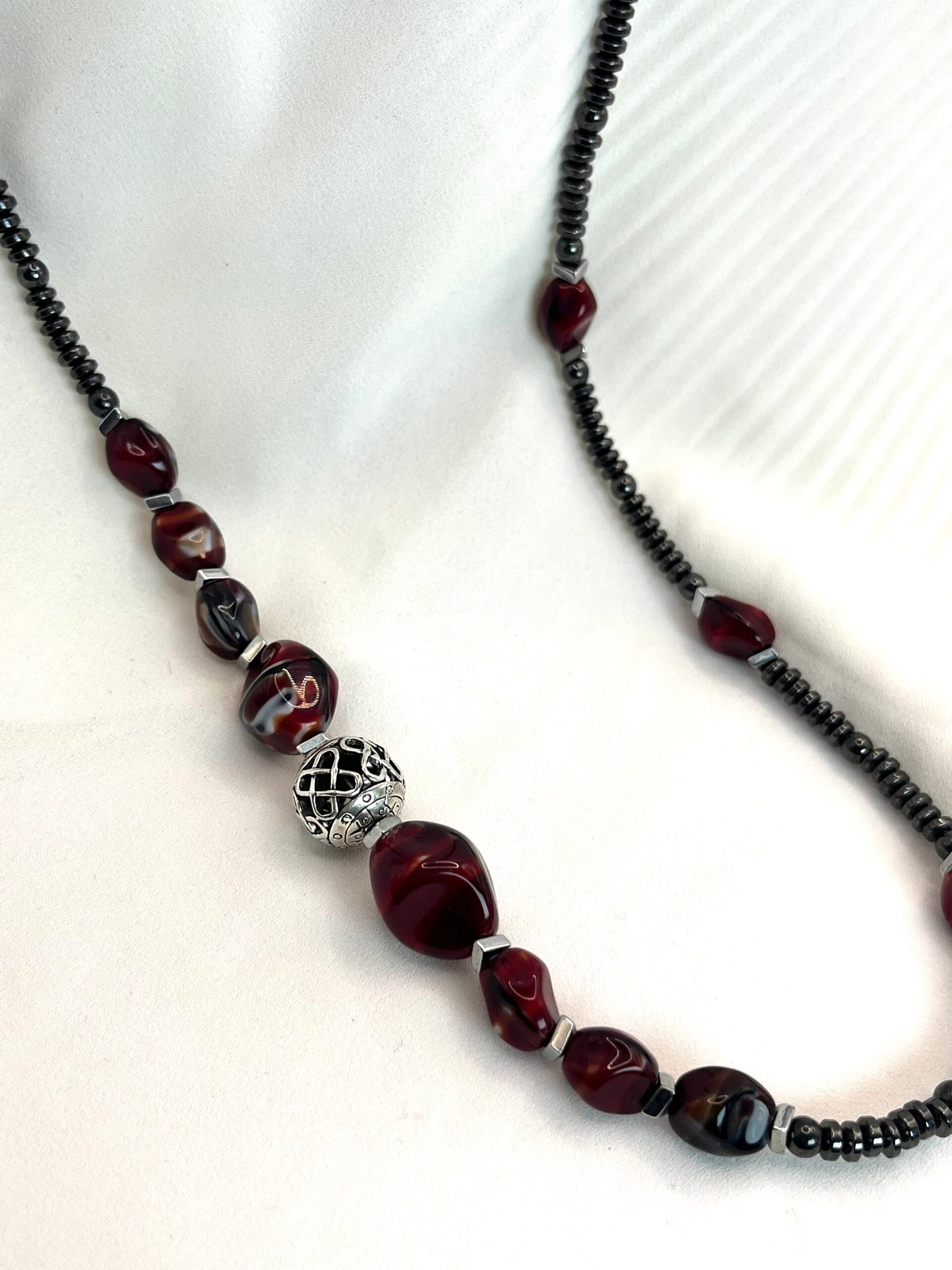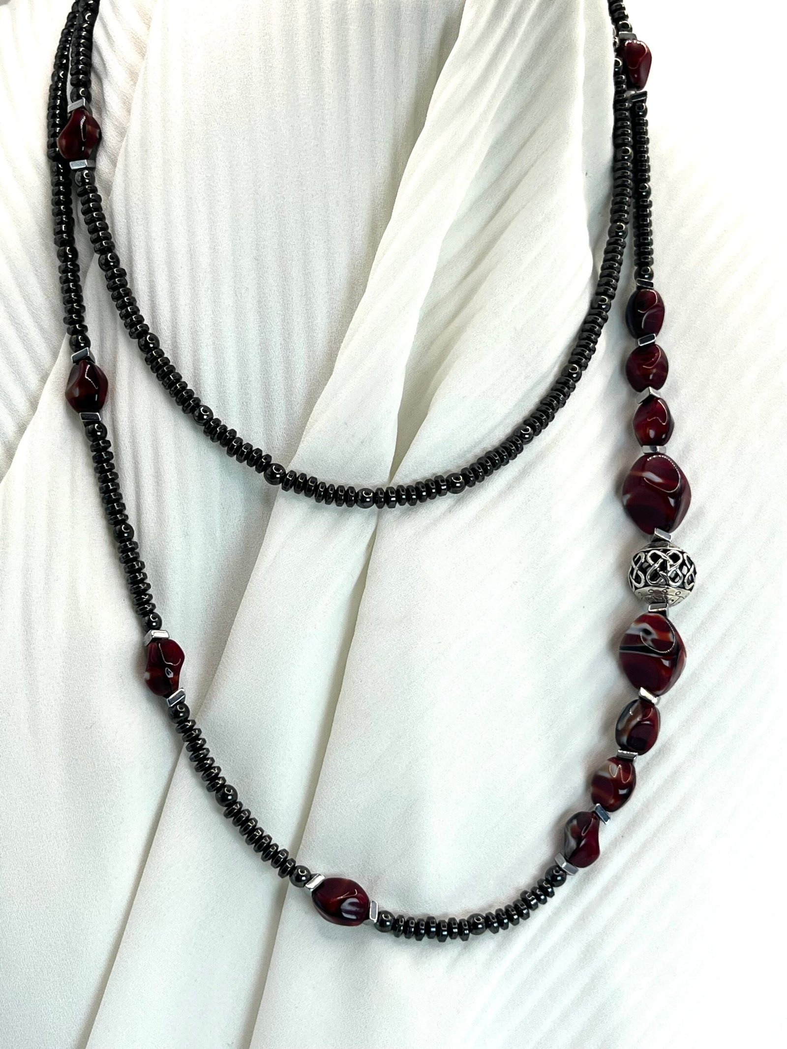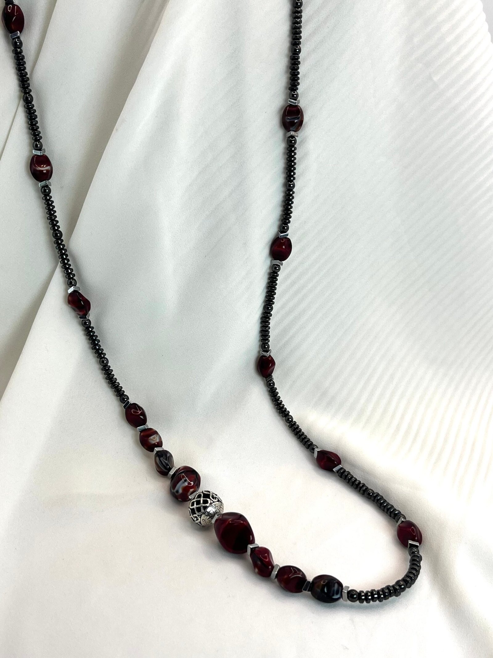 Κολιέ με χάντρες ροδέλες από αιματίτη (0,4cm), χάντρες από πορσελάνη (1×0,8cm & 1,5×1,5cm), σε βυσσινί αποχρώσεις, διαχωριστικές ατσάλινες λεπτομέρειες και κεντρικό επάργυρο στοιχείο με μοναδικό σχέδιο (1,2×1,2cm). Φοριέται και διπλό!
