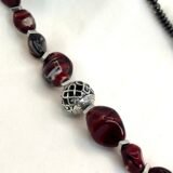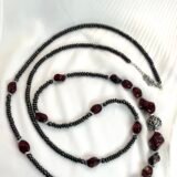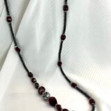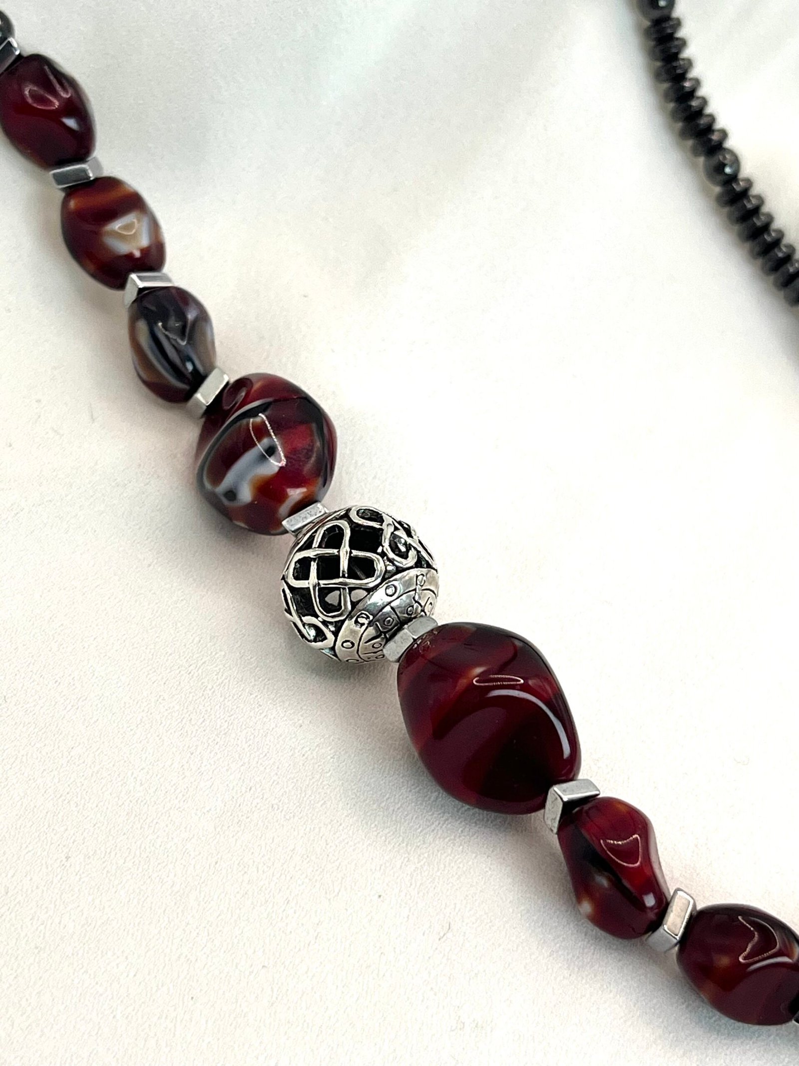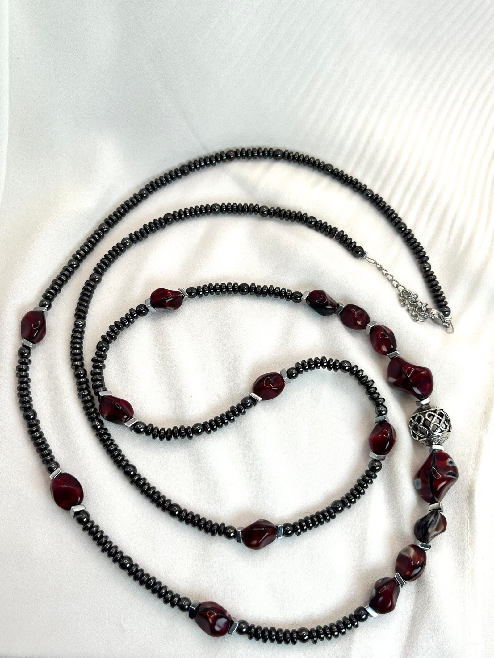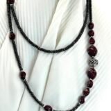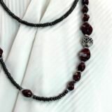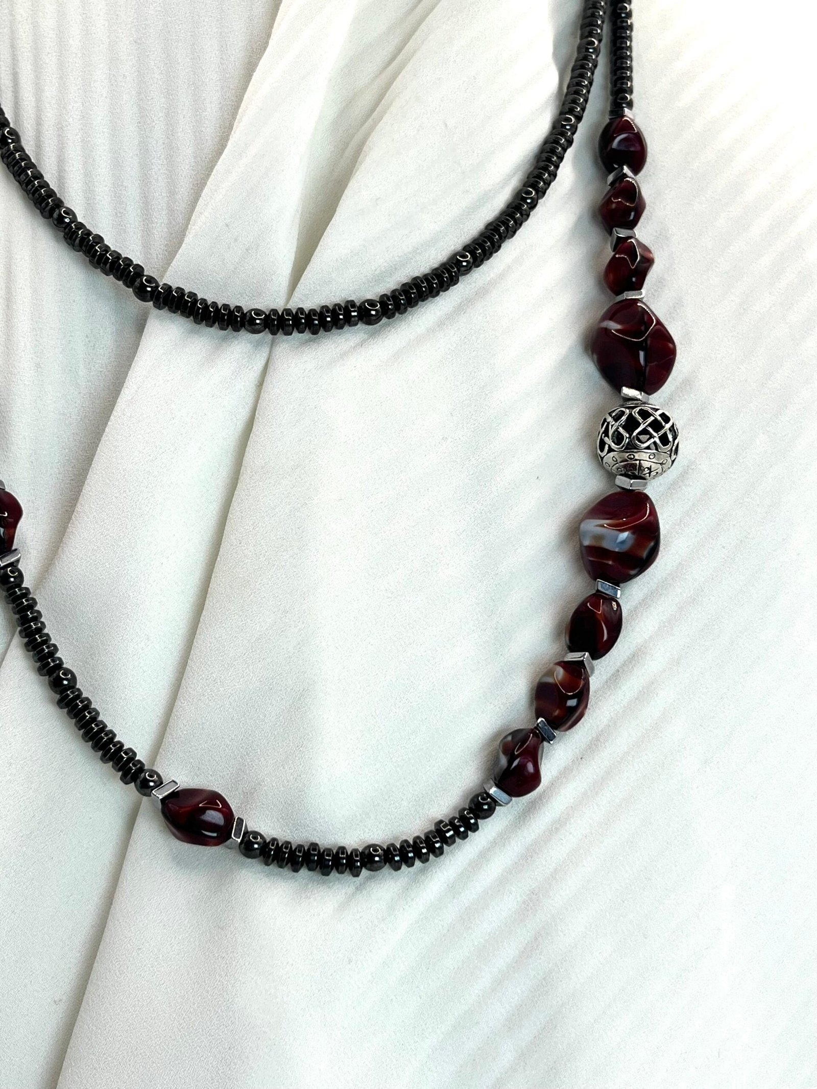 Κολιέ με χάντρες ροδέλες από αιματίτη (0,4cm), χάντρες από πορσελάνη (1×0,8cm & 1,5×1,5cm), σε βυσσινί αποχρώσεις, διαχωριστικές ατσάλινες λεπτομέρειες και κεντρικό επάργυρο στοιχείο με μοναδικό σχέδιο (1,2×1,2cm). Φοριέται και διπλό!