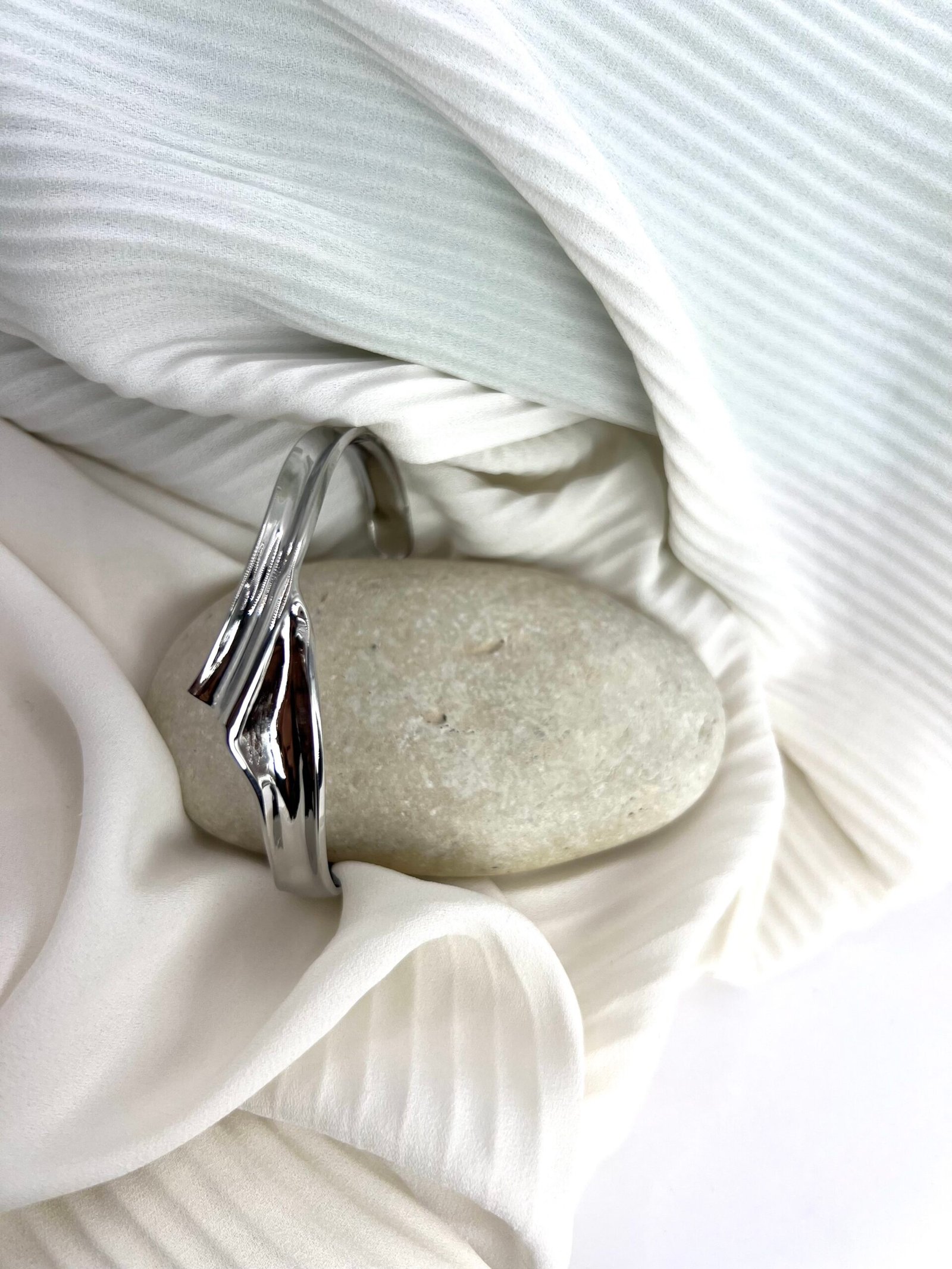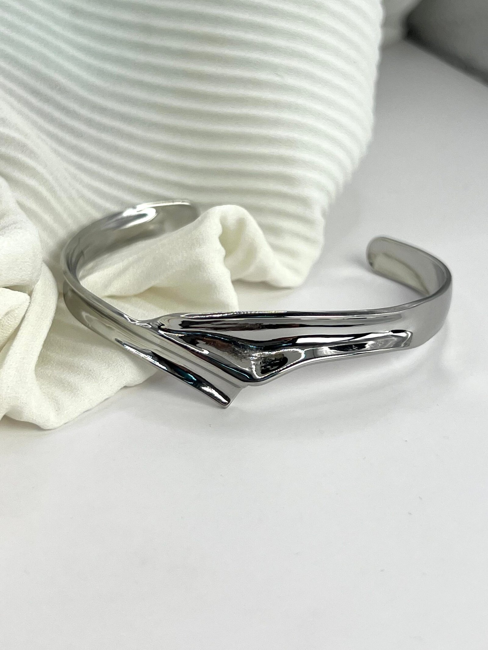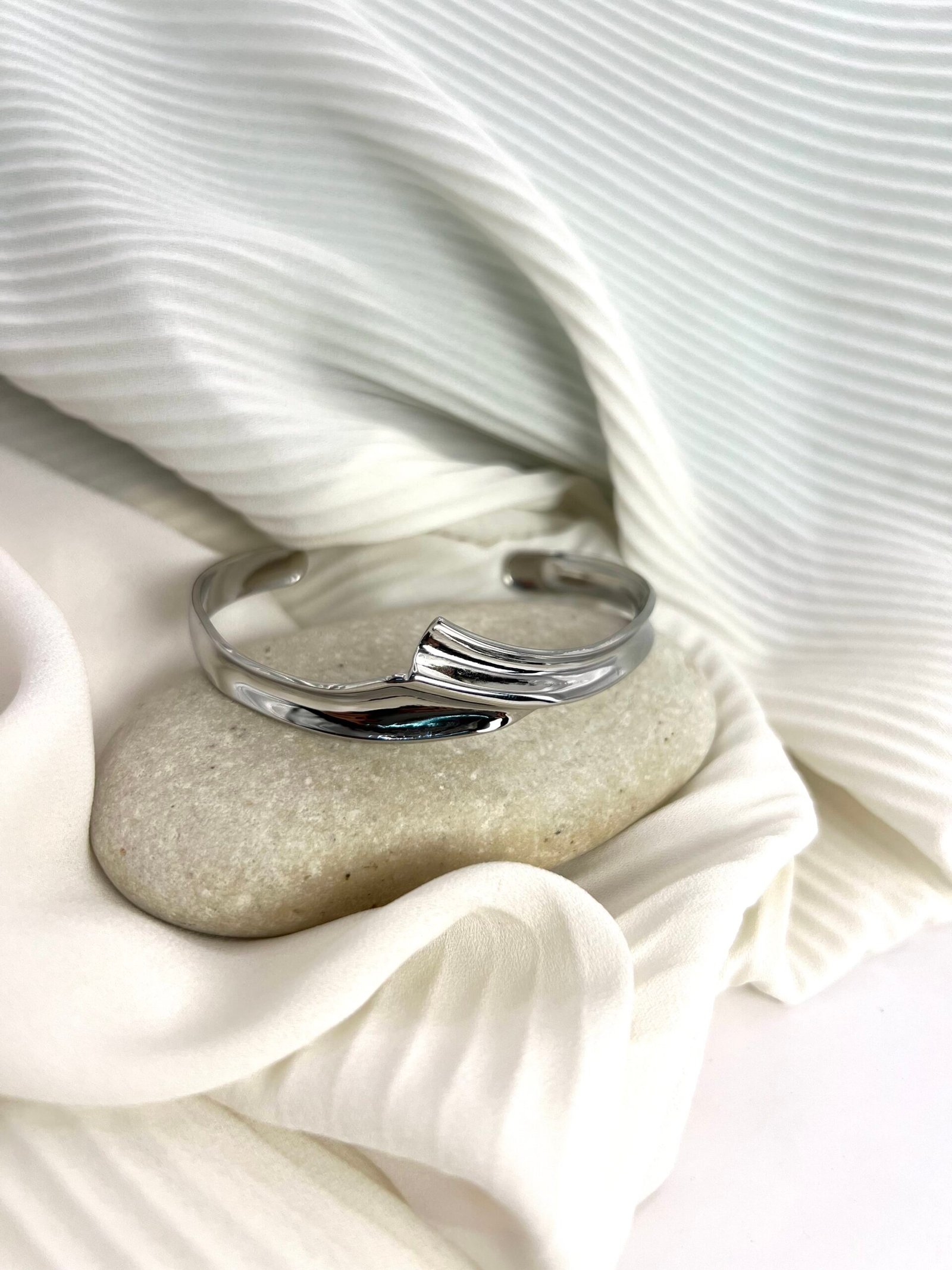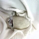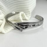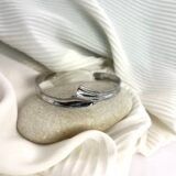 Ατσάλινη χειροπέδα σε ασημί χρώμα, με ιδιαίτερο κεντρικό σχέδιο. Μέγιστη διάμετρος 6,5cm και άνοιγμα 3,5cm.