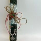 Χειροποίητη λαμπάδα (25cm) από πραγματικό μελισσοκέρι, σε φυσικό και πράσινο χρώμα, διακοσμημένη με πράσινη κορδέλα, ροζ κρυσταλλάκια και πολύχρωμη καρφίτσα ξύλινο φύλλα. Συνδιάζεται με ατσάλινο βραχίολι με κρεμαστό σύμβολο της Σπείρας (περίμετρος 14cm+ προέκταση)