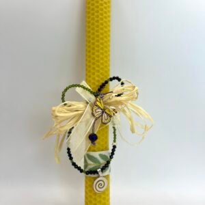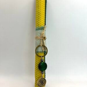 Χειροποίητη λαμπάδα (25cm) από πραγματικό μελισσοκέρι, σε φυσικό και πράσινο χρώμα, διακοσμημένη με πράσινη κορδέλα, ροζ κρυσταλλάκια και πολύχρωμη καρφίτσα ξύλινο φύλλα. Συνδιάζεται με ατσάλινο βραχίολι με κρεμαστό σύμβολο της Σπείρας (περίμετρος 14cm+ προέκταση)
