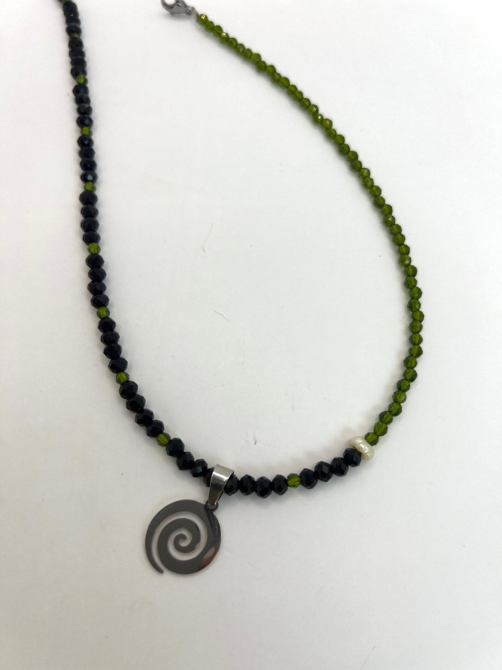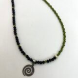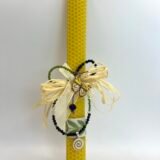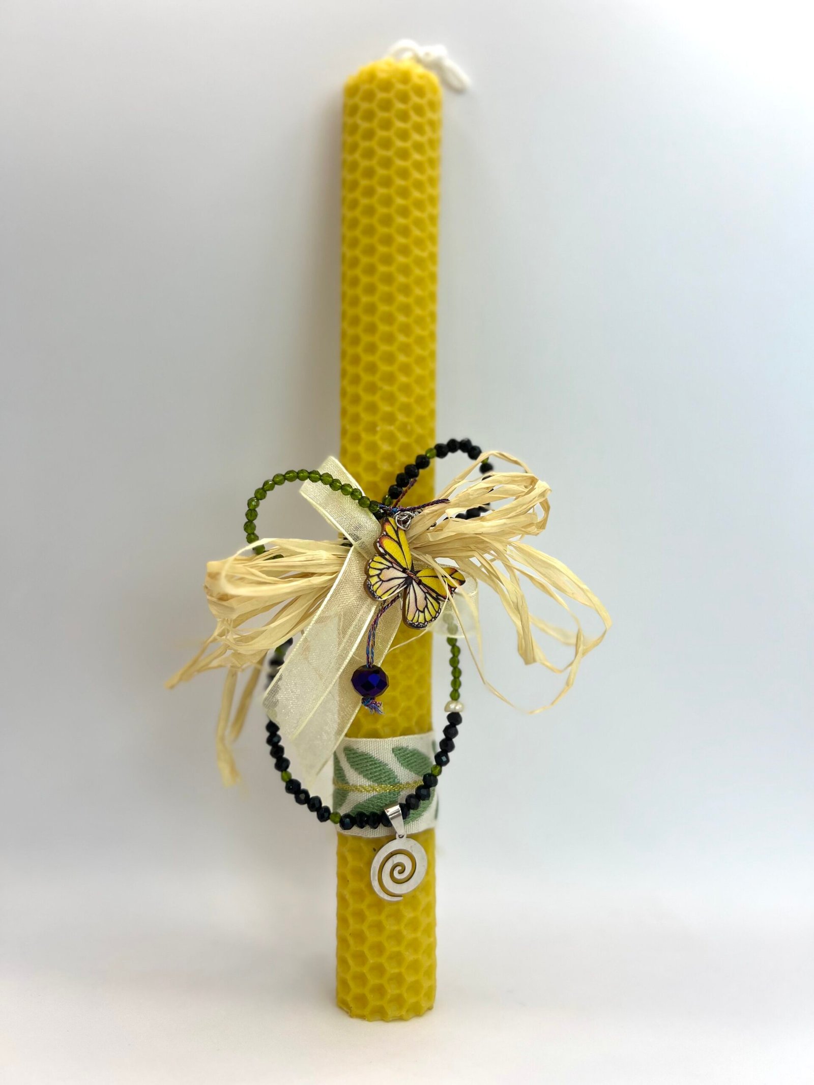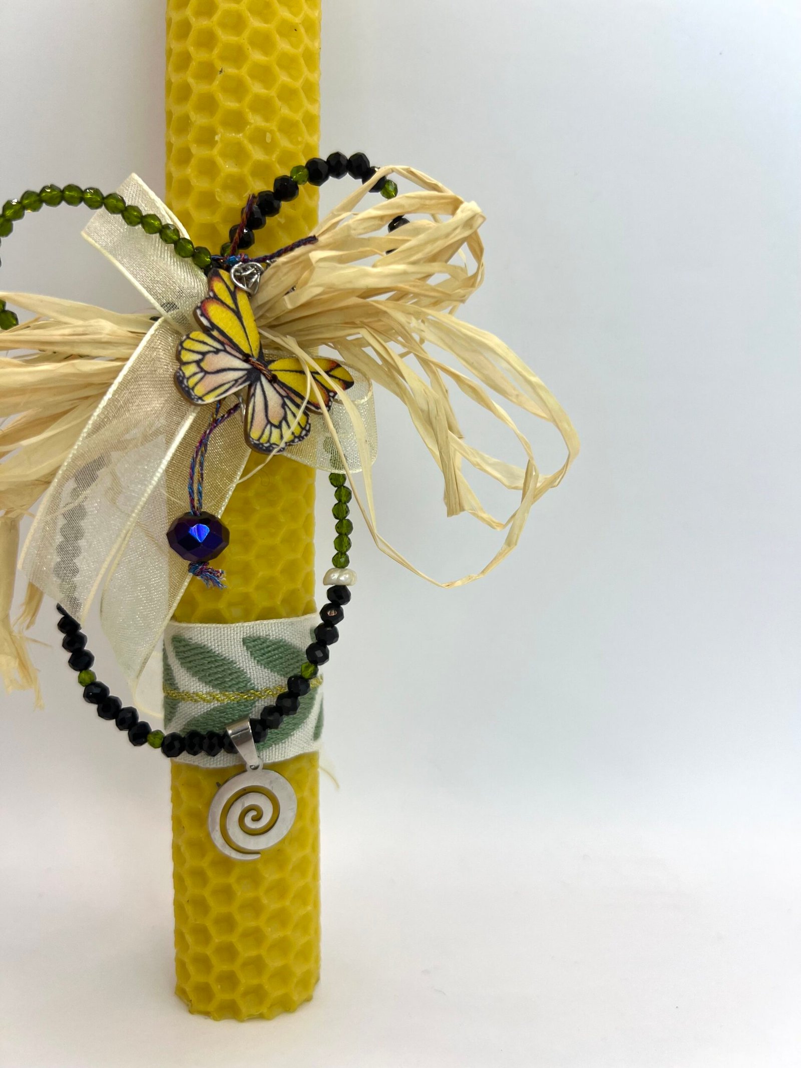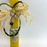 Χειροποίητη λαμπάδα (25cm) από πραγματικό μελισσοκέρι, σε φυσικό χρώμα, διακοσμημένη με μπεζ κορδέλα με πράσινα φύλλα, κύπερη, λευκή κορδέλα και καρφίτσα κίτρινη πεταλούδα. Συνδιάζεται με κοντό κολιέ με πράσινα και μαύρα κρυσταλλάκια με το σύμβολο της ‘”Σπείρας”.