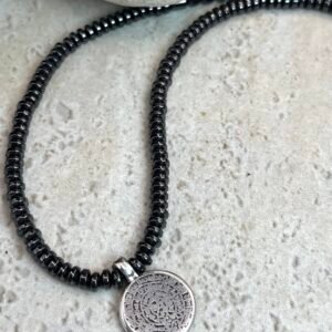 Κολιέ με διακόσμηση από ροδέλες και χάντρες αιματίτη (0,4cm). Το κεντρικό στοιχείο είναι επάργυρος δίσκος Φαιστού.
