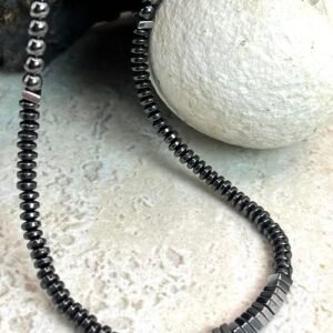Κολιέ με ροδέλες και χάντρες αιματίτη (0,4cm) με κεντρική διακόσμηση από λεπτές, πλάγιες, τετράγωνες χάντρες. Διαθέτει προέκταση.