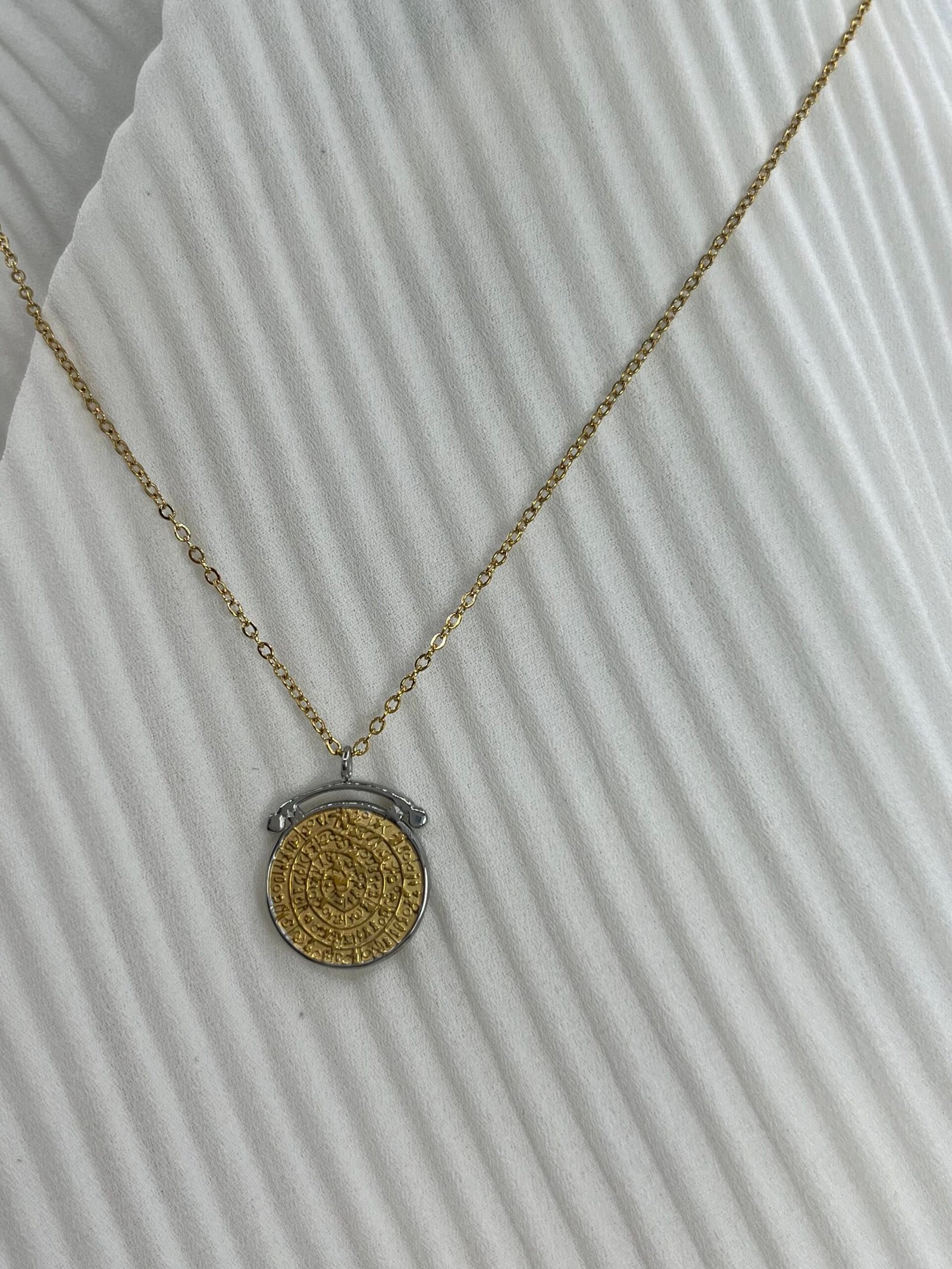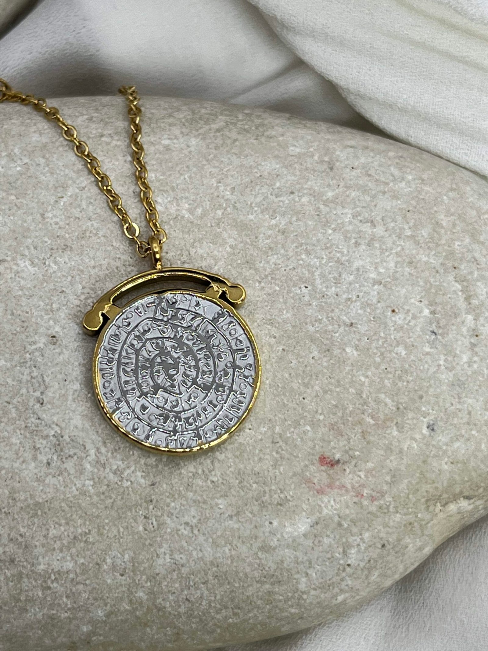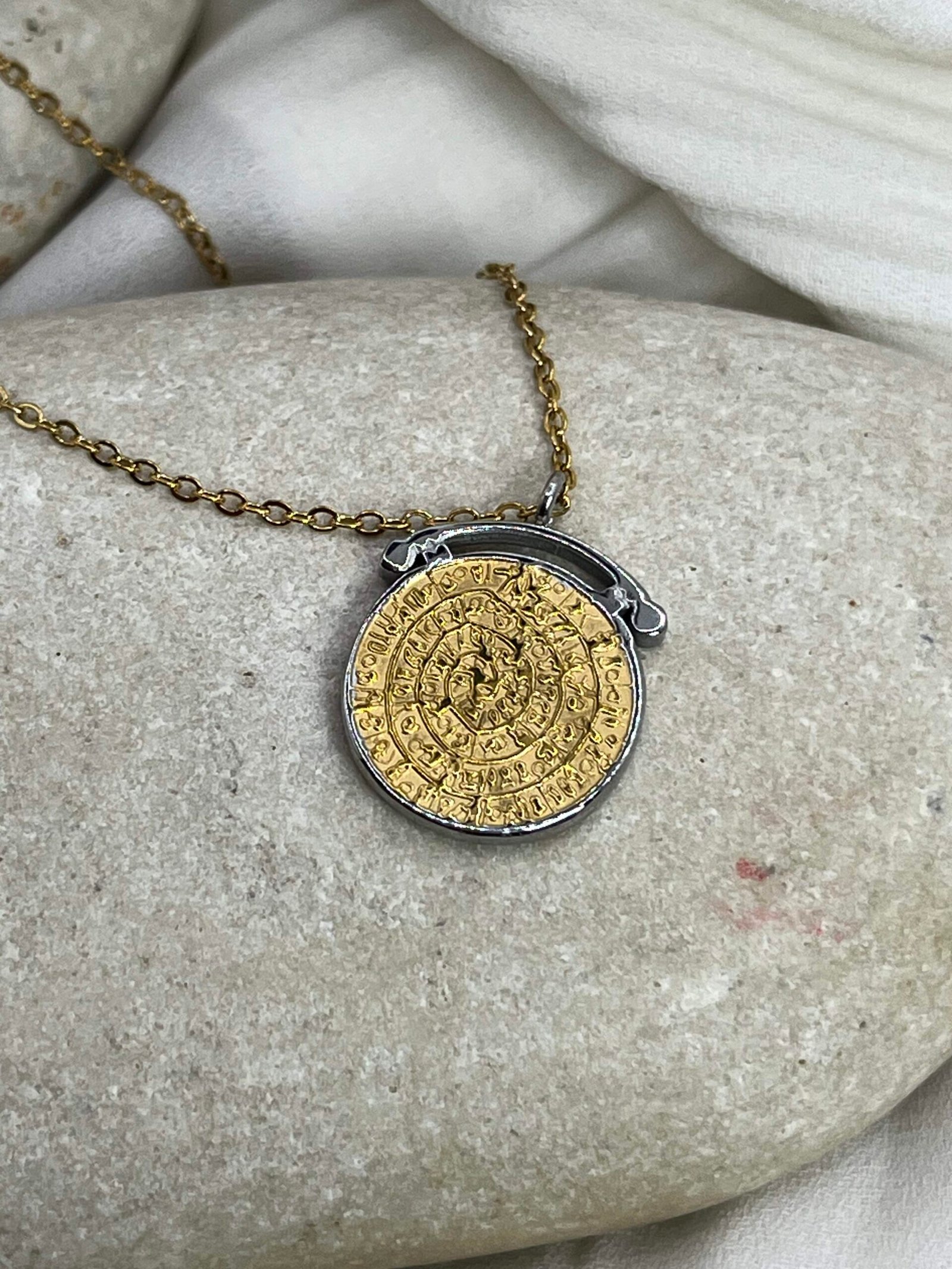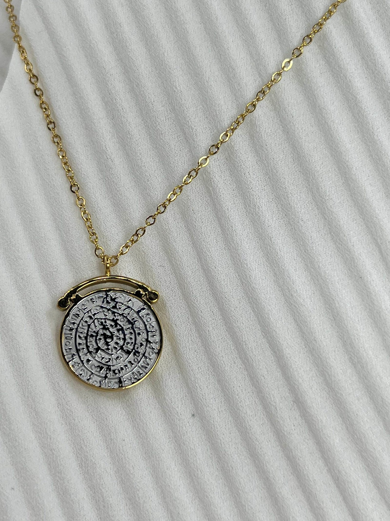 Ατσάλινο κολιέ με τελικό στοιχείου το δίσκο της Φαιστού σε 2 αποχρώσεις, με χρυσή αλυσίδα. Διαθέτει προέκταση.