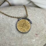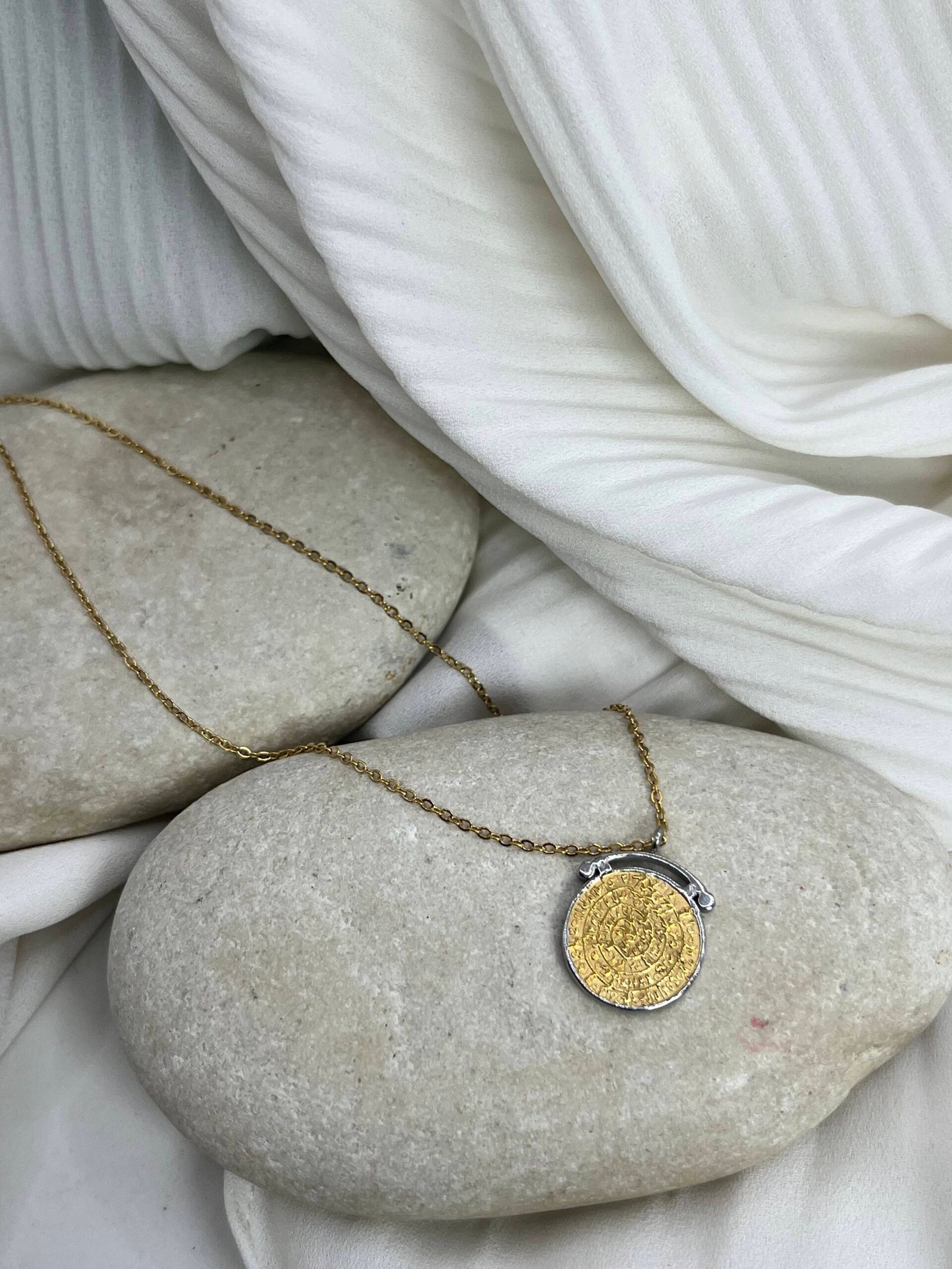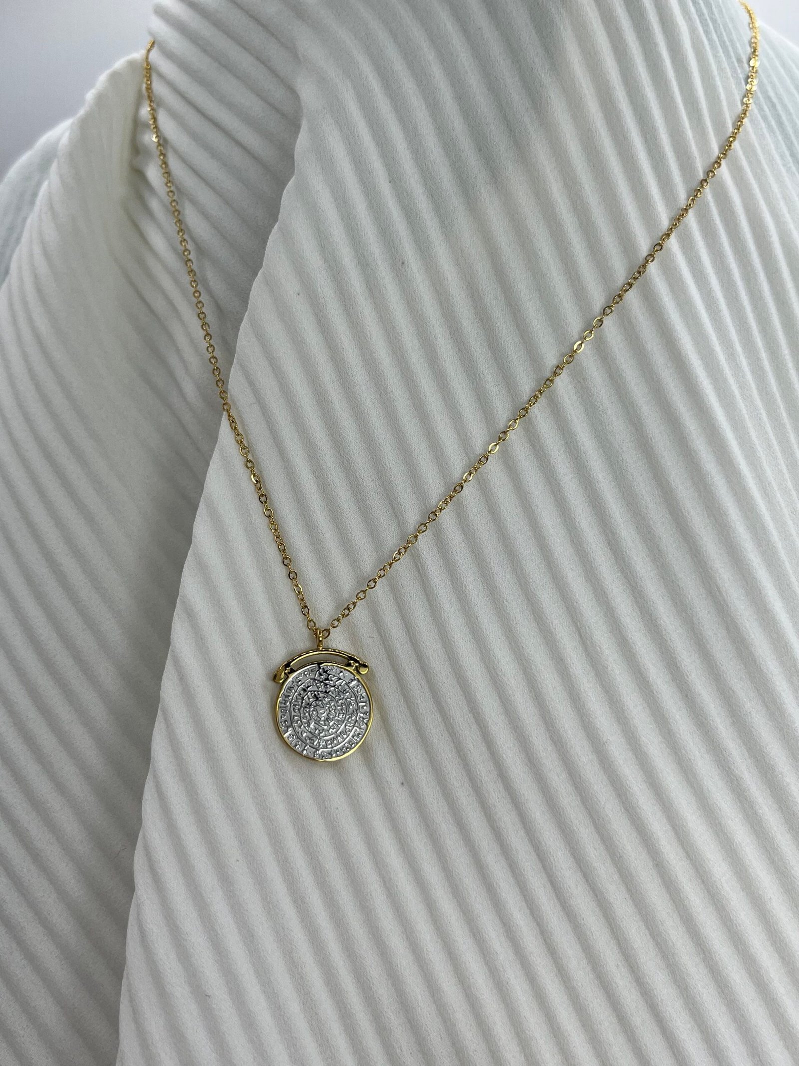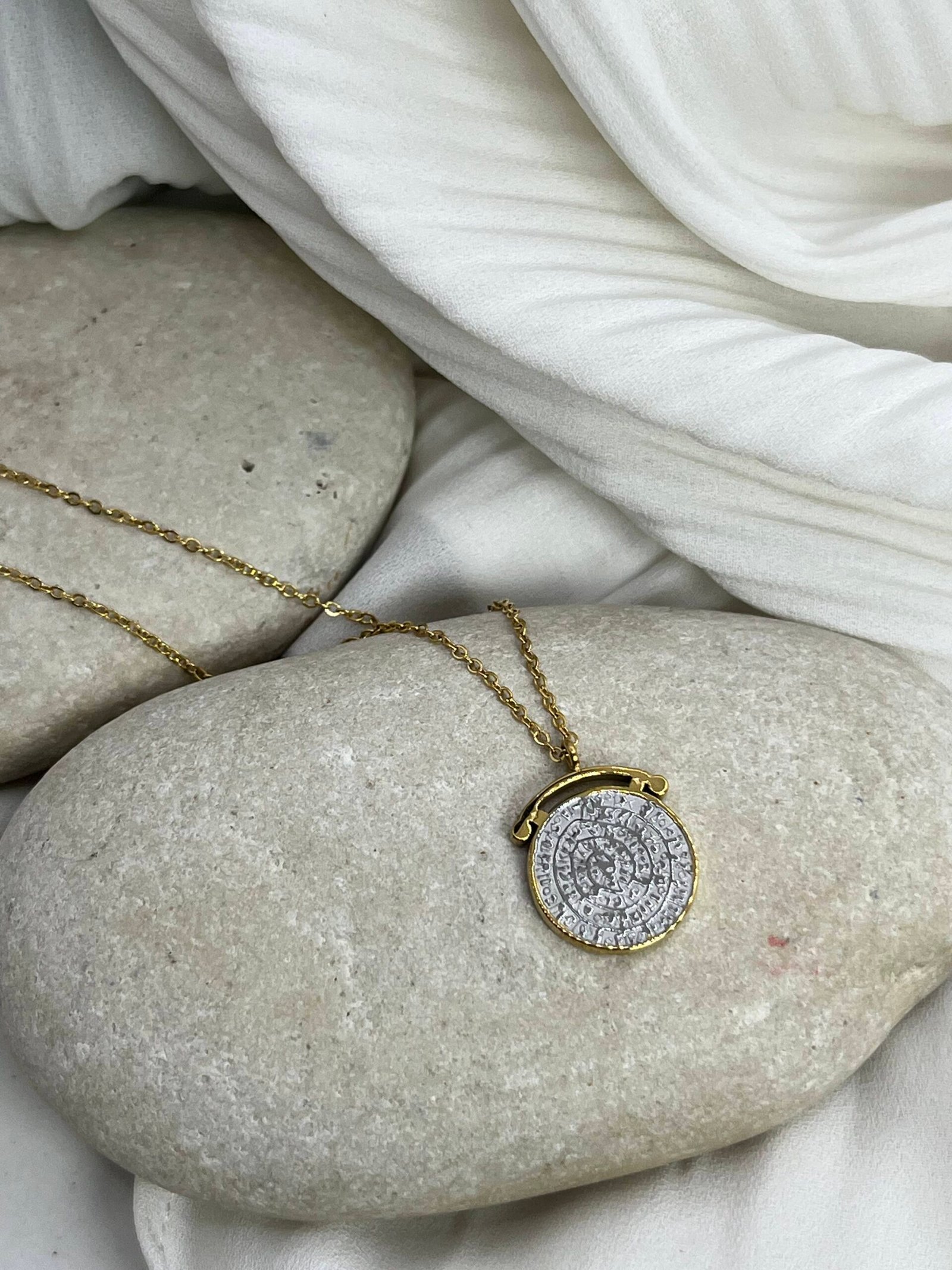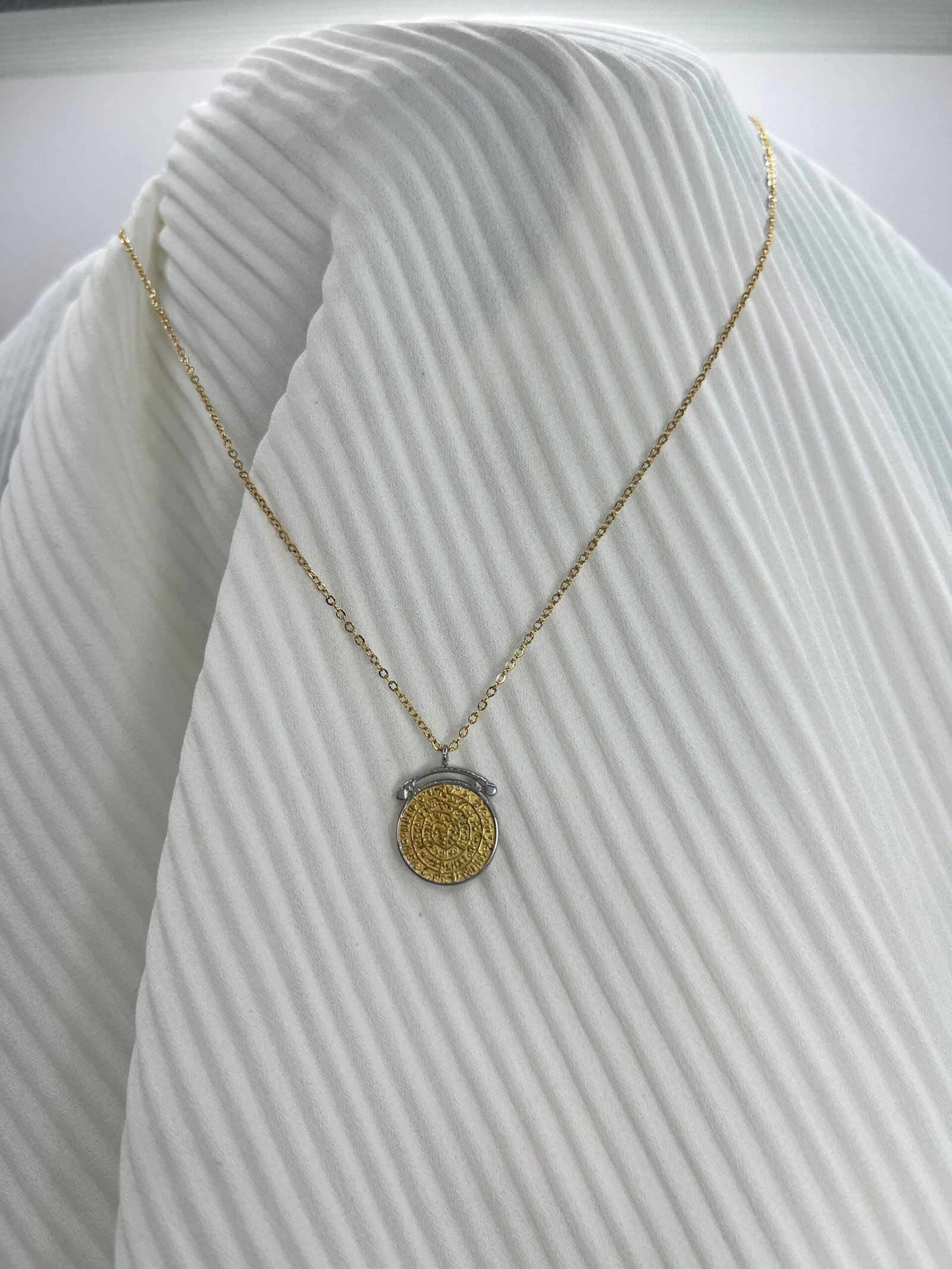 Ατσάλινο κολιέ με τελικό στοιχείου το δίσκο της Φαιστού σε 2 αποχρώσεις, με χρυσή αλυσίδα. Διαθέτει προέκταση.