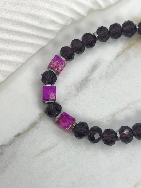 Χάντρες από κρύσταλλο (0,8cm), ατσάλινες ασημί λεπτομέριες και 3 κύβοι αχάτη ματ (0,5cm).