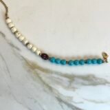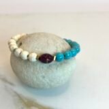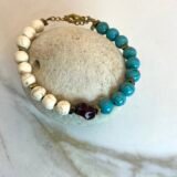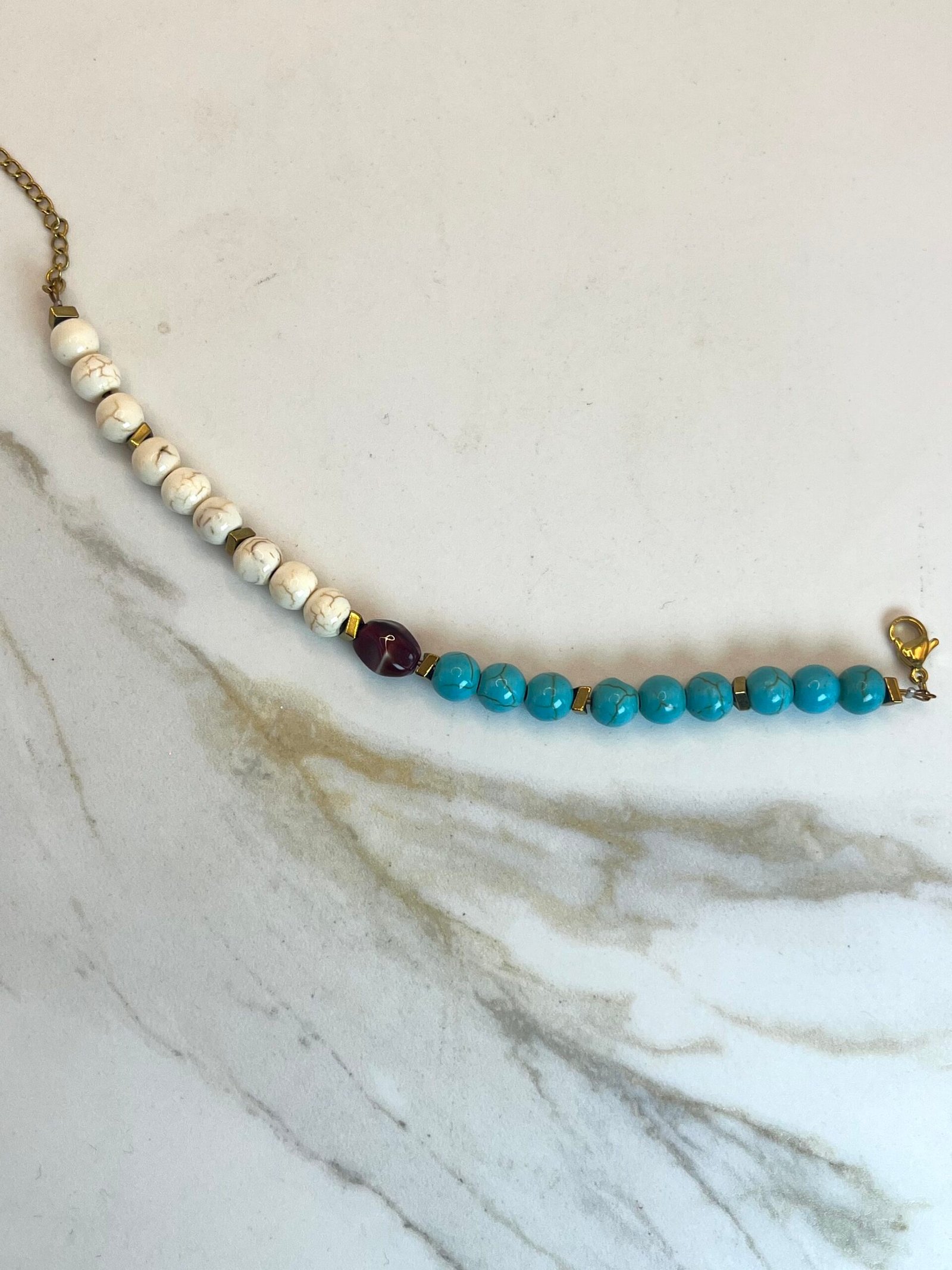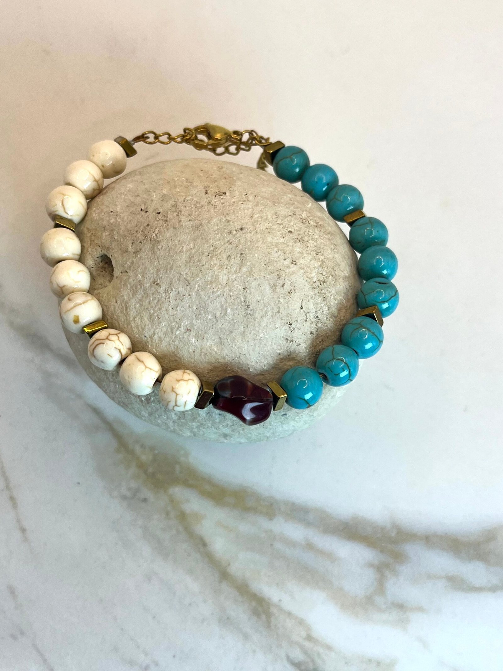 Βραχιόλι με πέτρες λευκού και βεραμάν χαολίτη, χρυσές διαχωριστικές λεπτομέριες από ατσάλι και κεντρικό στοιχείο βυσσινή πορσελάνη. Διαθέτη προέκταση.
