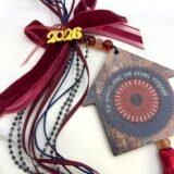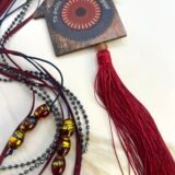 Ξύλινο σπίτι με μάτι (9x9cm) με φούντα 12cm , στολισμένο με κορδέλες σατέν, γυάλινες χάντρες, φιόγκος από βελούδο και σατέν οργάντζα.
