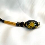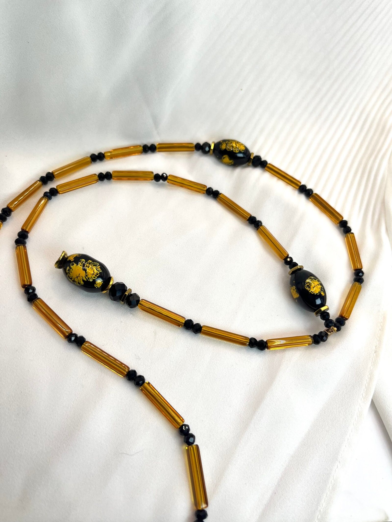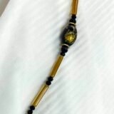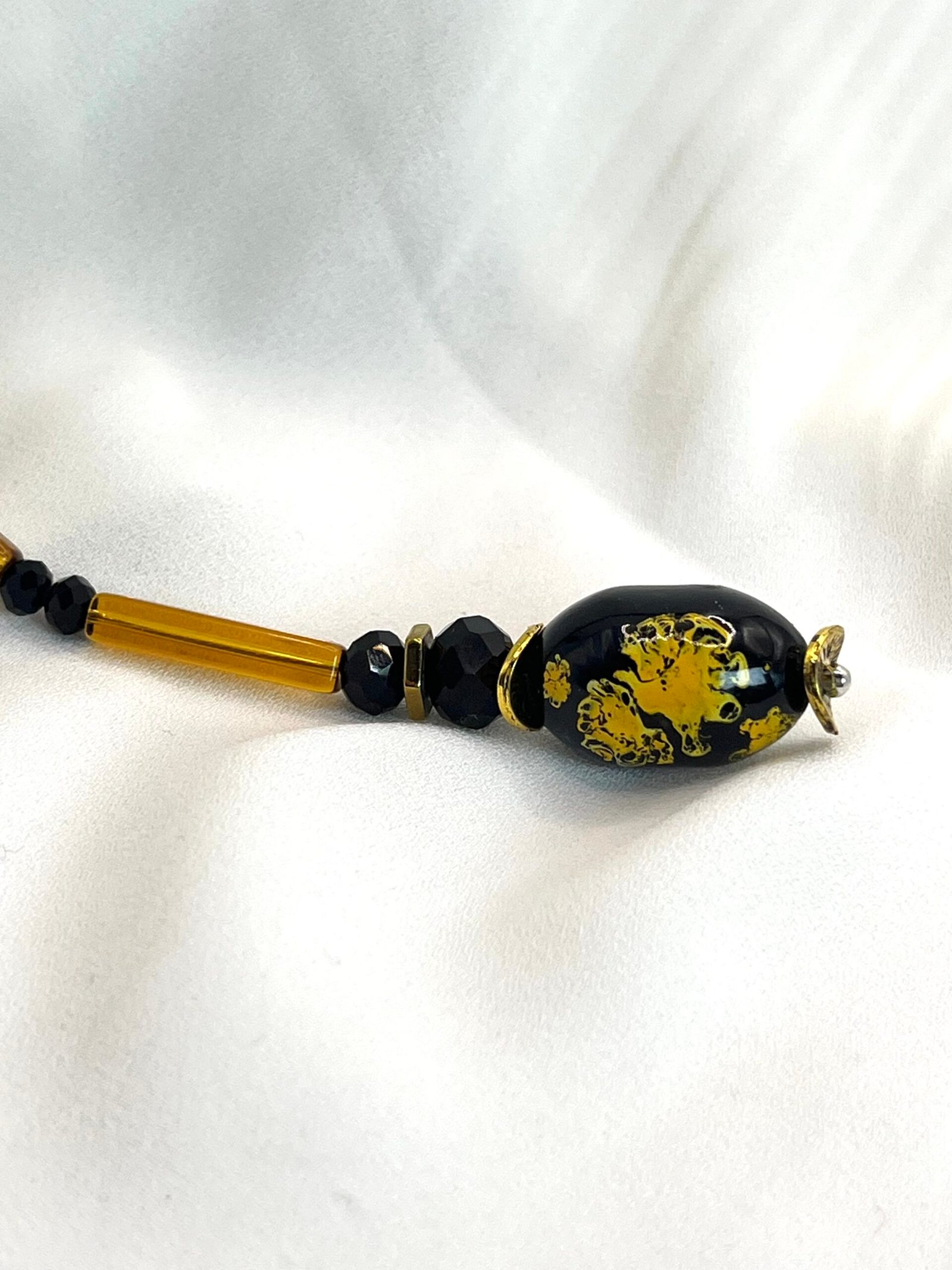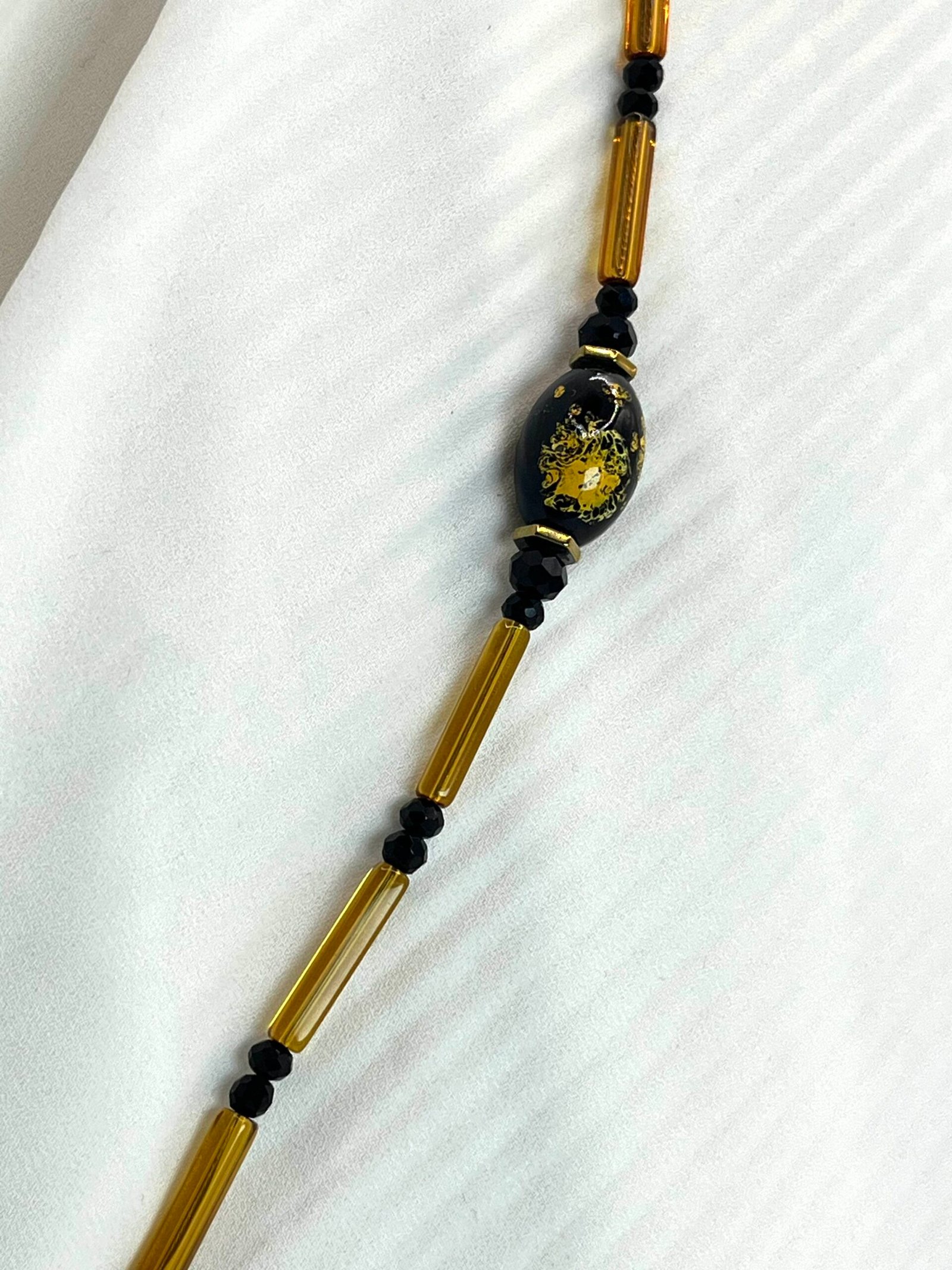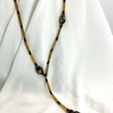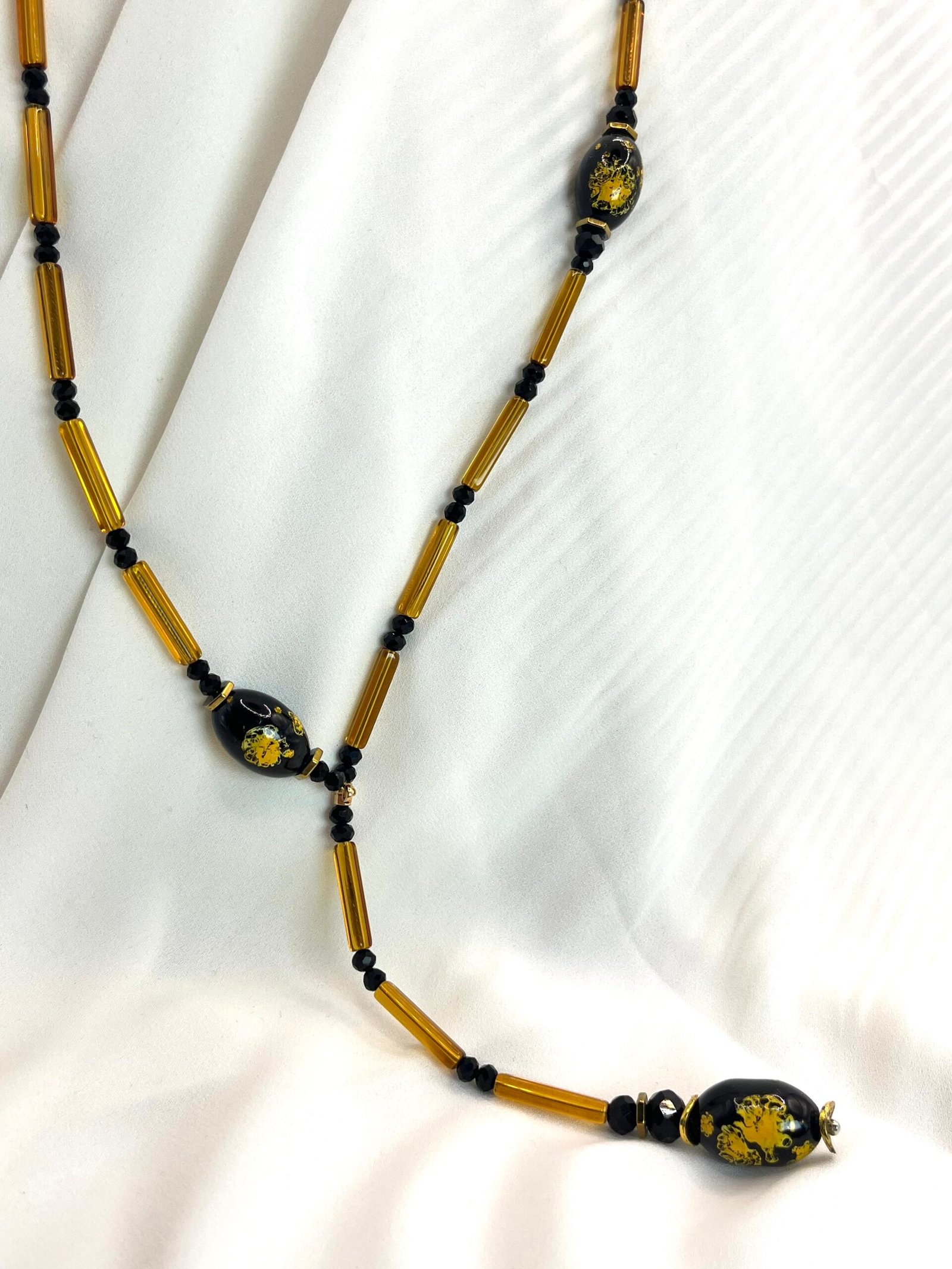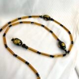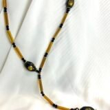 Μακρύ κολίε σε σχήμα V από μάυρες κρυστάλλινες χάντρες (0,4cm) και μελί κρυστάλλινα τουβλάκια (2×0,4cm), ατσάλινες διαχωριστικές λεπρομέριες και κεντρικό στοιχείο από πορσελάνη (2×1,2cm). Οι διαστάσεις του είναι 37cm από κάθε πλευρά και 12cm η “γραβάτα” στο τελείωμα.