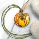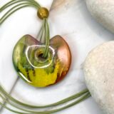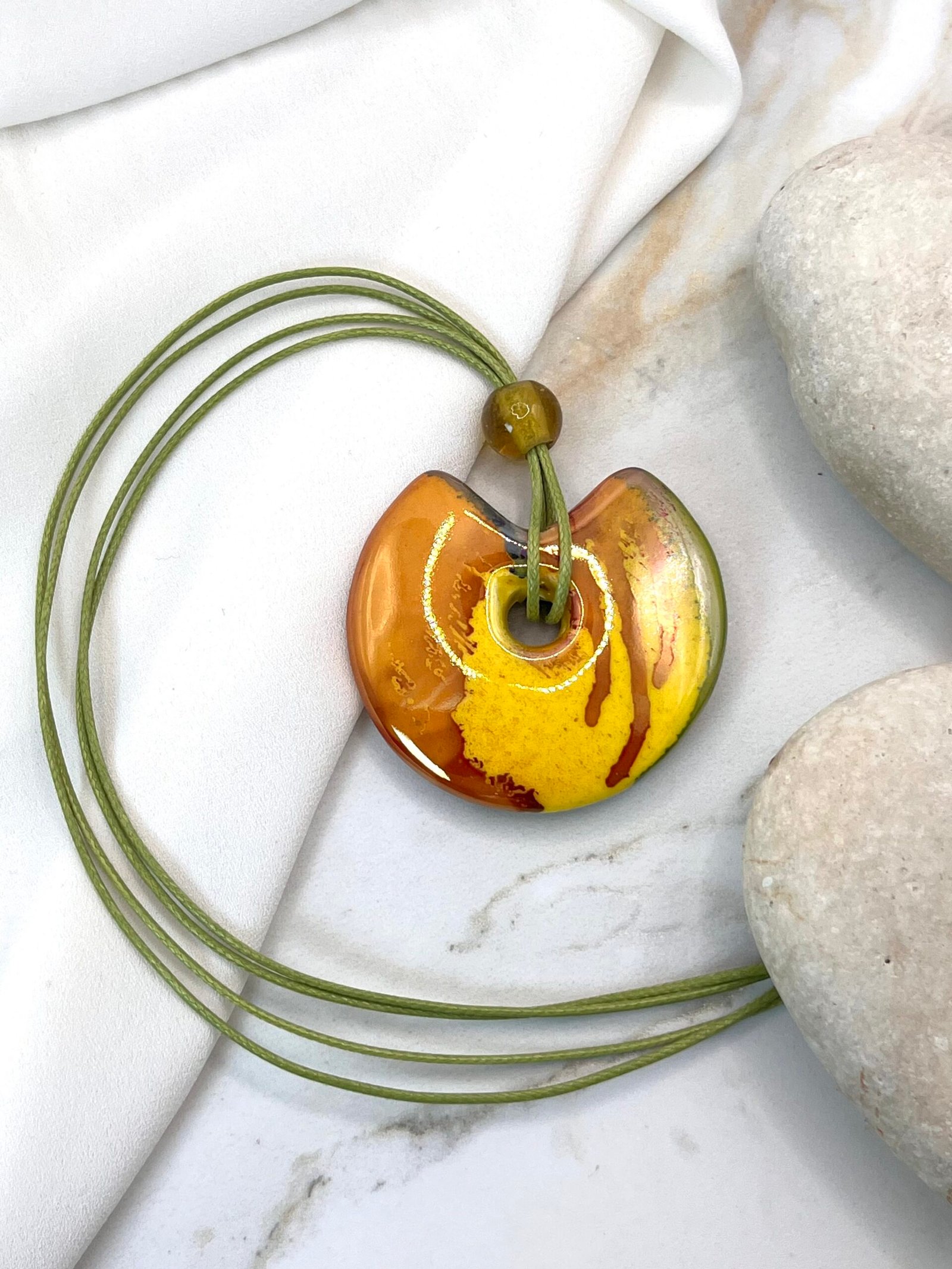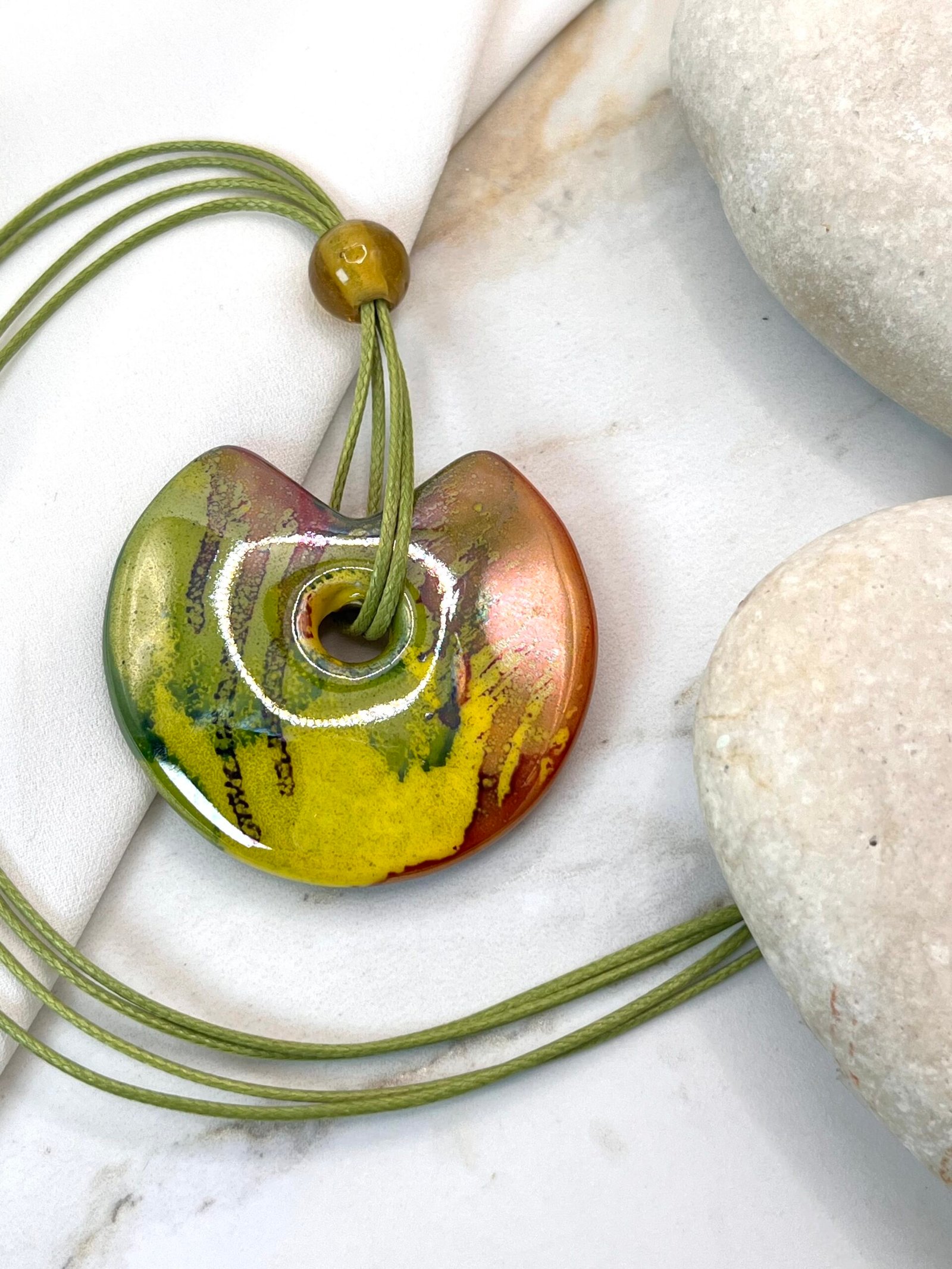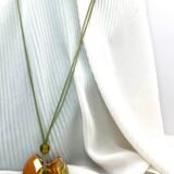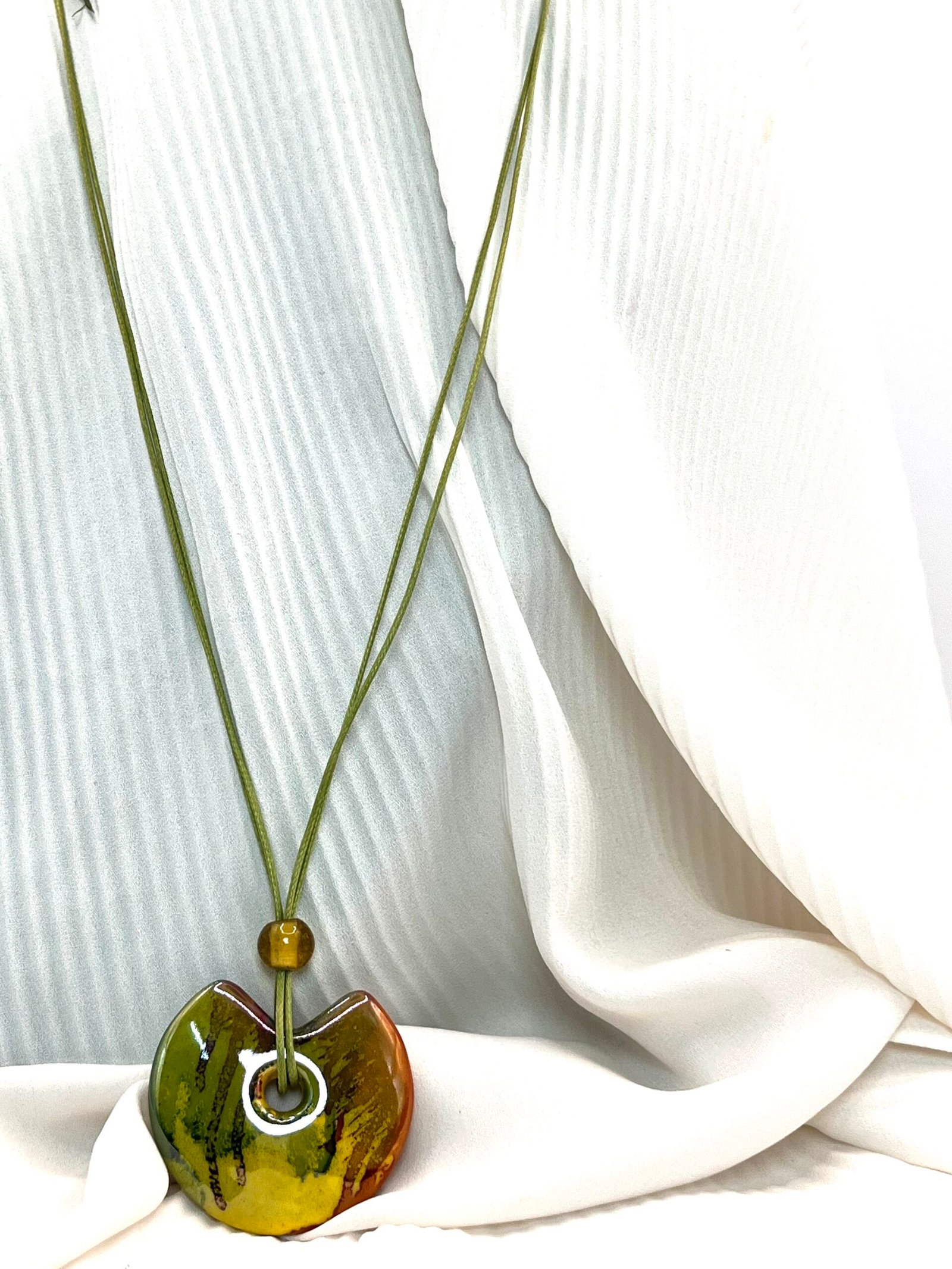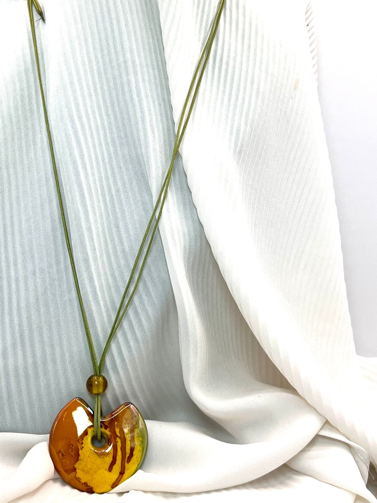Μακρύ κολιέ που αυξομειώνεται με πράσινο γορδόνι και στρόγγυλή πέτρα πορσελάνης με ιδιαίτερο χρώμα δύο όψεων (5cm)