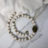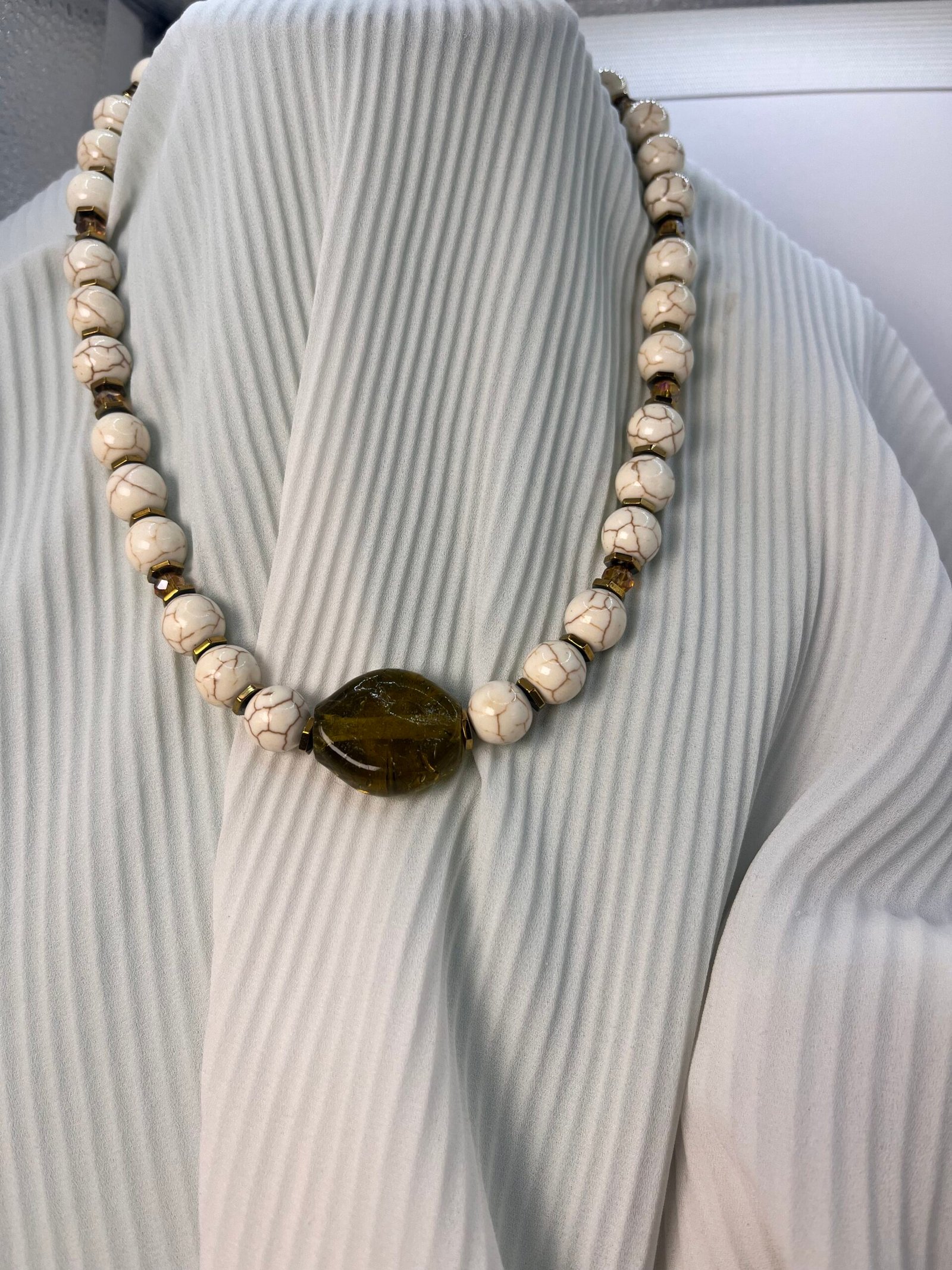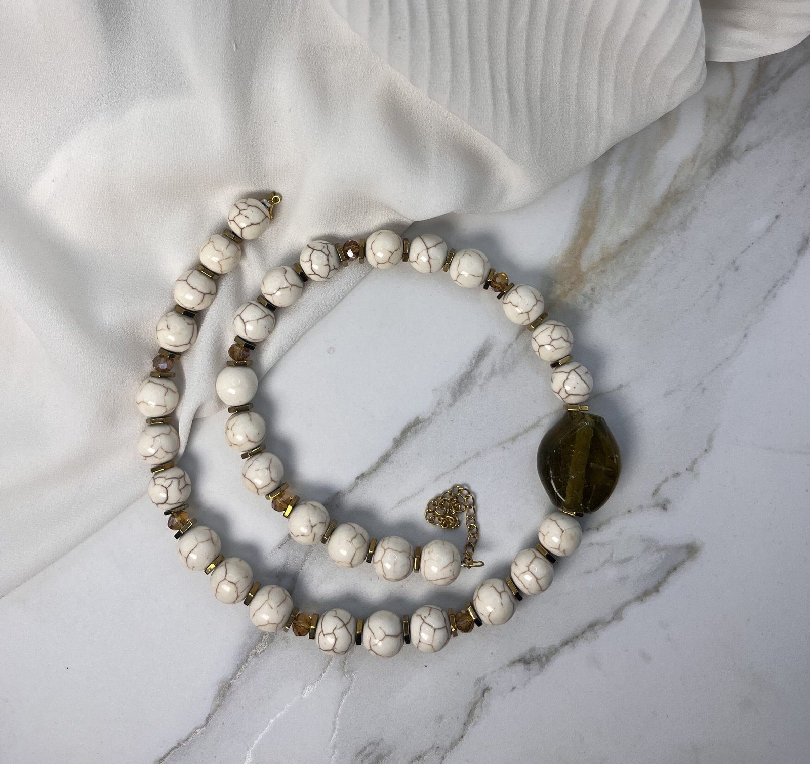 Παραμυθένιο κολιέ μεσαίου μήκους, με απόλυτα αρμονικές συνθέσεις. Αποτελείται από λευκές πέτρες χαολίτη (1cm) , κρύσταλλο (0,60cm) και ατσάλινες λεπτομέρειες σε χρύσή απόχρωση ανάμεσα στα κρύσταλλα. Το κεντρικό στοιχείο είναι και αυτό κρύσταλλο κρακελέ (2,5x2cm).