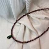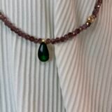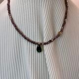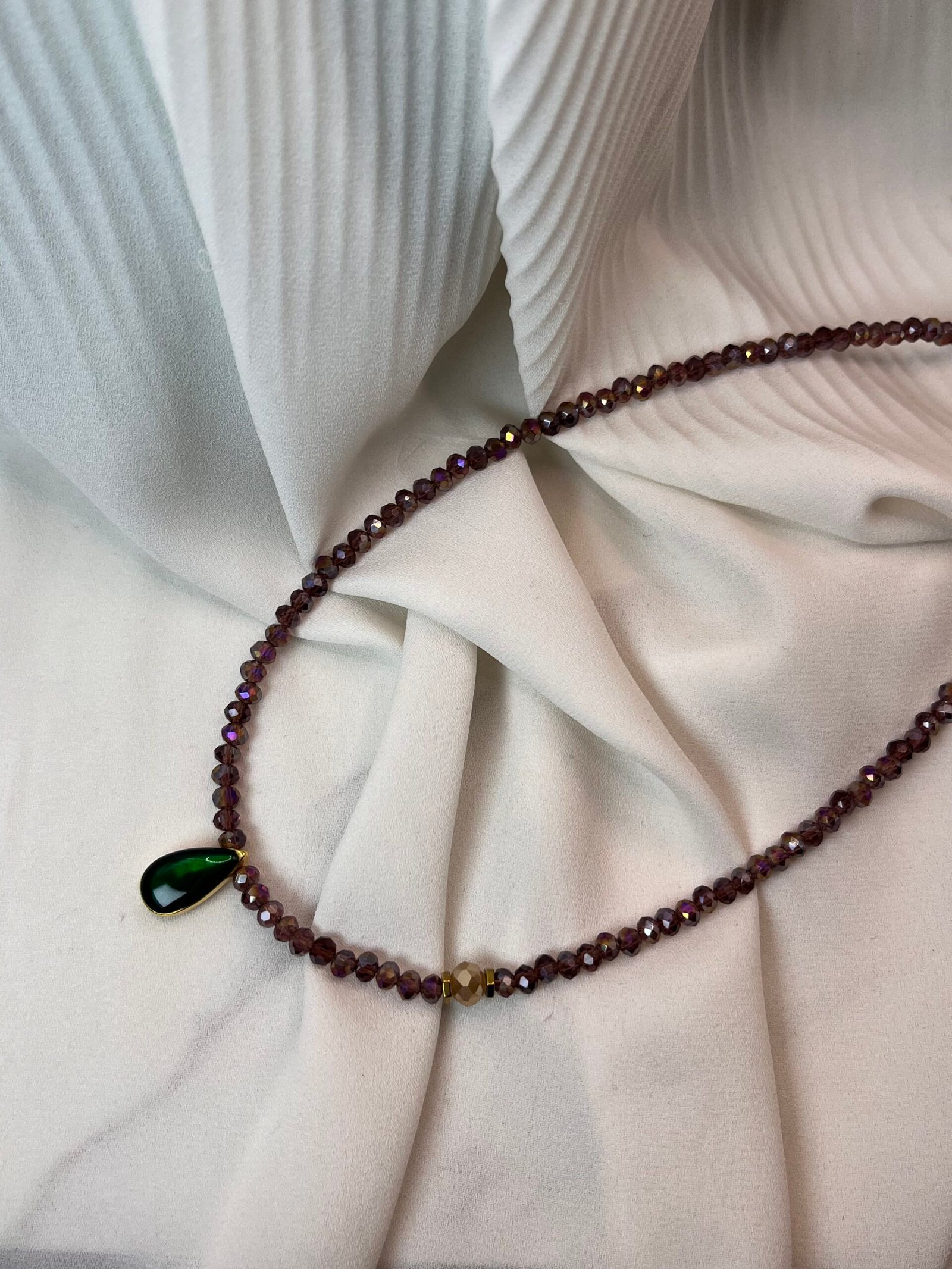 Κοντό κολιέ με μικρές μωβ κρυστάλλινες χάντρες (0,4cm) και κεντρικό επίχρυσο στοιχείο σε σμαραγδί χρώμα.