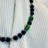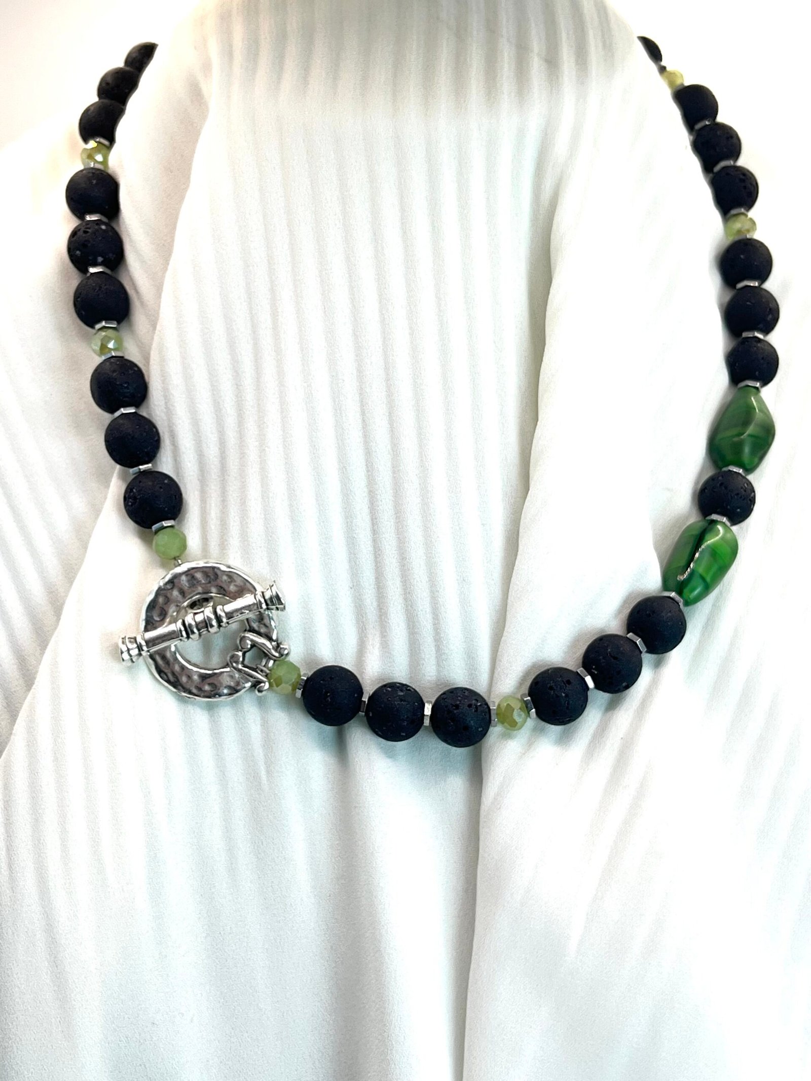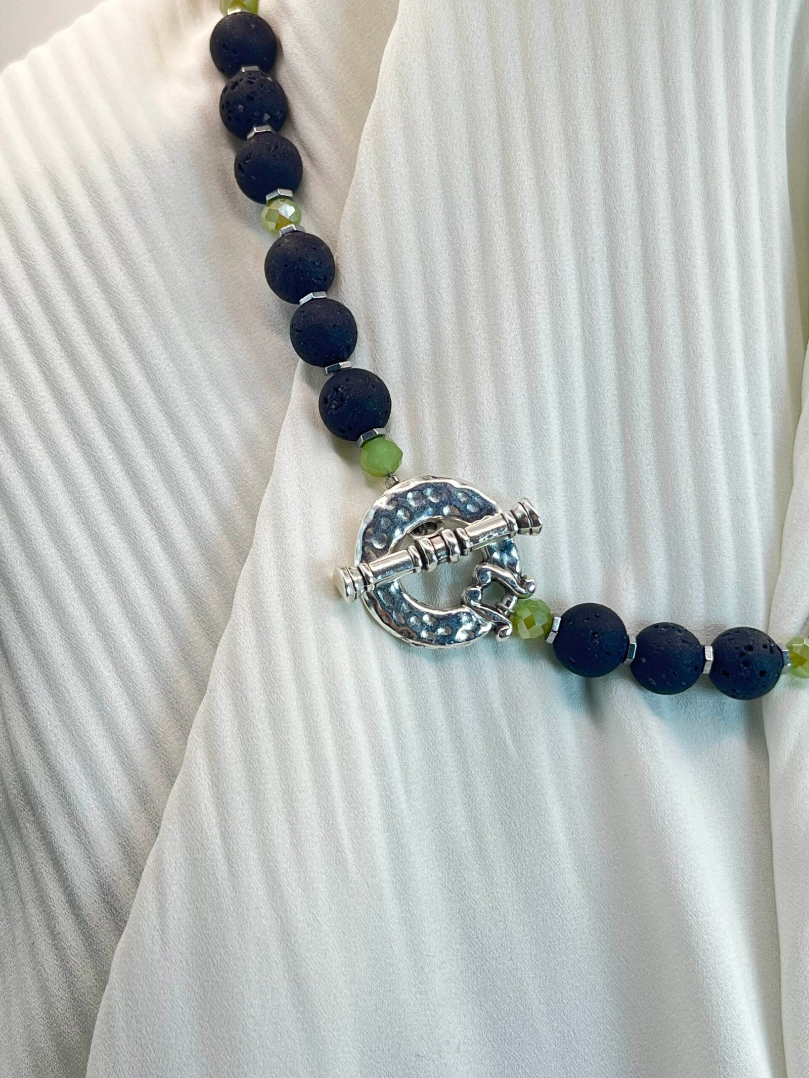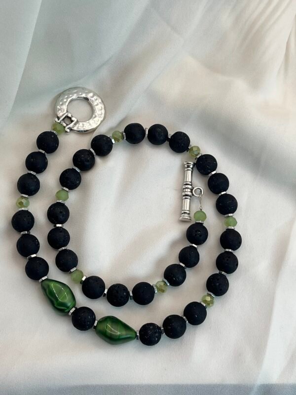 Κολιέ μεσαίου μήκους με κύριο στοιχείο την υφαιστειακή λάβα (1cm) σε μαύρο χρώμα, ασημί διαχωριστικά στοιχεία από ανοξείδωτο ατσάλι, χάντρες κρύσταλλο (0,4cm) , κούμπωμα τύπου Τ και κεντρικό στοιχείο δάκρυ (1,8x1cm).