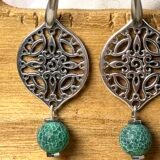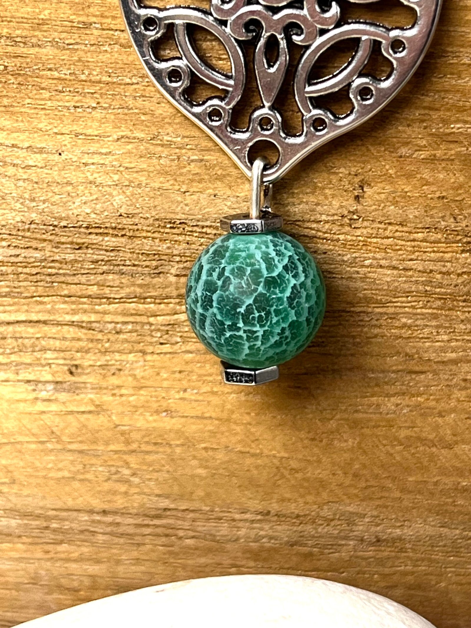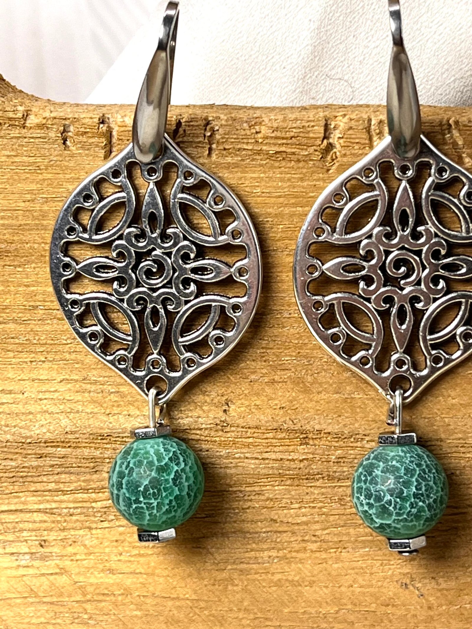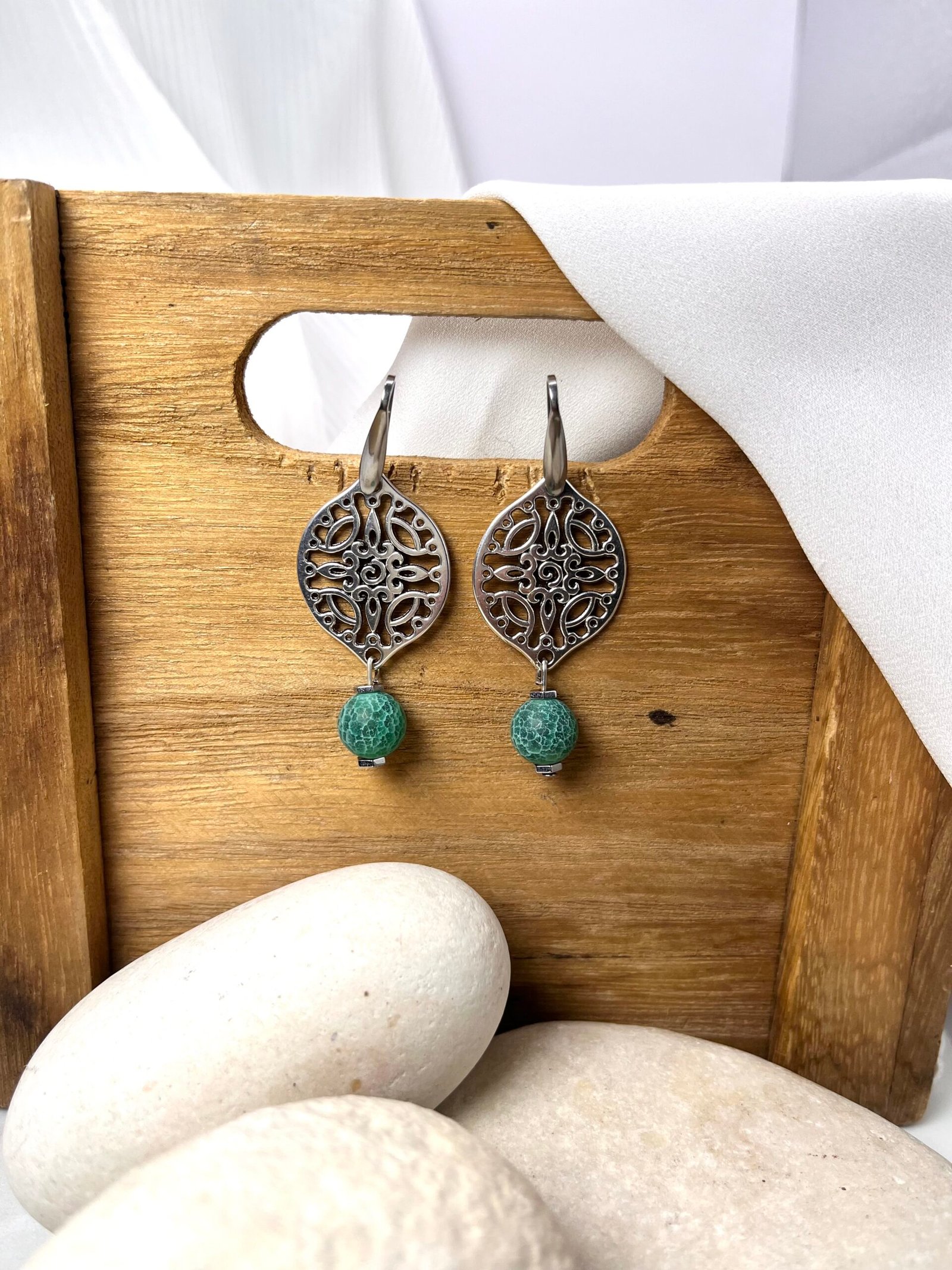 Κρεμαστό σκουλαρίκι με στρογγυλό επάργυρο στοιχείο, ιδιαίτερη ύφανση στο εσωτερικό και πέτρα με αχάτη σε πράσινο χρώμα. Ο γάντζος είναι από ανοξείδωτο ατσάλι.
