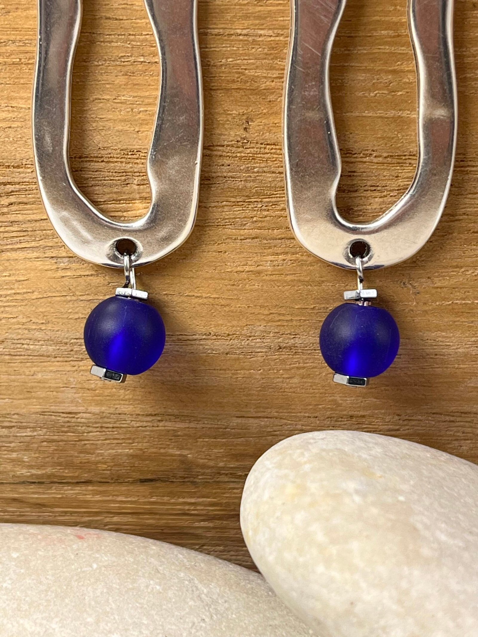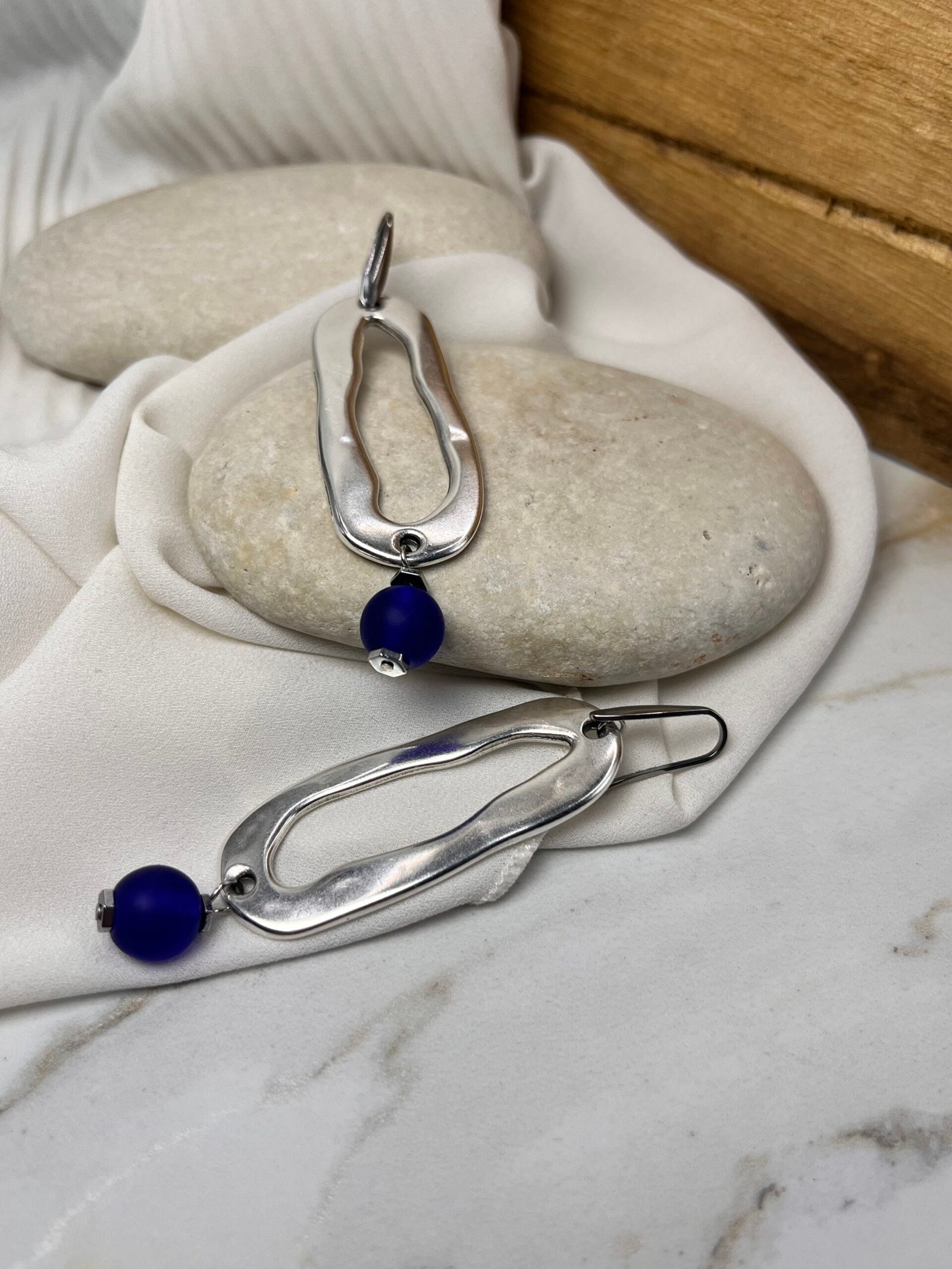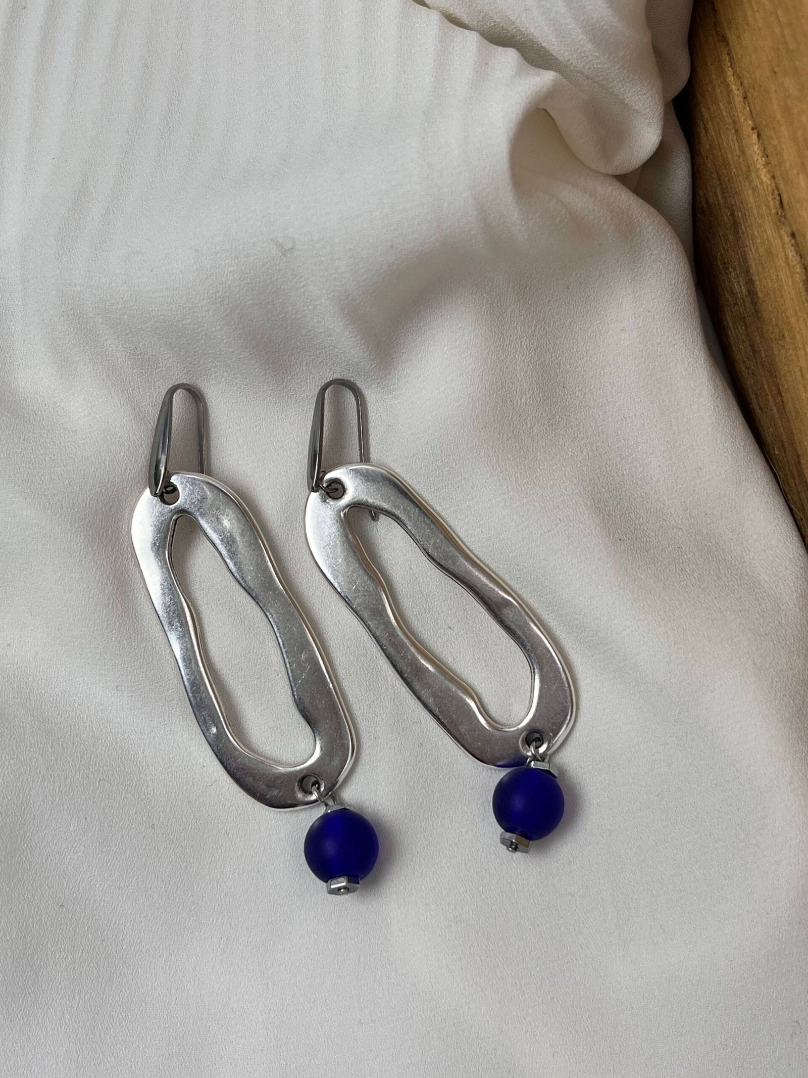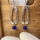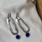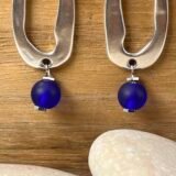 Μακρύ κρεμαστό σκουλαρίκι, επάργυρο με κρυστάλλινη ματ χάντρα,μπλε. Ο γάντζος είναι ατσάλινος.