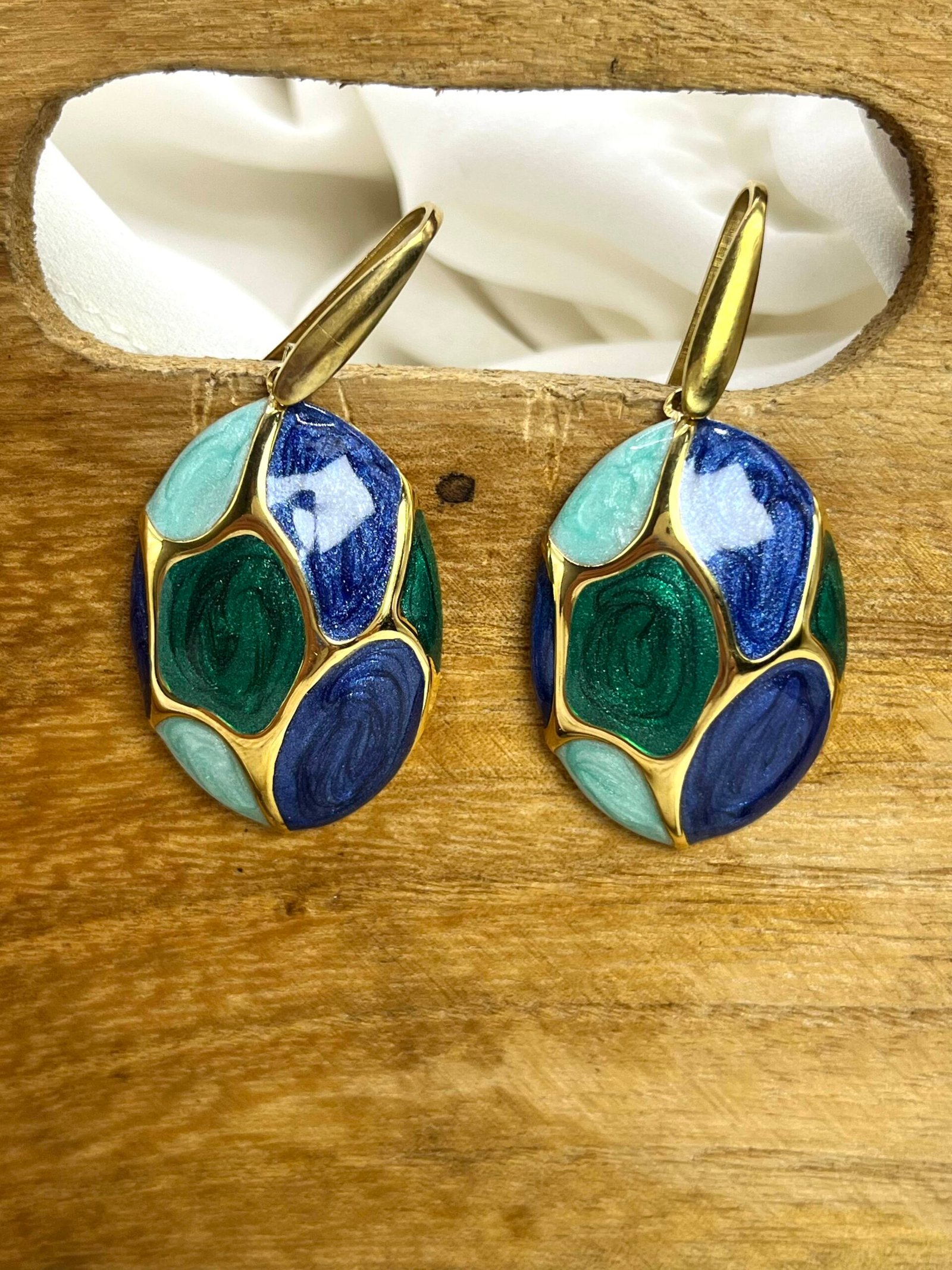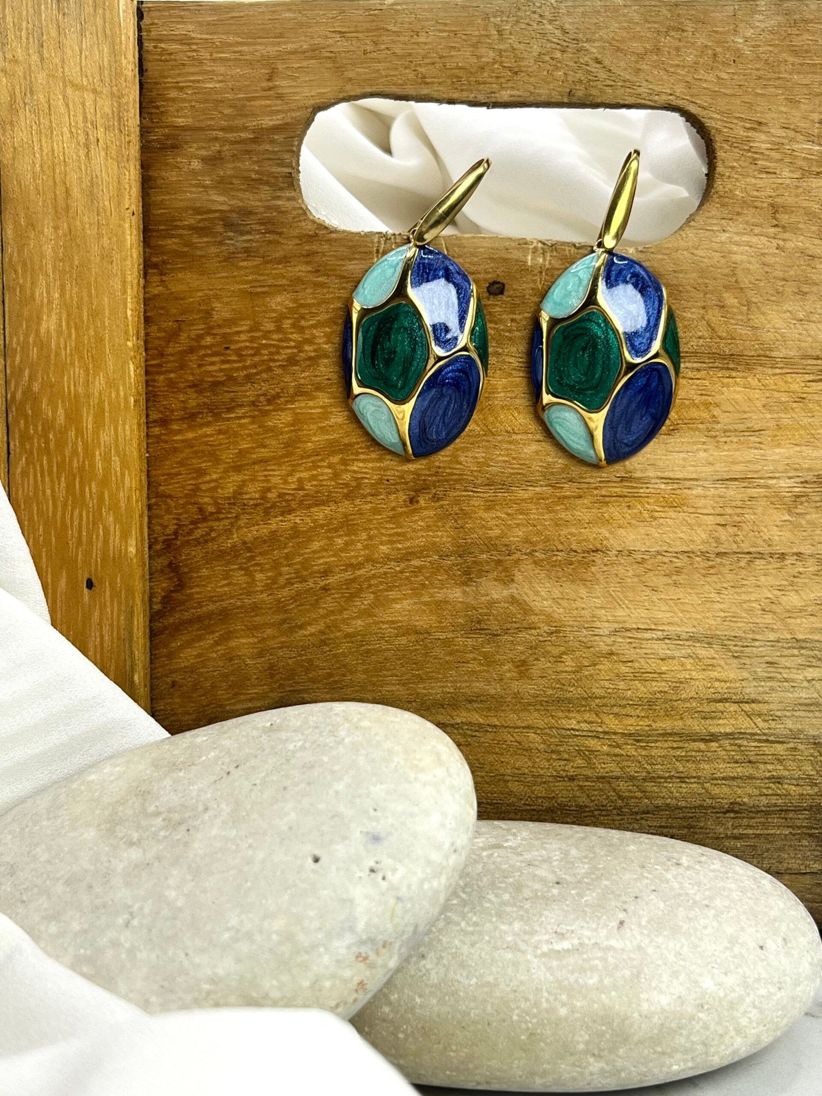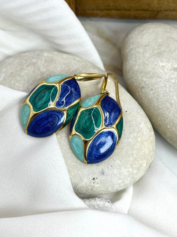 Κρεμαστό σκουλαρίκι, σε σχήμα μισού αυγού, με σμάλτο σε αποχρώσεις μπλε και πράσινο. Ο γάντζος είναι ατσάλινος.