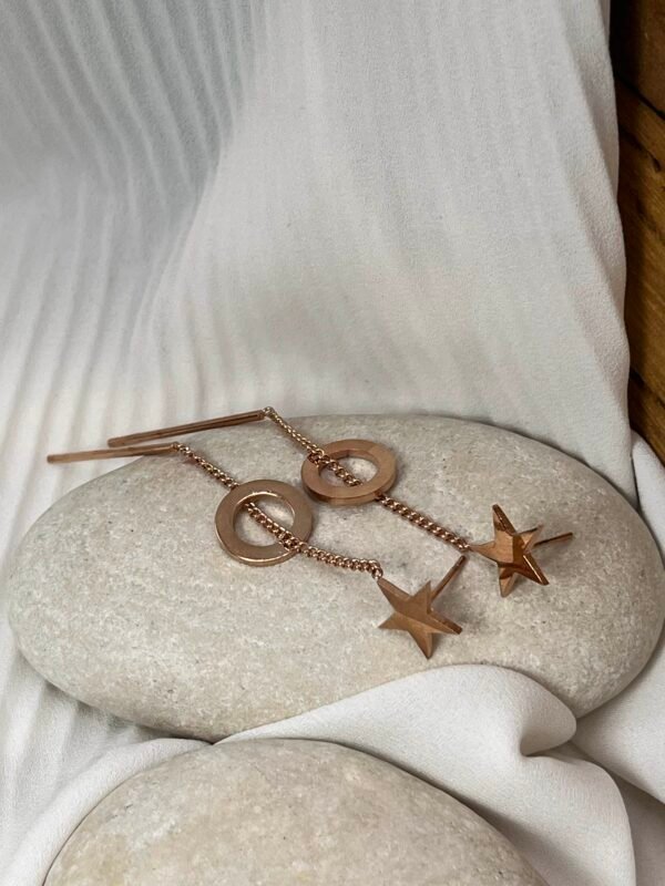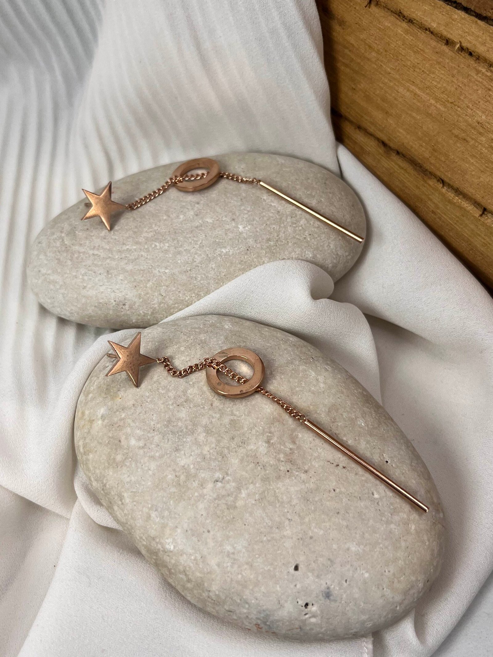 Καρφωτό σκουλαρίκι μακρύ με αλυσίδα, σε χρώμα ροζ χρυσό, από ανοξείδωτο ατσάλι.